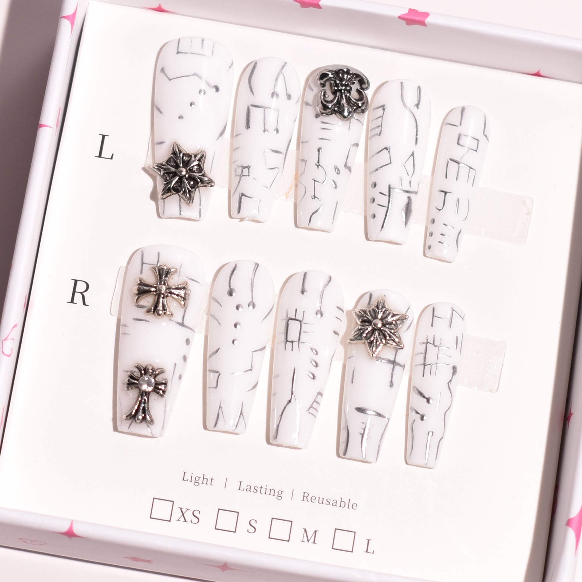 Relic Syntax is a long coffin press-on nail set inspired by symbolic markings and sculptural metal details. A crisp milky-white base serves as a clean canvas, layered with fine hand-drawn linear markings that evoke coded scripts and abstract symbols. The long coffin shape enhances the structured aesthetic, delivering a bold silhouette that feels intentional and editorial.