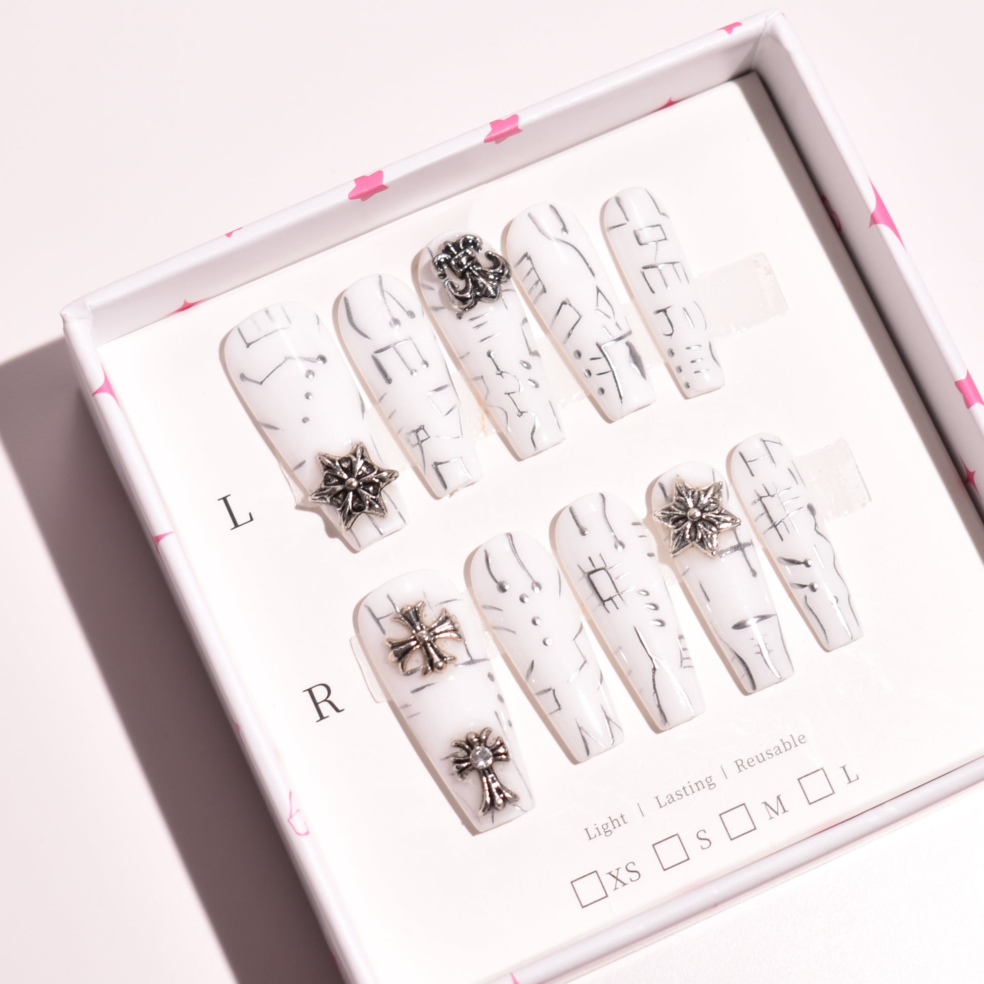 Handmade, lightweight, and reusable, Relic Syntax is ideal for customers searching for long coffin press-on nails, white gothic nail designs, minimalist statement nails, or press-ons with symbolic metal accents. Perfect for night styling, alternative fashion looks, or anyone drawn to clean designs with ritual and architectural influence.