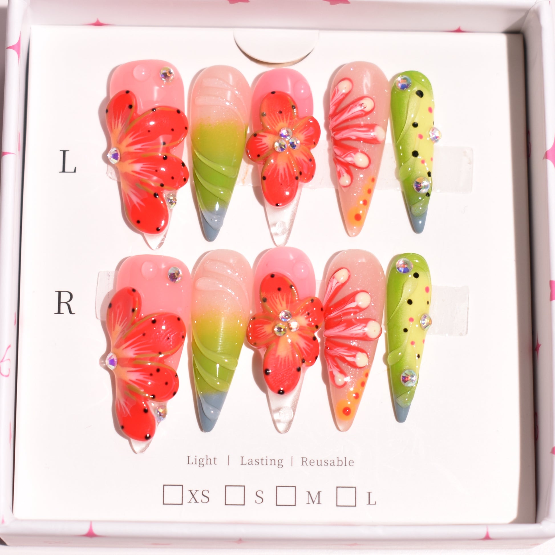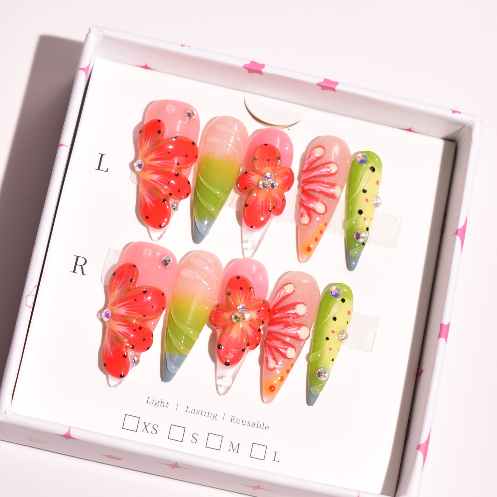 Guava Heat is a long stiletto press-on nail set inspired by tropical color saturation and sculptural floral detail. Warm coral pinks, juicy red florals, and fresh lime-green accents blend into soft gradients, creating a vibrant yet balanced palette. The elongated stiletto shape sharpens the look, giving the playful colors a bold, fashion-forward edge.