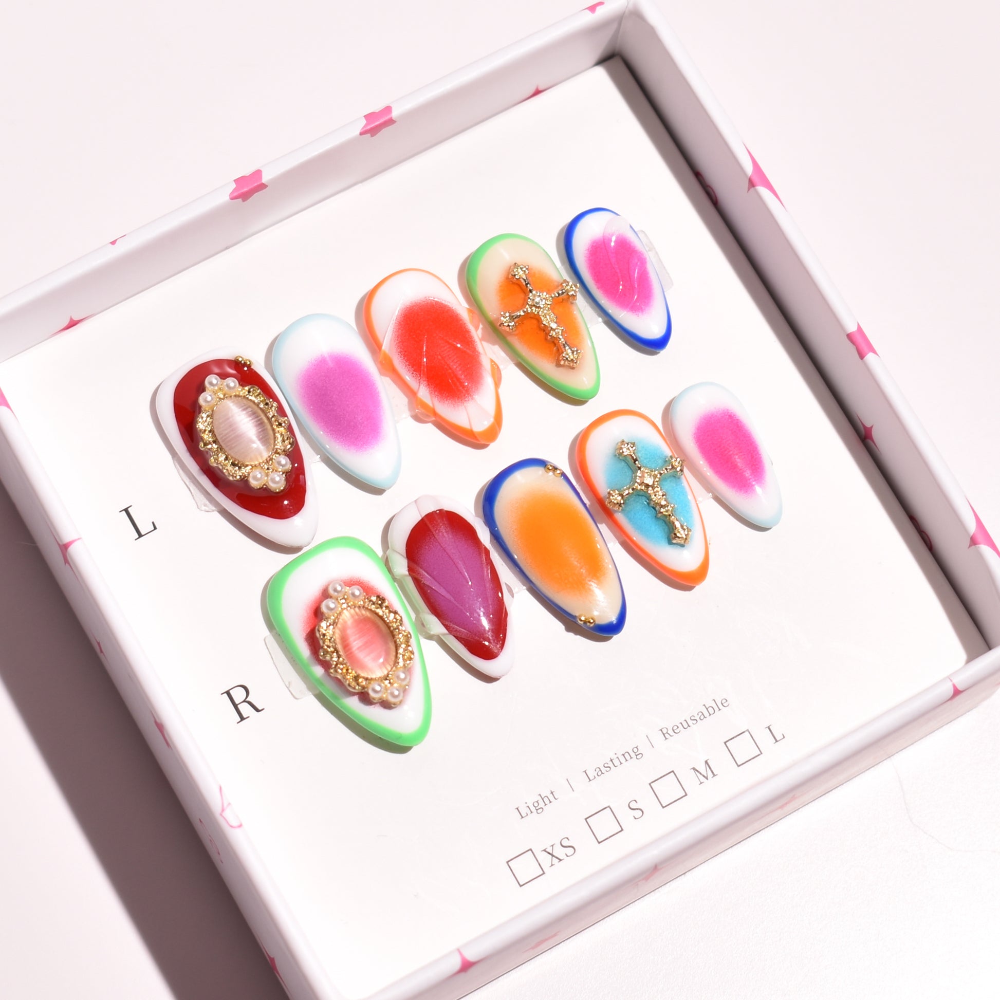 - Blings are available in XS, S, and M & L perfectly fitting different nail sizes and shapes.