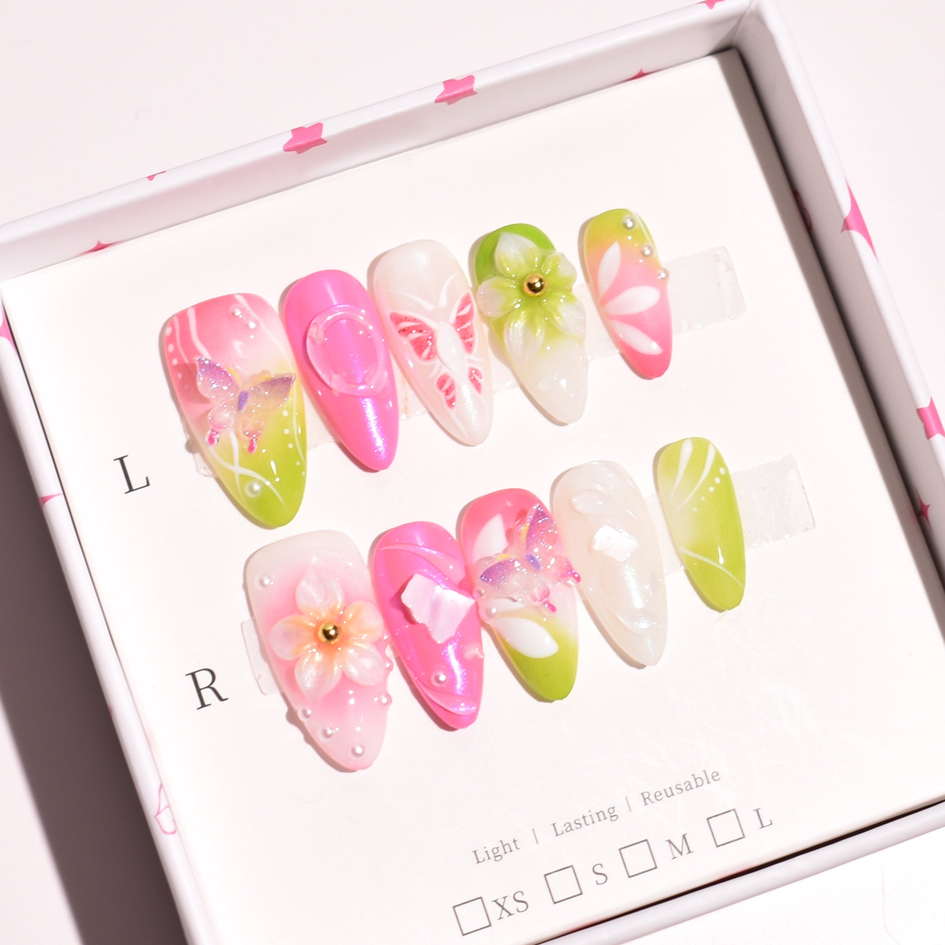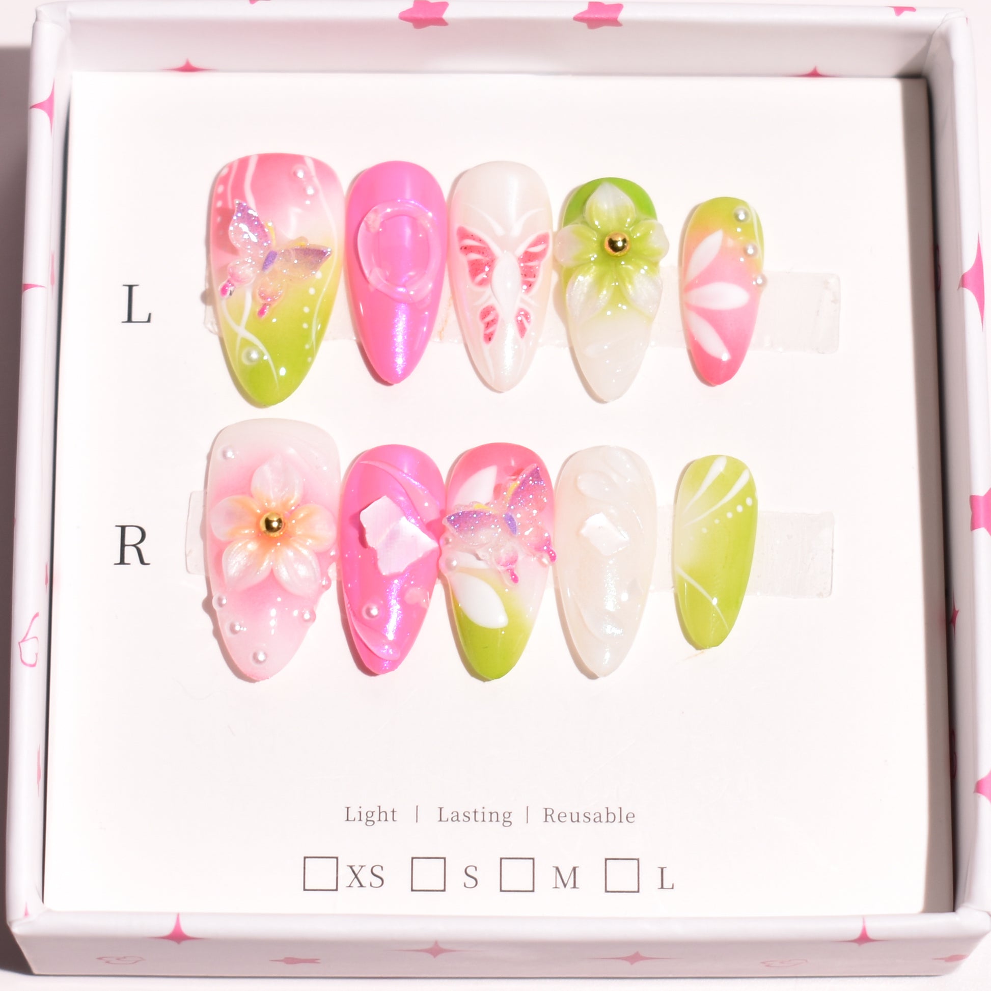 Hand-sculpted butterfly accents, translucent floral appliqués, and pearl embellishments add dimension and movement to the design. Subtle shimmer finishes and fine white detailing enhance the dreamy aesthetic, while balanced color placement keeps the set cohesive and refined. Each nail is individually handcrafted for a high-end, boutique finish.