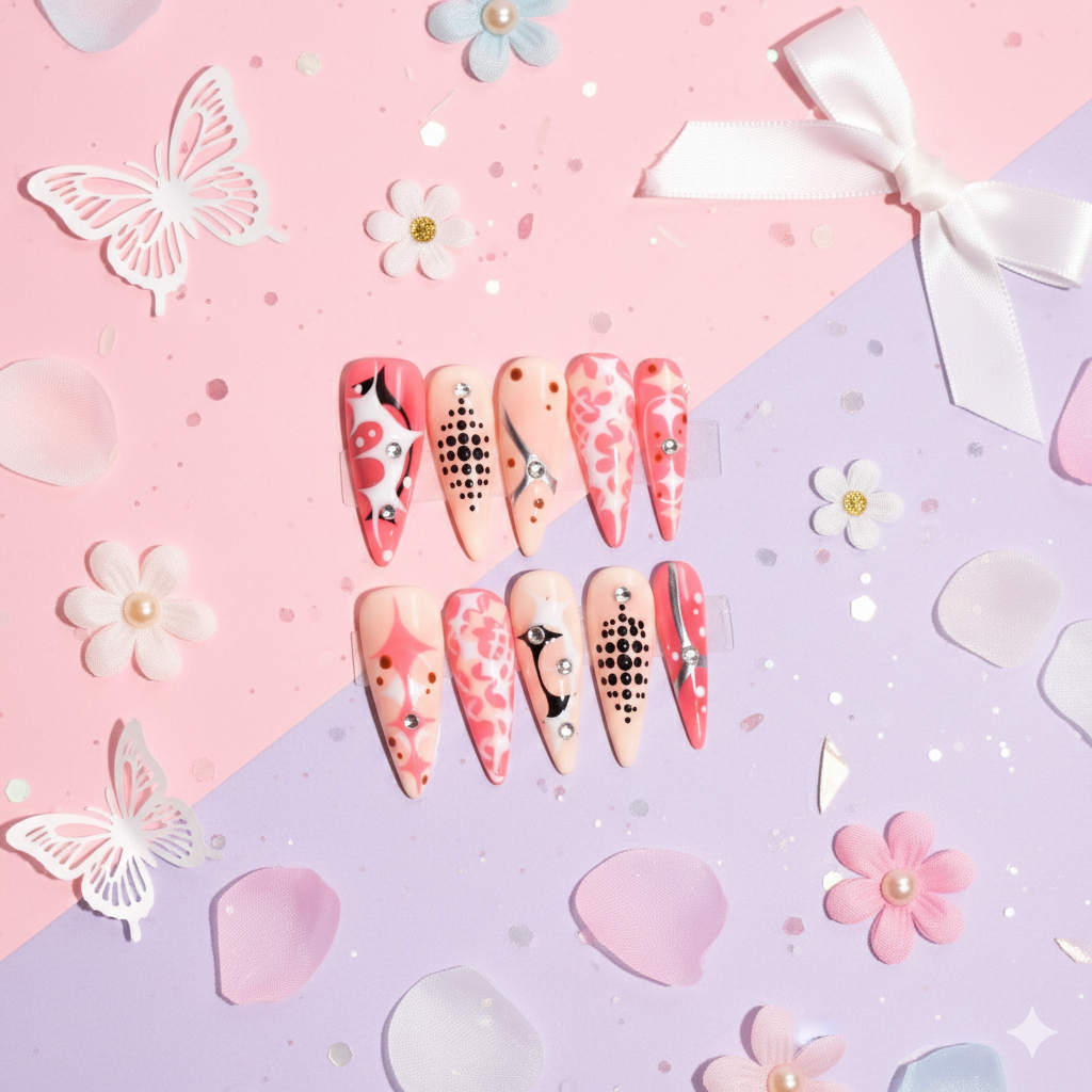 Each nail is hand-painted with abstract patterns—flowing curves, scattered dot clusters, and high-contrast black, white, and silver details. Subtle crystal embellishments add dimension and light-catching highlights without overpowering the design. The result is a polished statement set that feels artistic, editorial, and intentionally expressive.