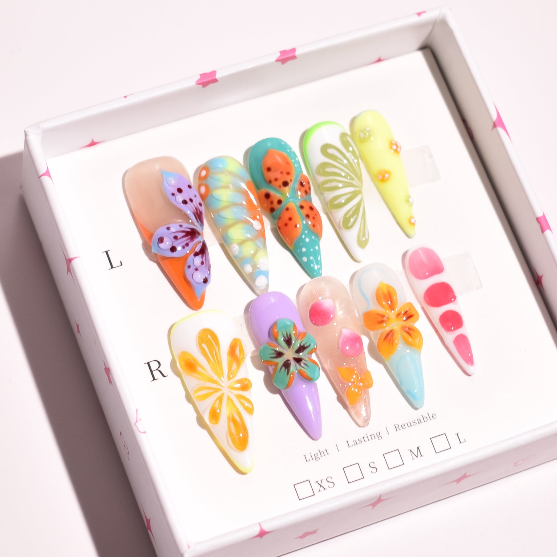Each nail is individually hand-painted using premium gel, showcasing raised flower petals, soft gradients, playful color blocking, and glossy dimensional accents. The combination of teal, orange, lemon yellow, lilac, blush, and coral creates a joyful yet fashion-forward palette inspired by modern Y2K and art-core aesthetics. Finished with a high-gloss gel topcoat, every set delivers a salon-quality shine and long-lasting wear.