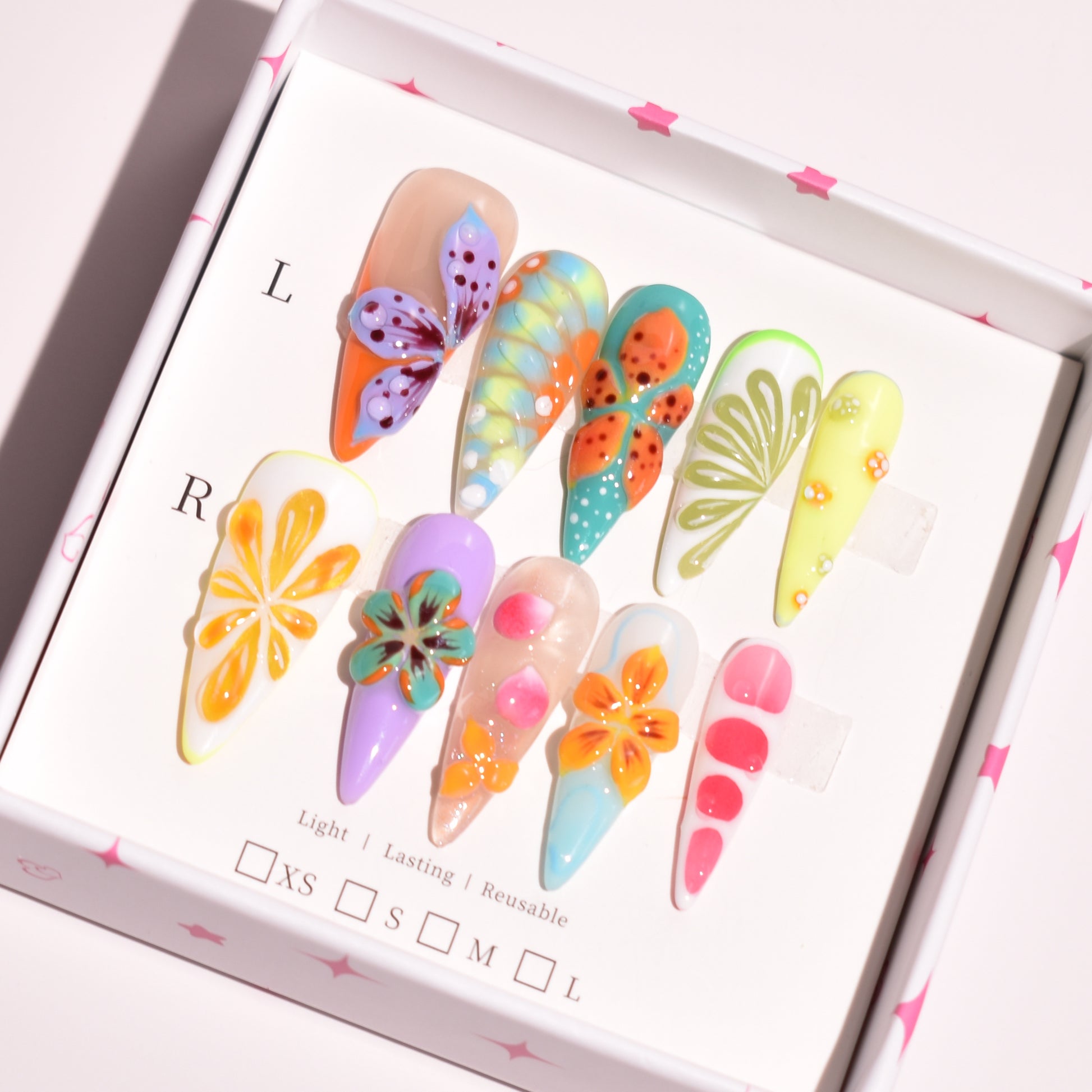 Designed for those who love expressive nail art, Petal Riot is lightweight, reusable, and easy to apply, giving you professional results in minutes. Perfect for festivals, vacations, photo shoots, or everyday bold looks, this long stiletto press-on set is ideal for fans of 3D floral nails, colorful press-on nails, and statement nail designs.