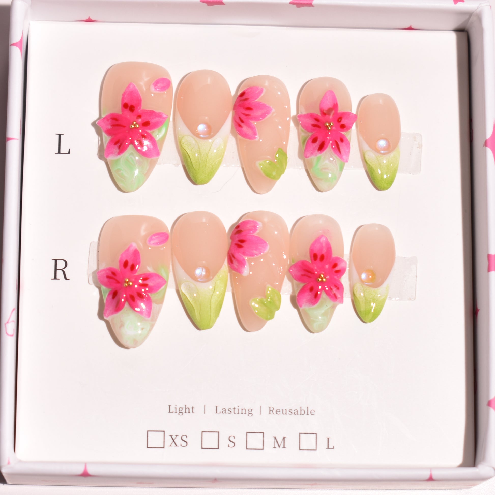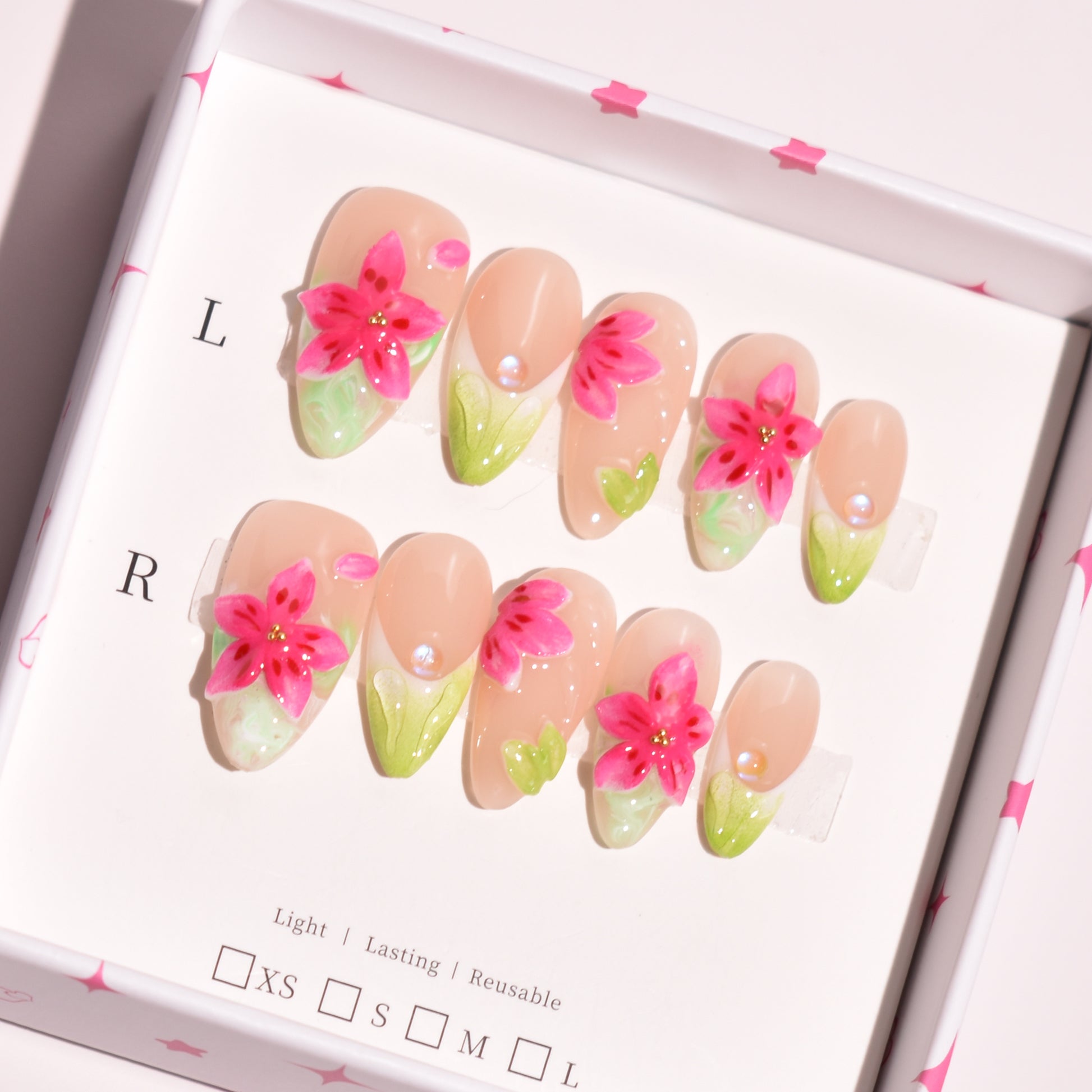 Spring Lily is a handcrafted medium almond press-on nail set inspired by blooming florals and soft garden hues. Featuring a sheer nude base, this design is accented with hand-painted pink lily flowers, soft green leaf detailing, and subtle pearl embellishments for a fresh, elegant look. The medium almond shape creates a naturally elongated silhouette that flatters the hands while remaining comfortable for everyday wear.