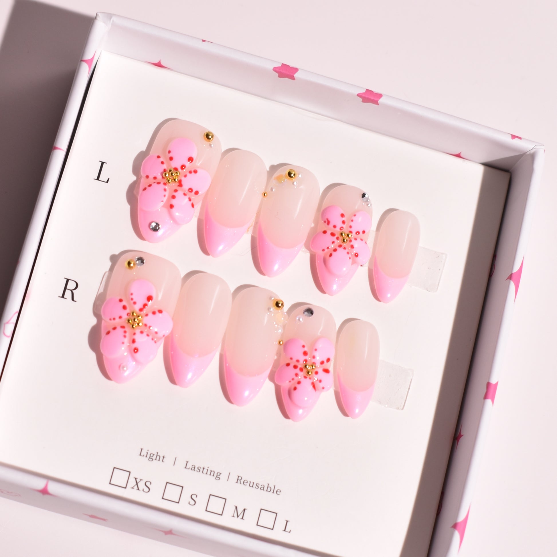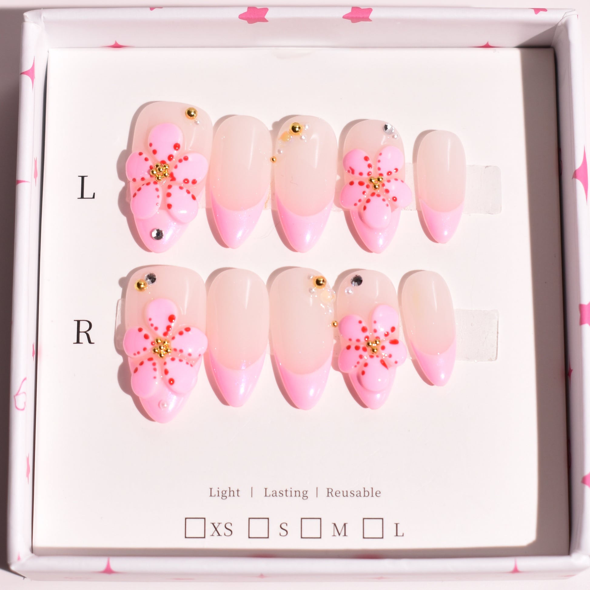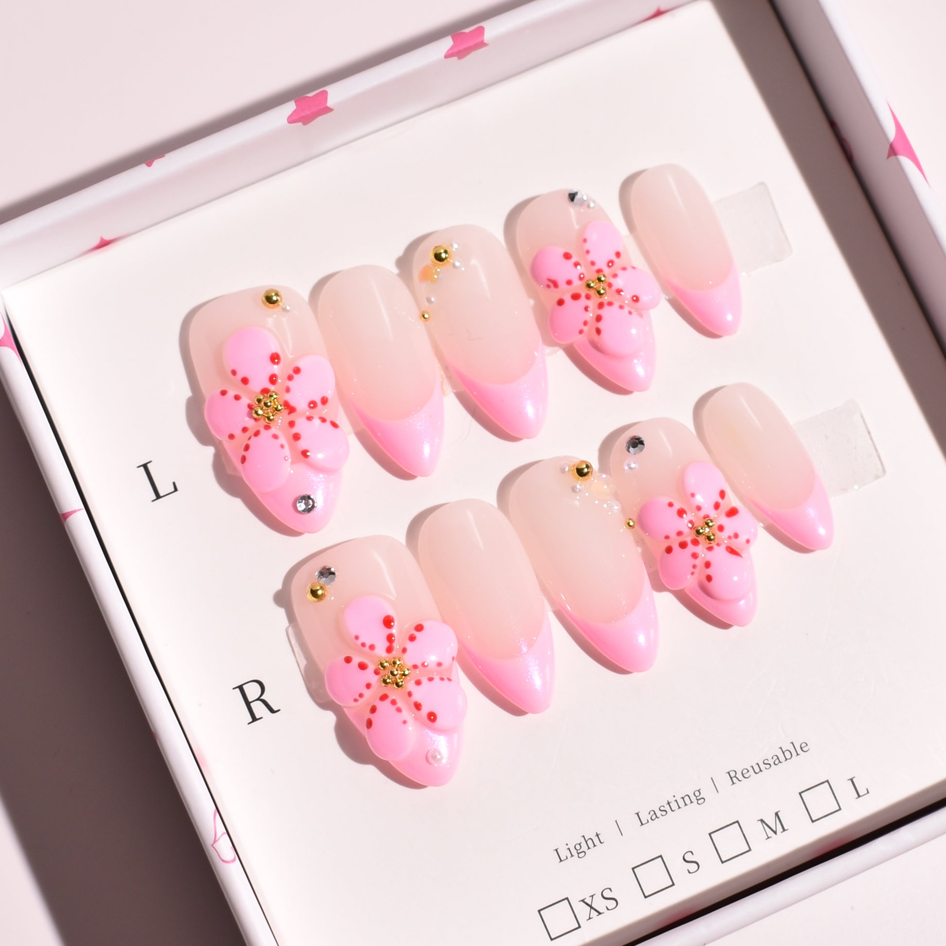 Petaline Aura is lightweight, reusable, and easy to apply, delivering salon-level impact in minutes. Ideal for weddings, vacations, brunch styling, or elevated daily wear, this set is perfect for those searching for pink ombré press-on nails, almond-shaped nails, 3D floral nail art, and feminine luxury press-ons with a clean aesthetic.