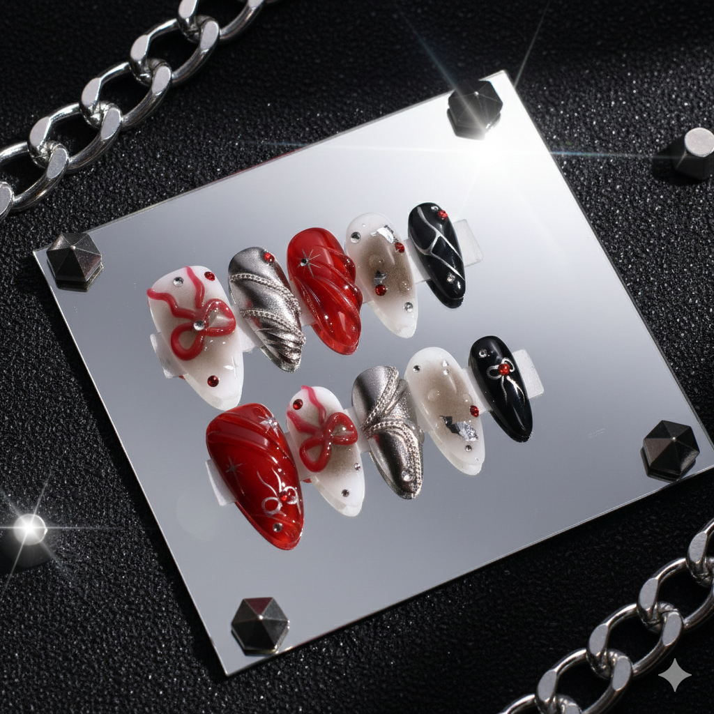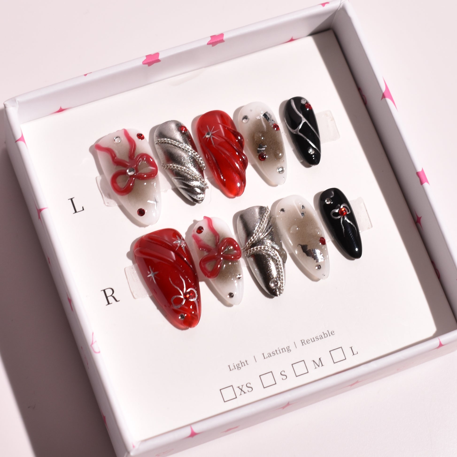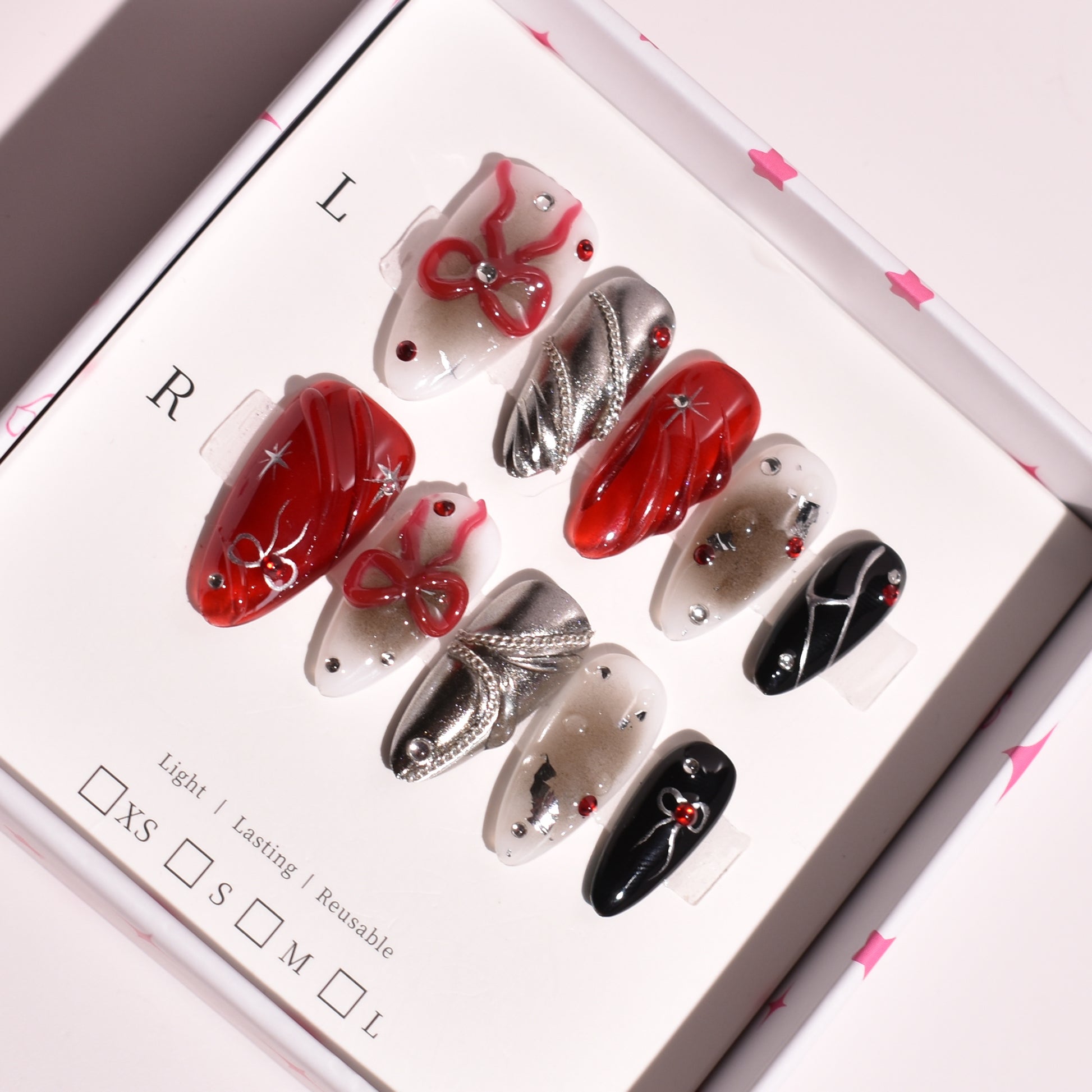 Velour Static is a handcrafted medium almond press-on nail set designed with high-contrast glamour and sculptural dimension. Featuring a bold combination of deep lacquered red, liquid chrome silver, translucent nude, and glossy black accents, this set blends fluid metallic textures with raised bow detailing and crystal embellishments. The medium almond shape creates a refined silhouette while maintaining wearable balance and comfort.