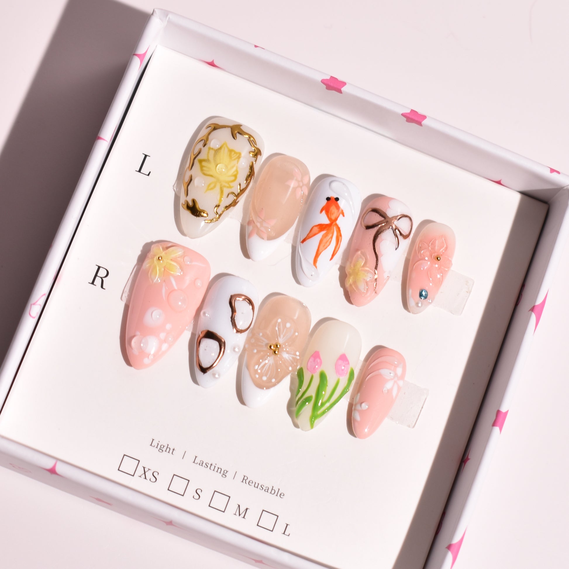 - 10 uniquely designed, hand-painted press-on nails made with high-quality UV gel.