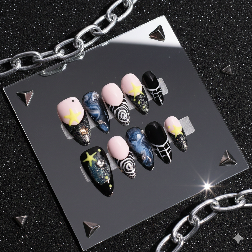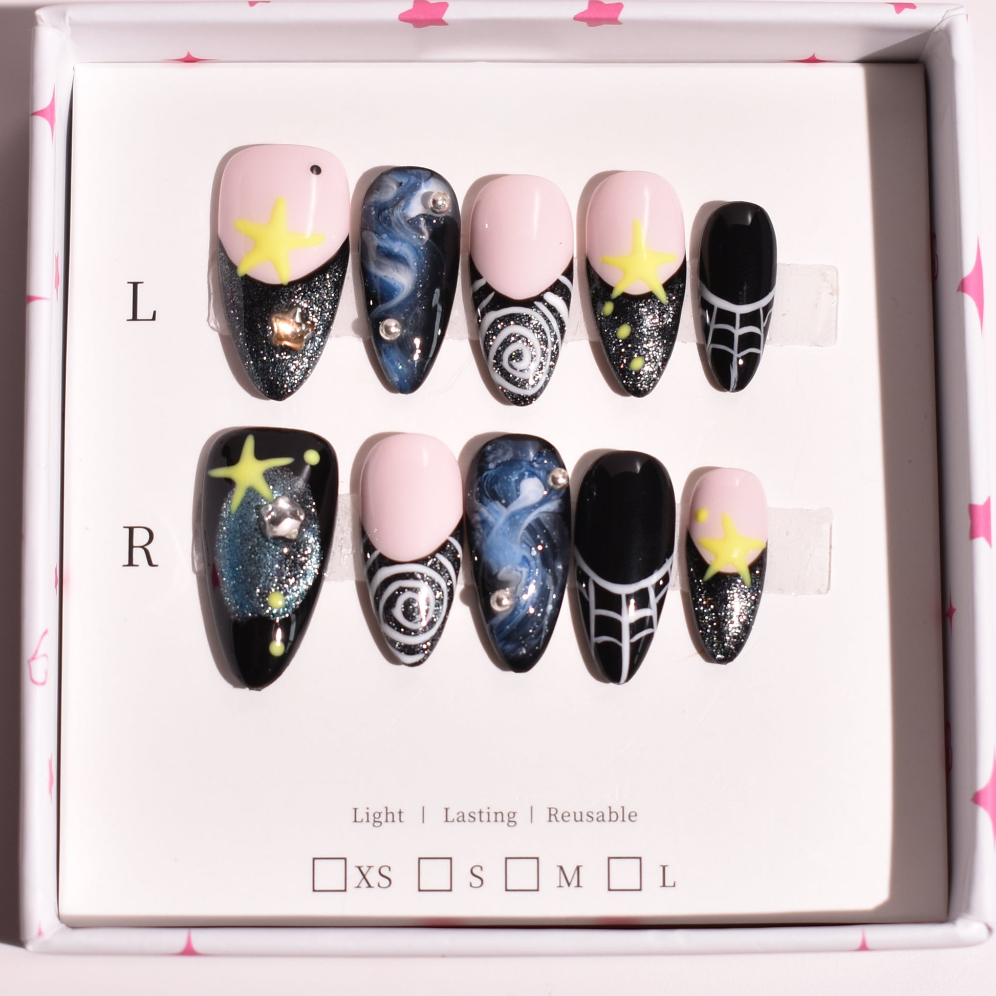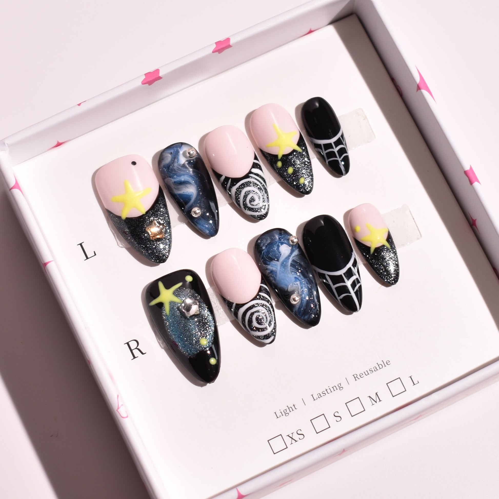 Noctilume Orbit is a handcrafted medium almond press-on nail set inspired by cosmic contrast and graphic detailing. This design blends glossy jet black, soft blush pink, and deep midnight blue with sculptural star accents, galaxy marbling, and spiral line art. The medium almond silhouette keeps the set wearable while allowing the bold elements to feel intentional and balanced.