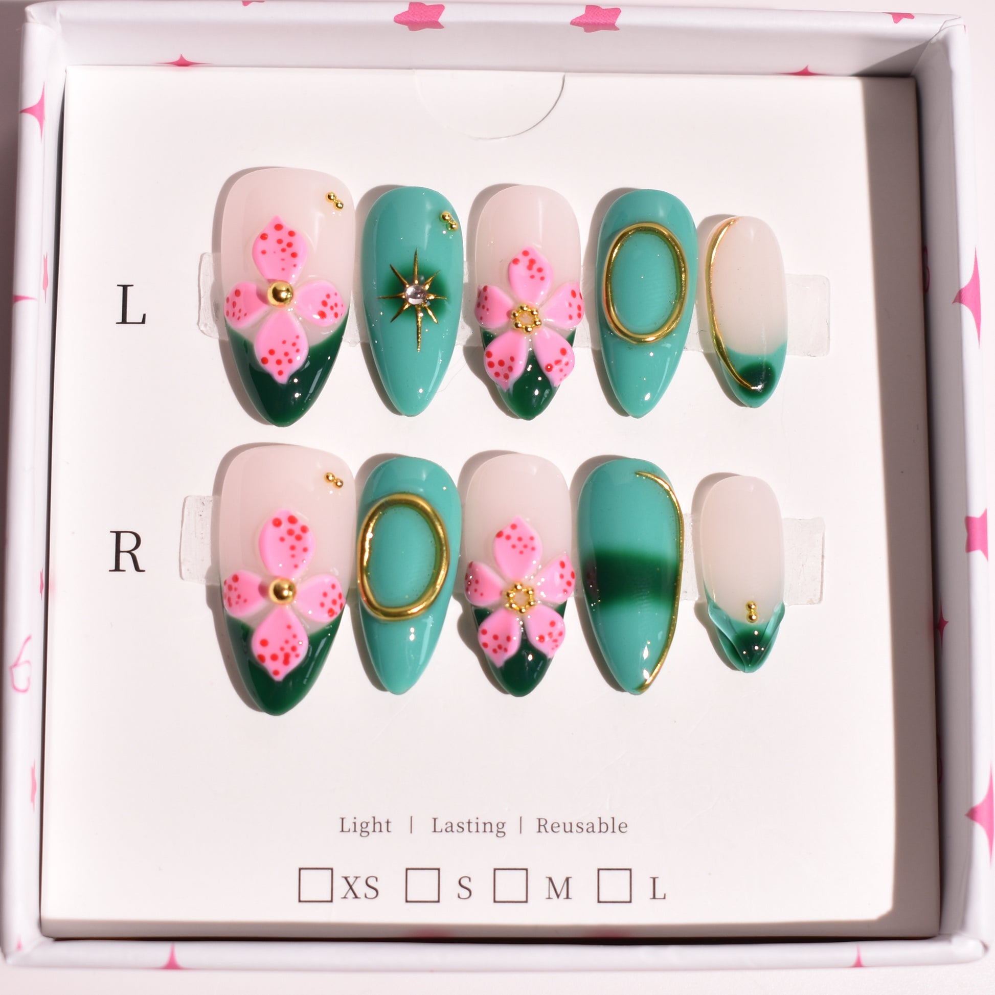 Each nail is individually crafted using premium gel and features hand-sculpted pink floral accents, precision gold bead centers, metallic oval framing, and subtle crystal details. The layered green ombré transitions create depth, while the gold contour lines add structure and contrast. A high-gloss gel topcoat seals the design with long-lasting shine and durability.