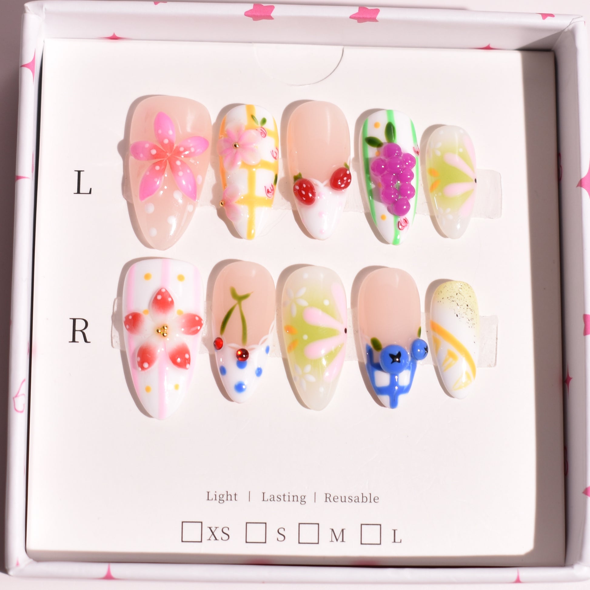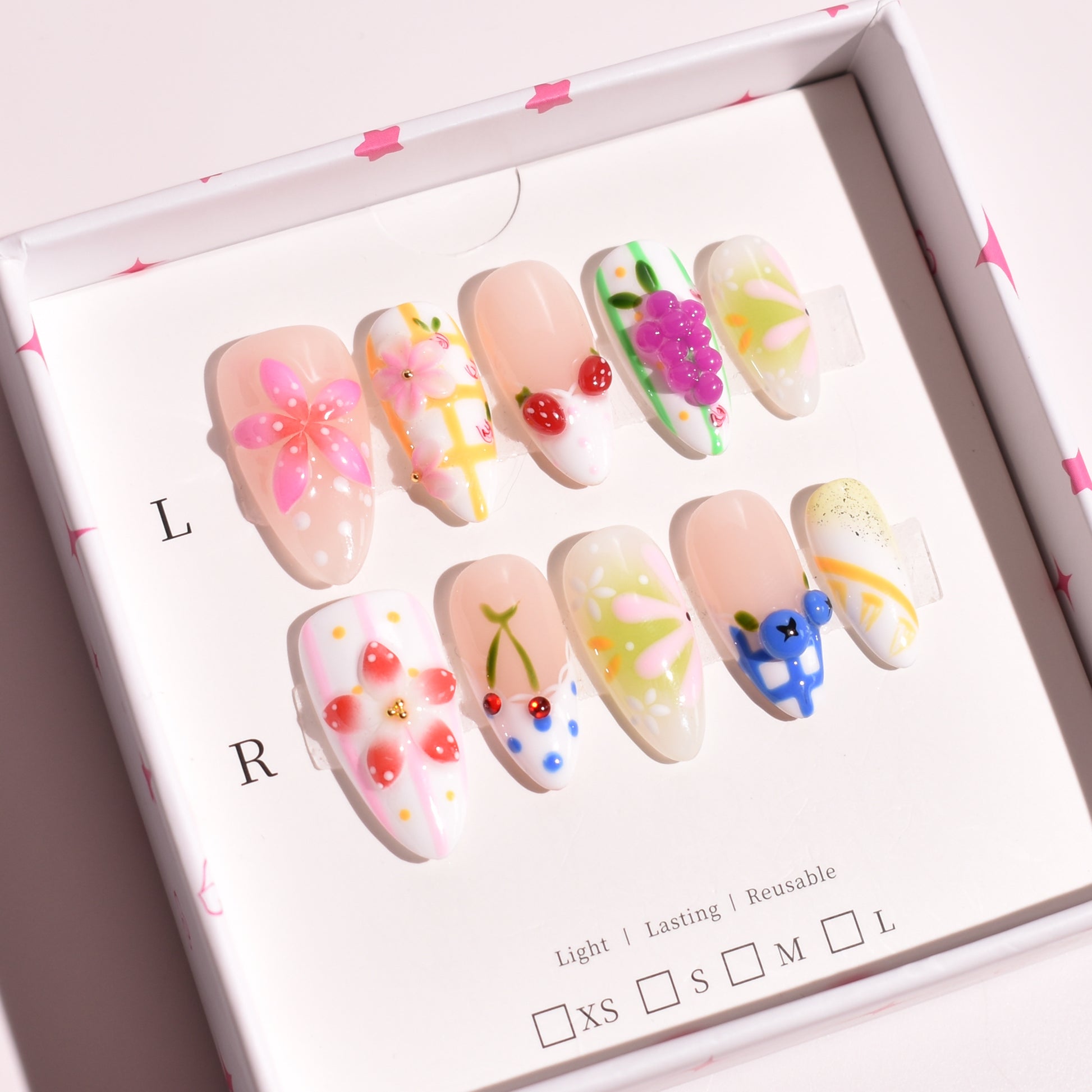 Each nail is individually handmade using premium gel and showcases dimensional fruit elements, precision floral brushwork, soft color blocking, and subtle embellishments. The mix of gloss finishes and raised detailing adds depth and movement, while carefully placed rhinestones provide controlled sparkle. A high-gloss gel topcoat seals the design for long-lasting shine and durability.