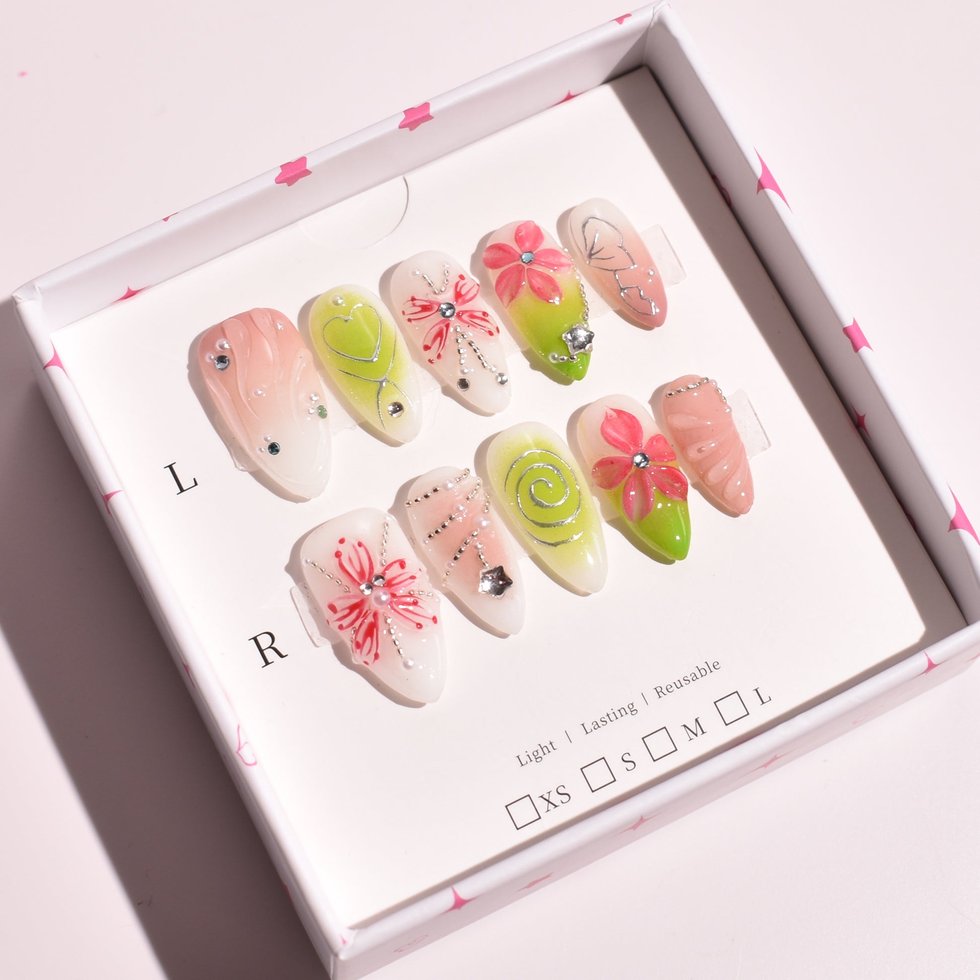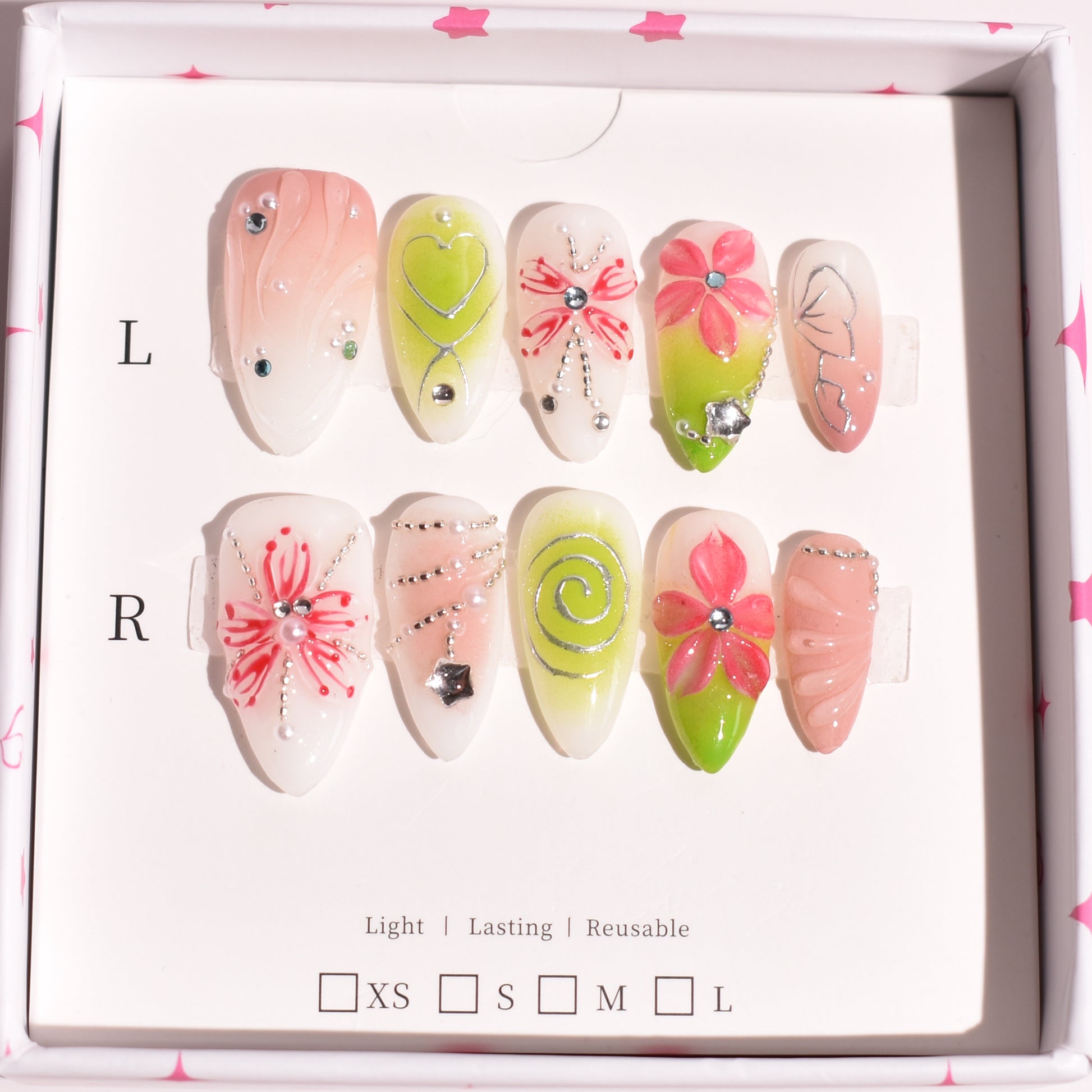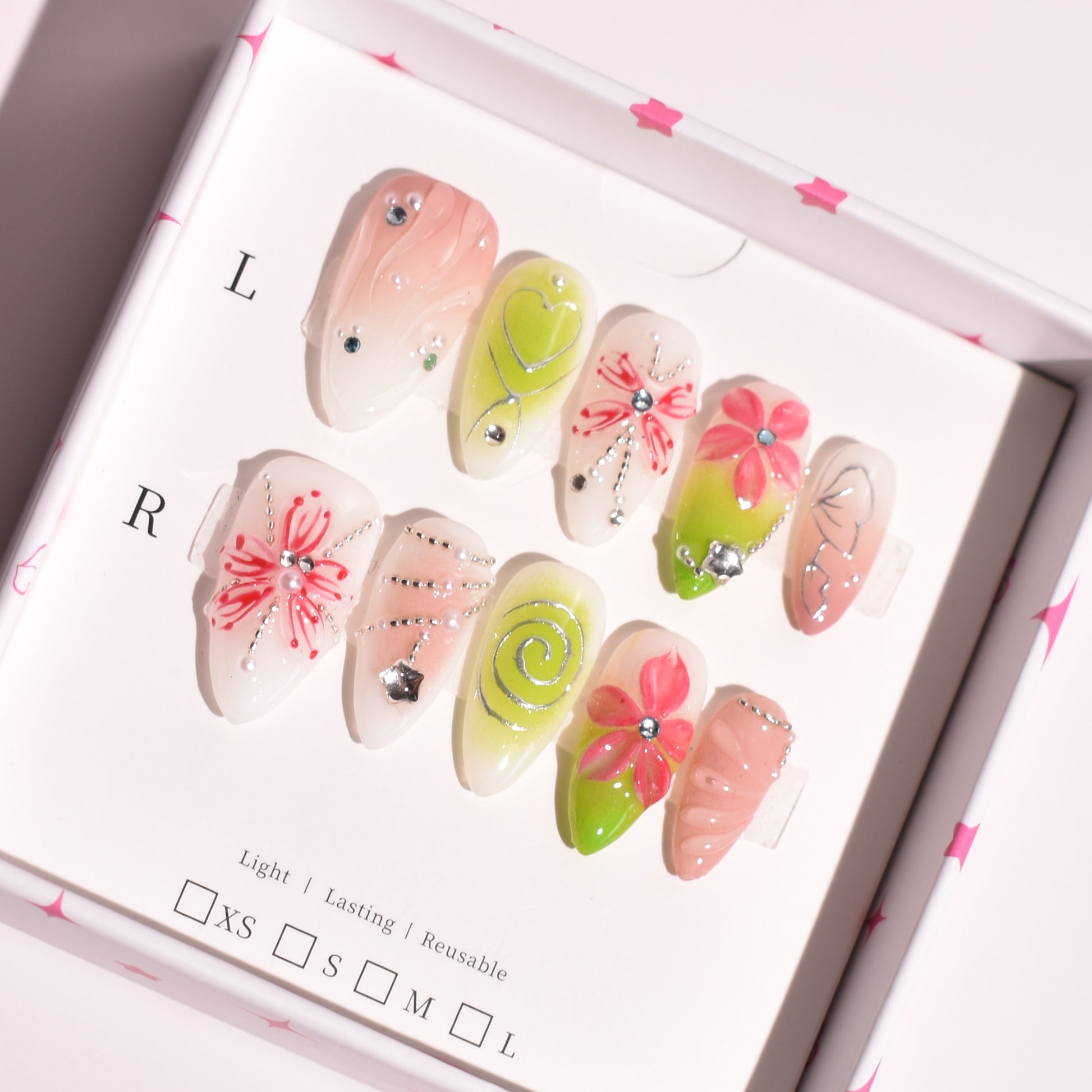 Helio Current is lightweight, reusable, and easy to apply, delivering salon-quality artistry in minutes. Ideal for summer styling, statement everyday wear, creative fashion looks, or bold feminine aesthetics, this set is perfect for those searching for almond-shaped press-on nails, green ombré nails, sculpted floral nail art, and luxury handmade nail designs.