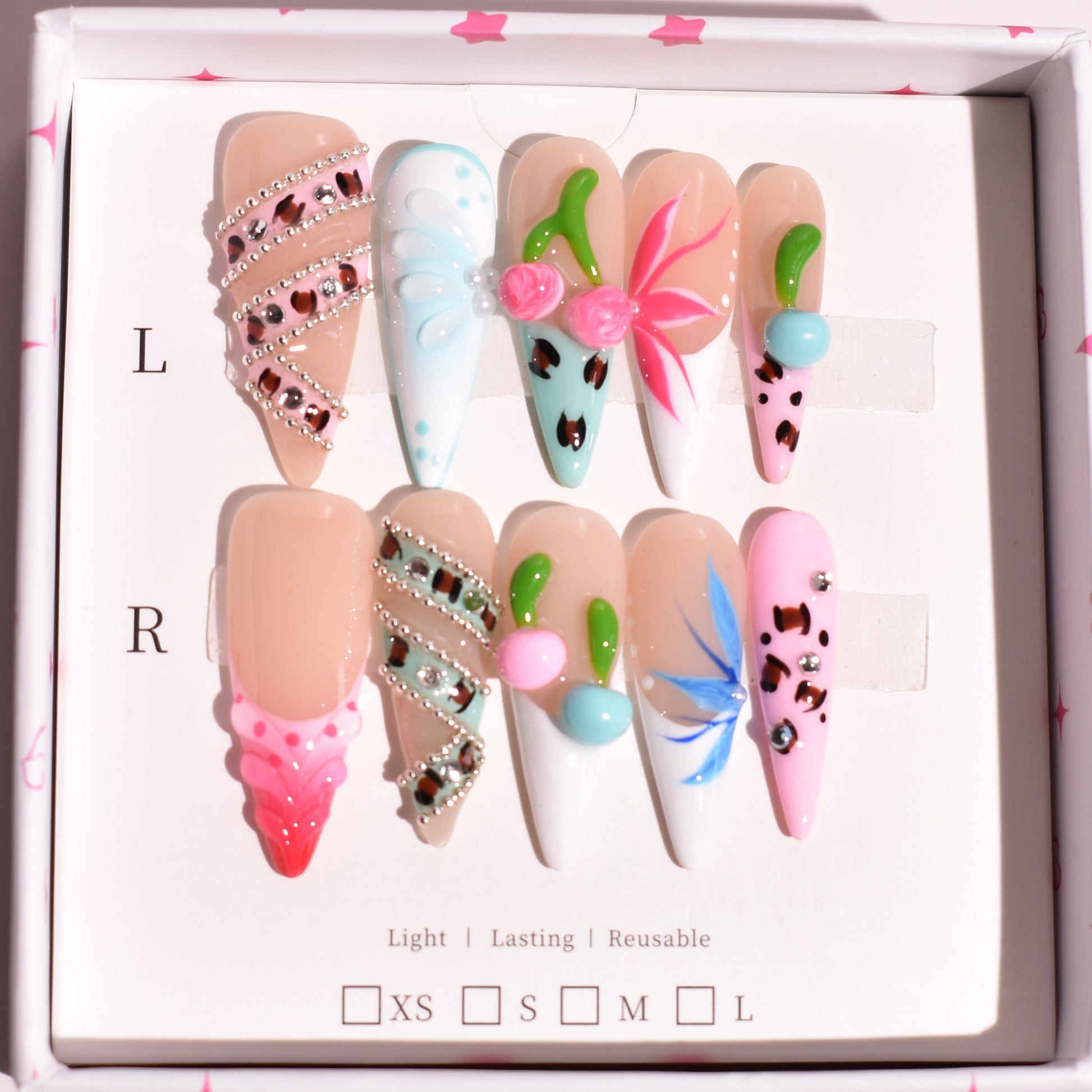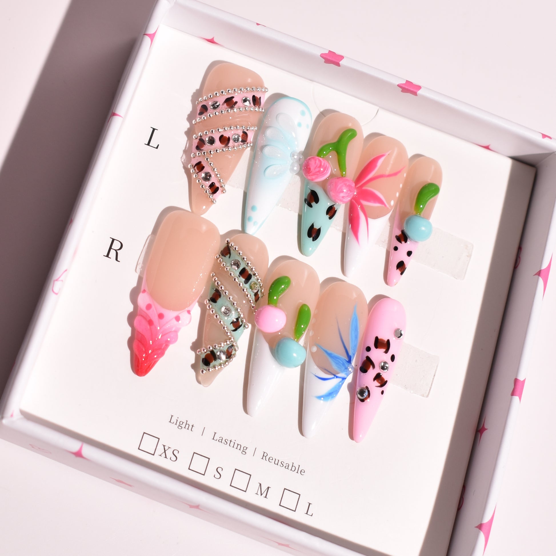 Neon Bazaar is a handcrafted long stiletto press-on nail set that blends bold color blocking, sculpted 3D elements, and playful animal print accents into one high-impact design. Built on a nude base for contrast, this set features vibrant turquoise, hot pink, baby blue, white, and soft blush tones layered with leopard spots, rhinestone striping, sculpted cherries, abstract florals, and dimensional gel detailing.