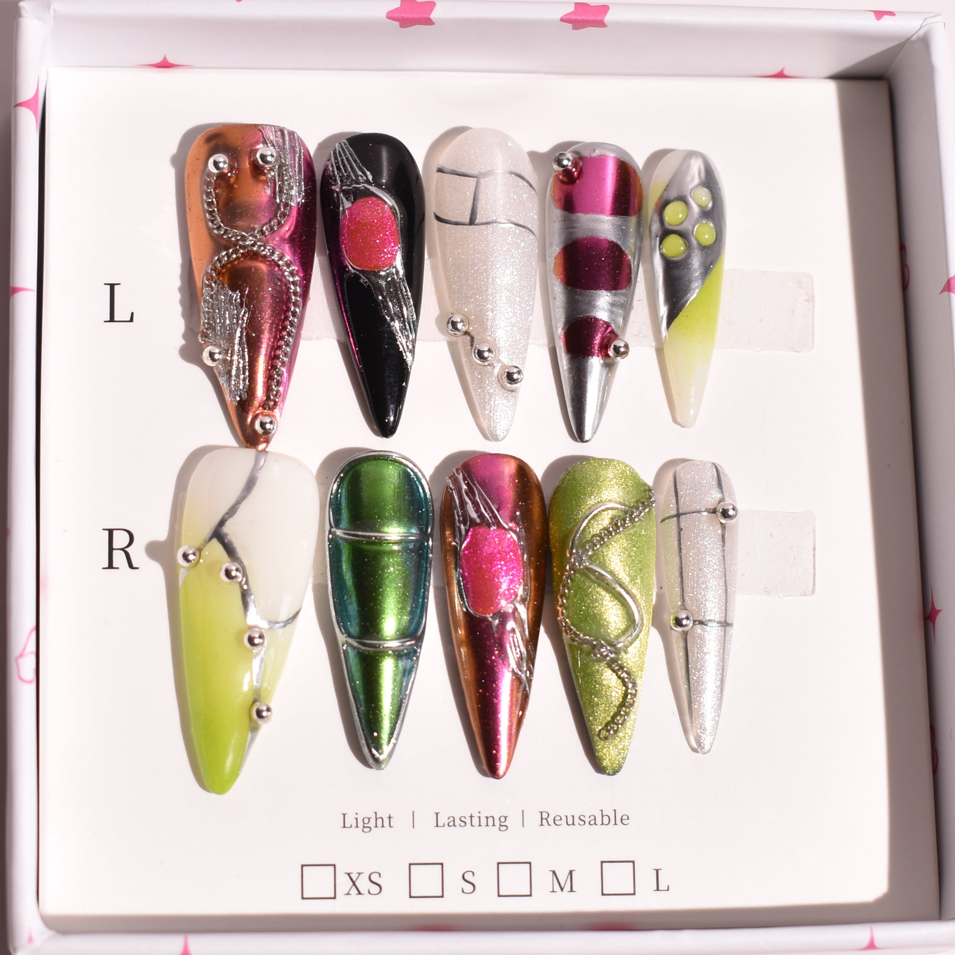 Chrome Voltage is a handcrafted long stiletto press-on nail set designed for high-impact, futuristic glam. Featuring ultra-reflective chrome finishes, neon gradients, and sculpted metallic detailing, this set combines molten copper, emerald green chrome, magenta metallic, silver shimmer, acid lime, and jet black for a bold industrial-luxe aesthetic.