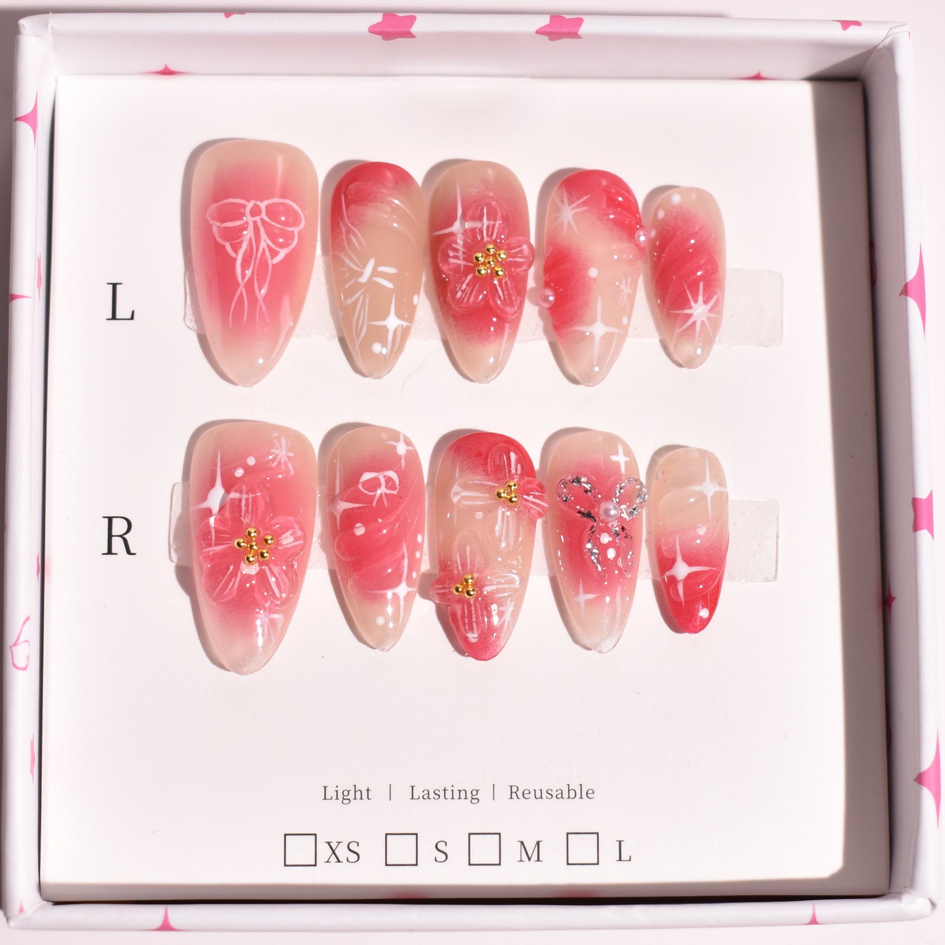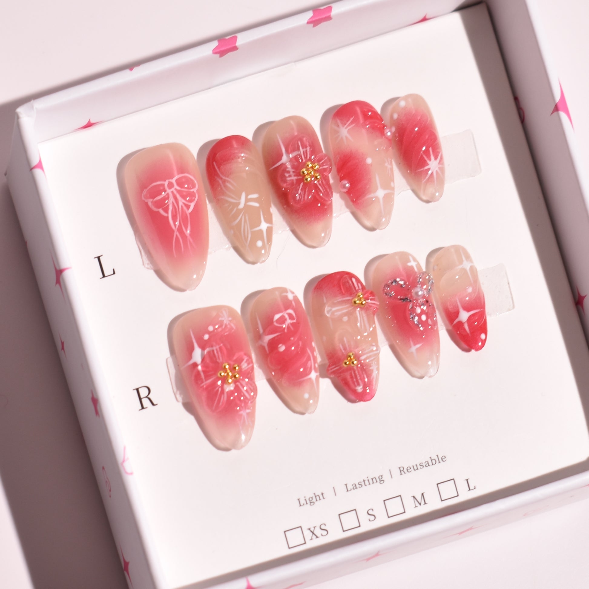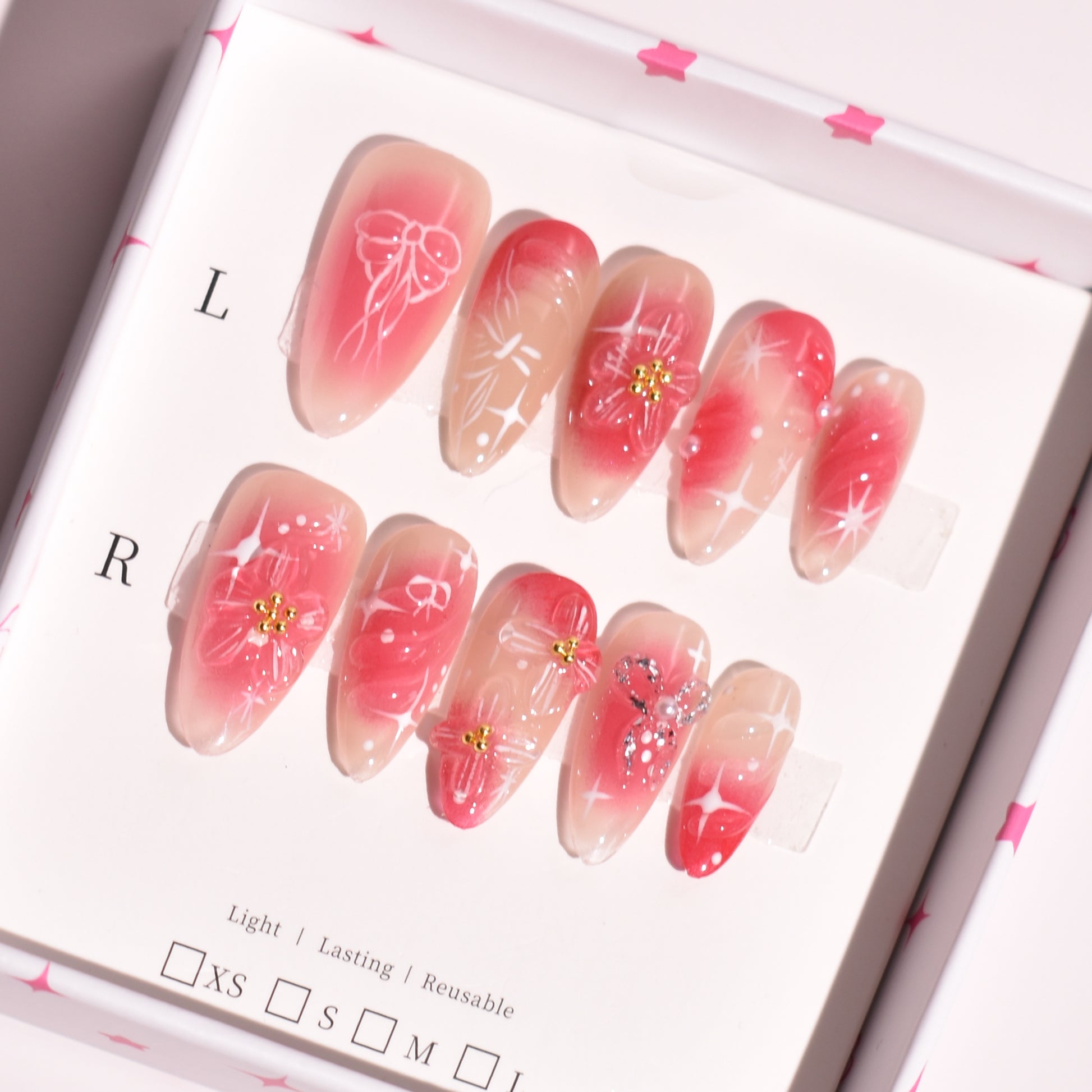Lightweight, reusable, and durable, Blush Reverie is ideal for those searching for medium almond press-on nails, pink ombre nails, floral almond nails, romantic blush nail designs, soft glam press-ons, and elegant handmade nail sets. Perfect for bridal events, date nights, spring occasions, or everyday polished glam.