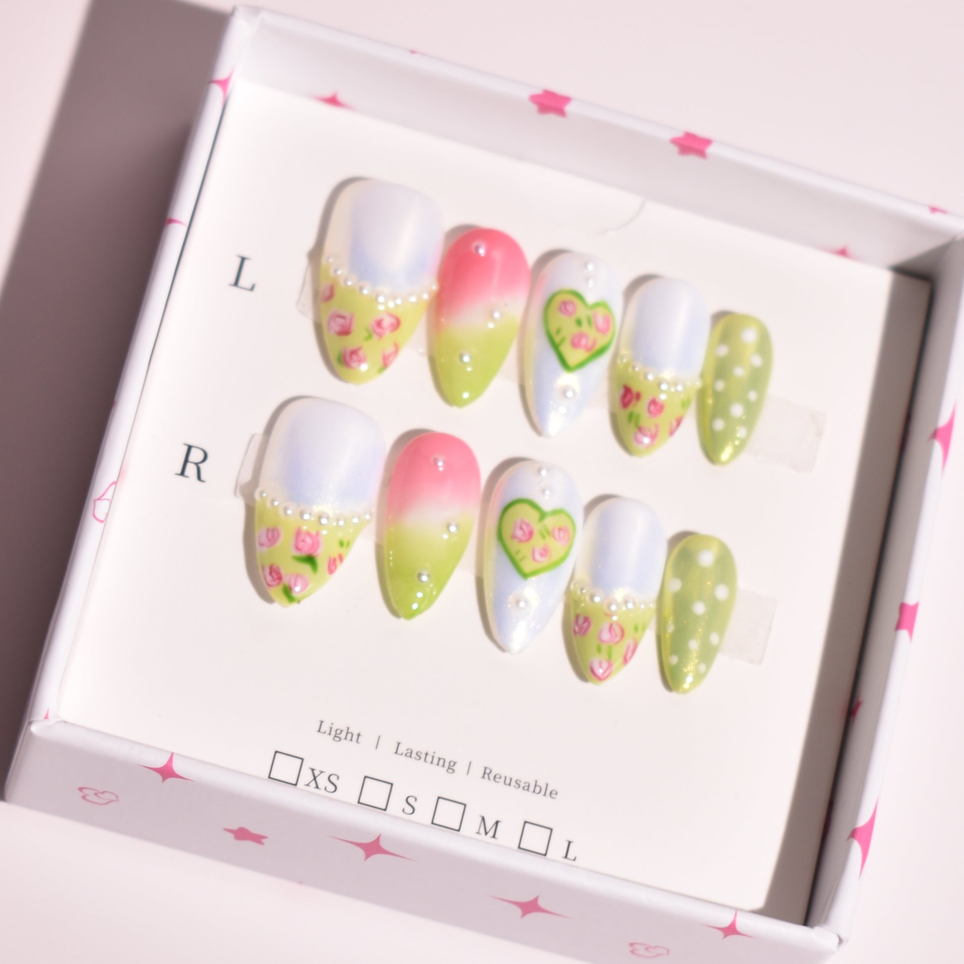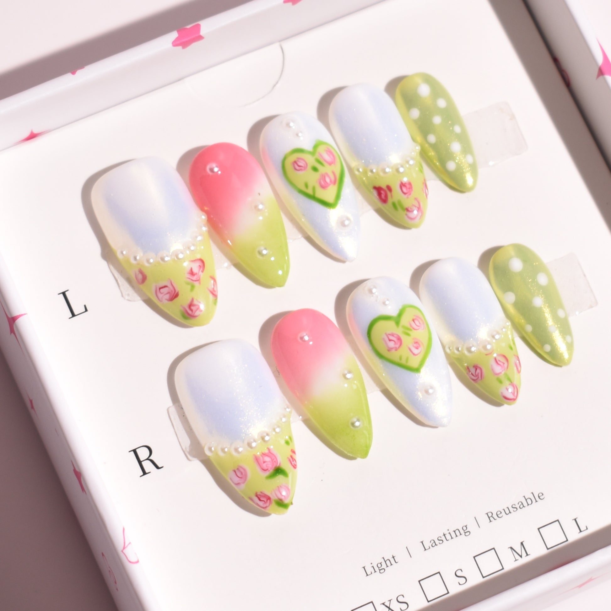 Verdant Heirloom is a handcrafted medium almond press-on nail set that blends soft pastel gradients with delicate rose detailing for a romantic yet modern finish. A seamless fade of powder blue, blush pink, and fresh lime green creates an airy aura effect, layered with hand-painted miniature roses and pearl embellishments for refined dimension.