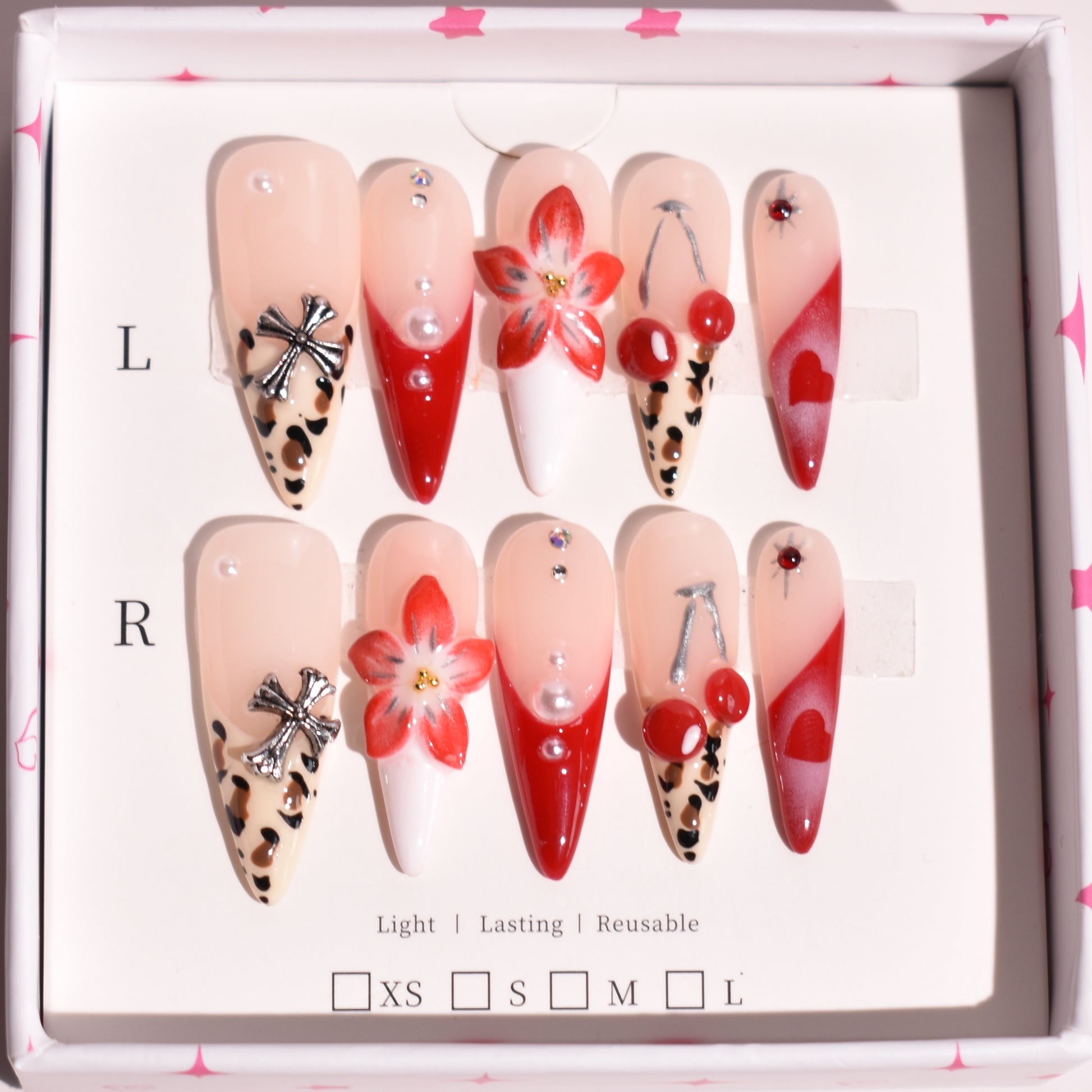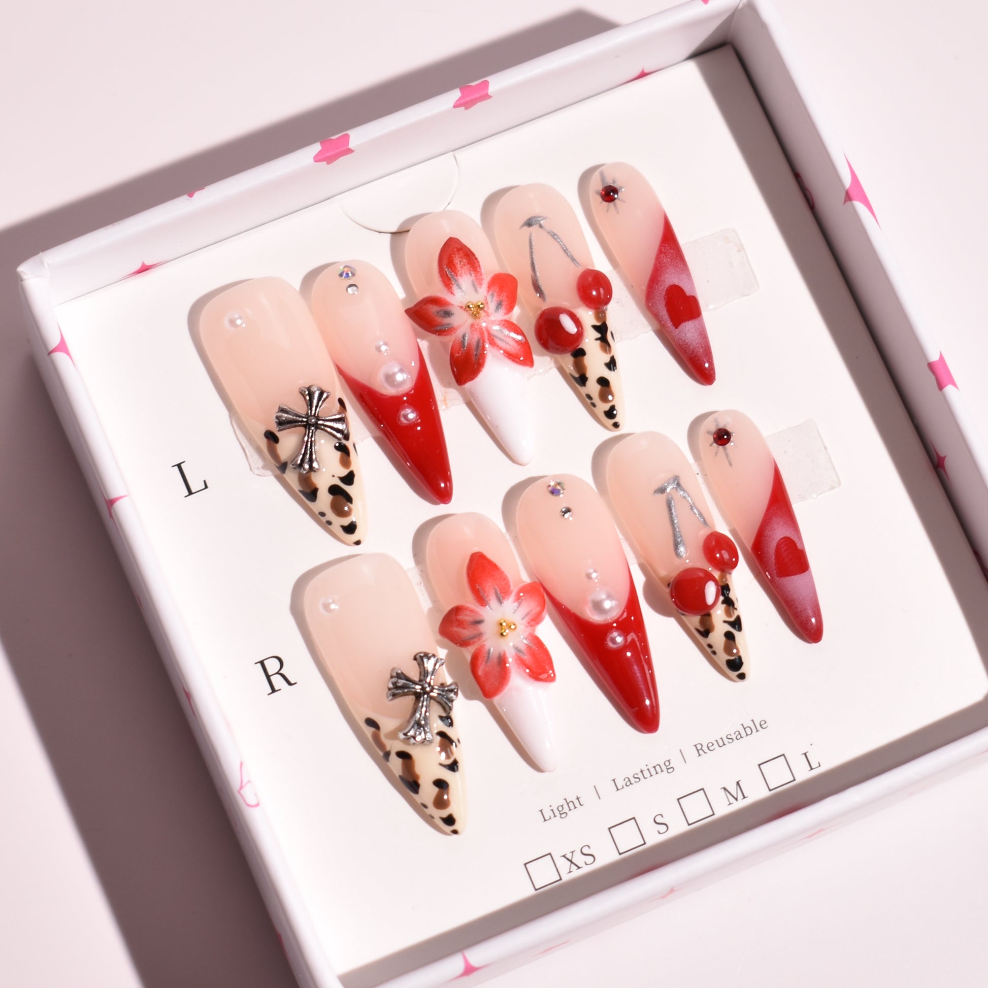Perfect for those searching for long stiletto press-on nails, red ombre nails, cherry nail art, leopard print nails, 3D flower nails, chrome cross nails, bold glam press-ons, and handmade reusable nails. Ideal for date nights, holiday glam, photoshoots, concerts, or statement everyday wear.