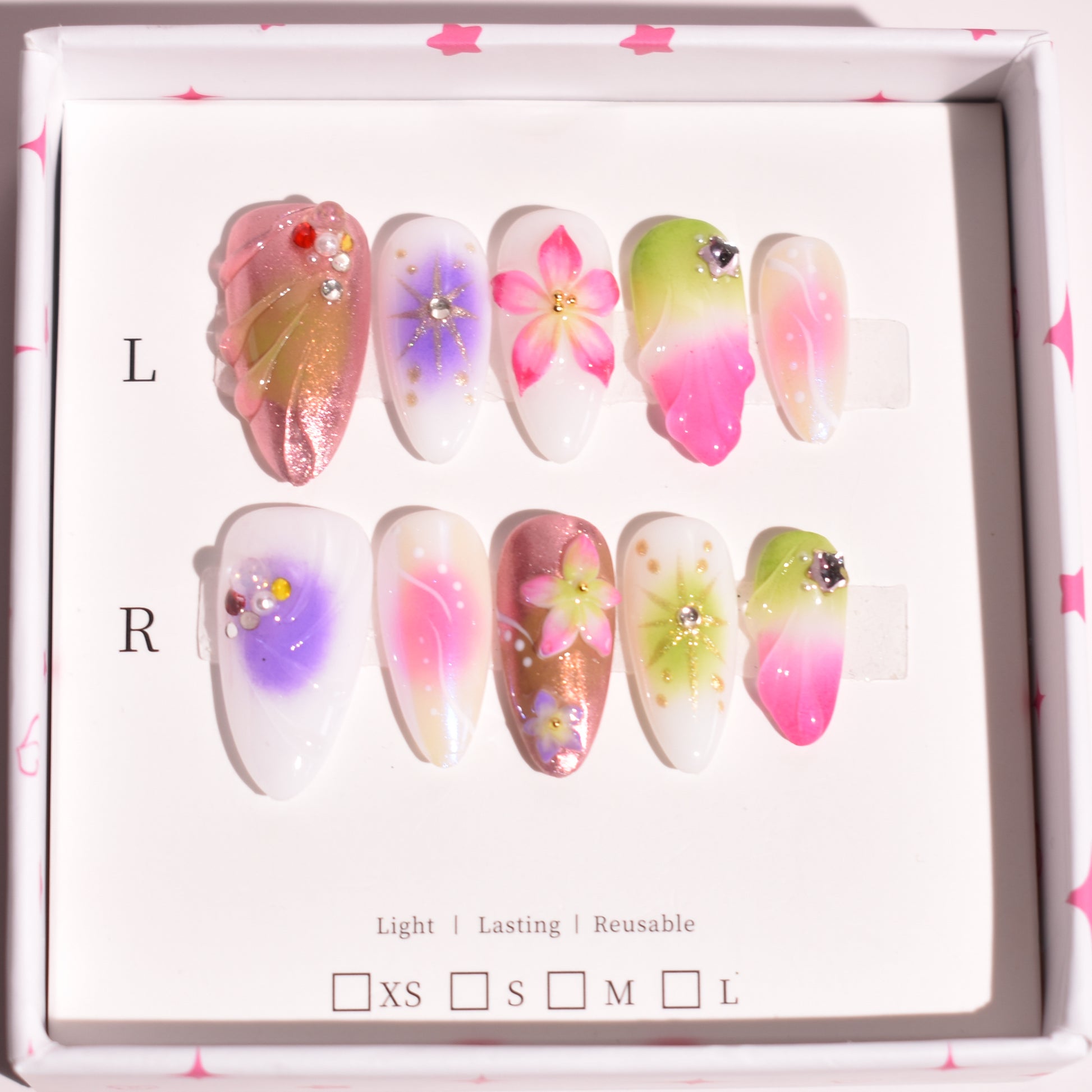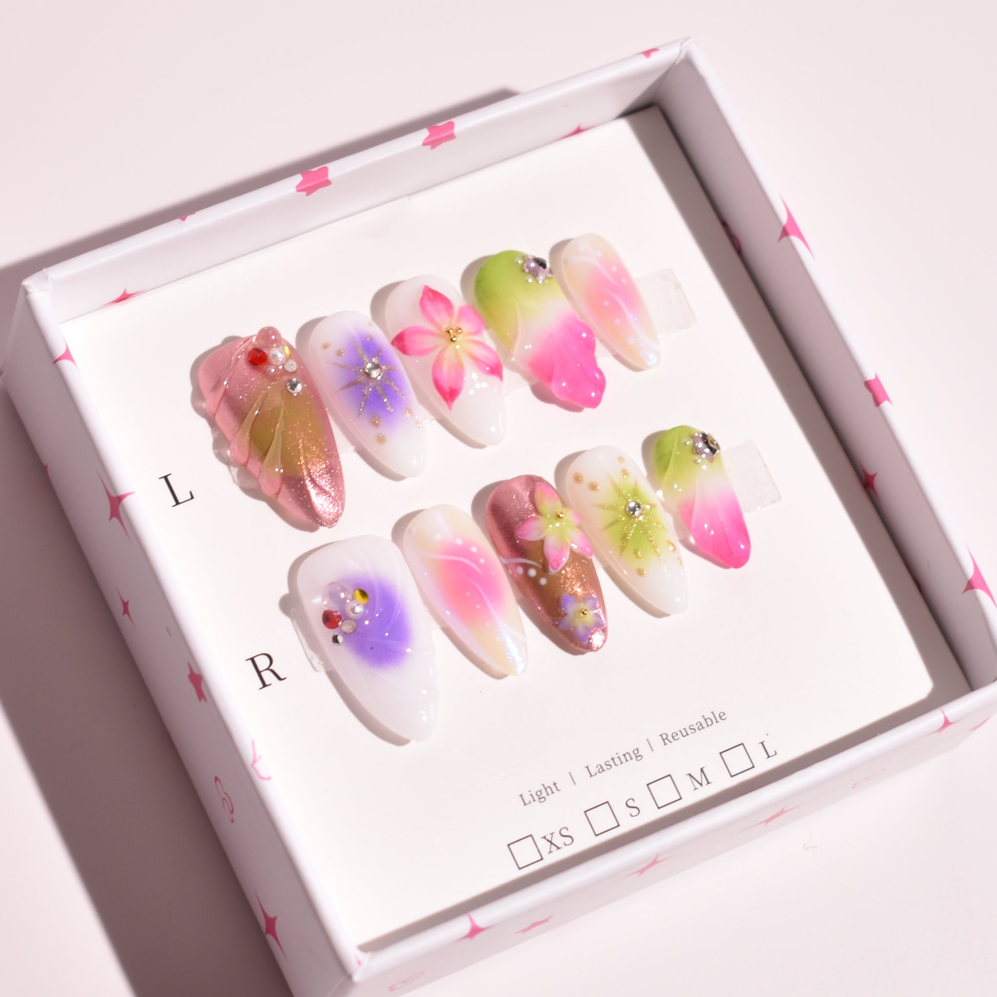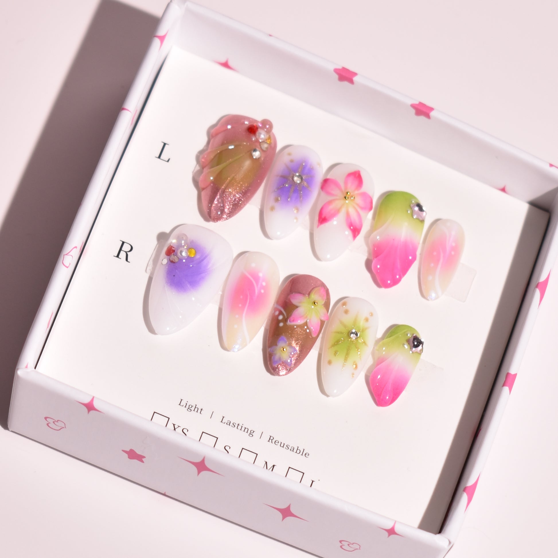 Solara Bloom is a luminous medium almond press-on nail set inspired by warm sunsets and tropical florals. This handcrafted design blends soft pink, lime green, lilac, and pearlescent white gradients with dimensional 3D flowers and metallic chrome accents. Each nail transitions seamlessly between colors, creating a glowing ombré effect that feels airy, fresh, and editorial.