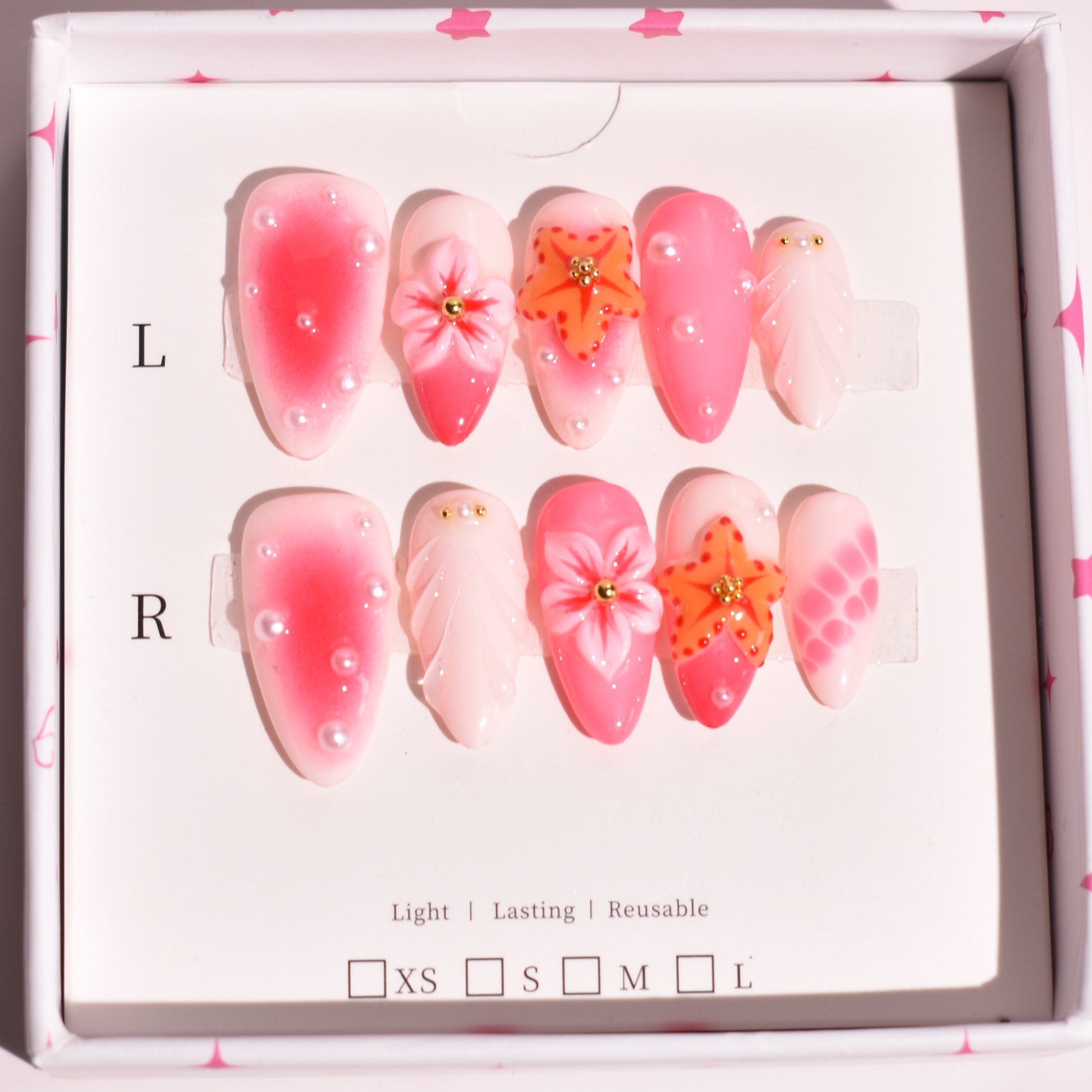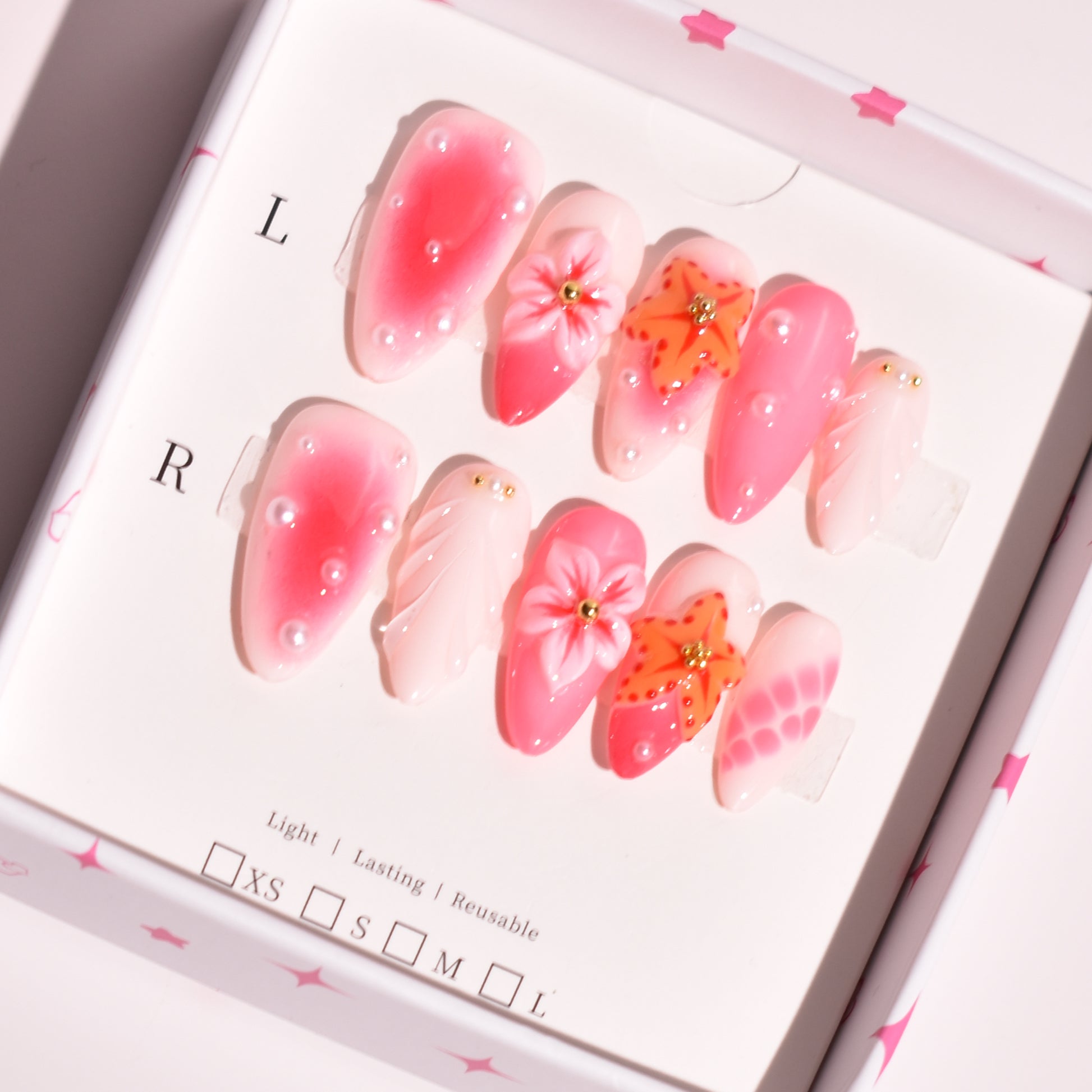 Coraline Drift is a radiant medium almond press-on nail set inspired by coral reefs and sunlit coastlines. This handcrafted design features glowing pink ombré gradients, translucent blush overlays, and soft milky white accents. Dimensional 3D florals and sculpted starfish details bring texture and movement, while delicate pearl embellishments add a refined, ocean-kissed elegance.