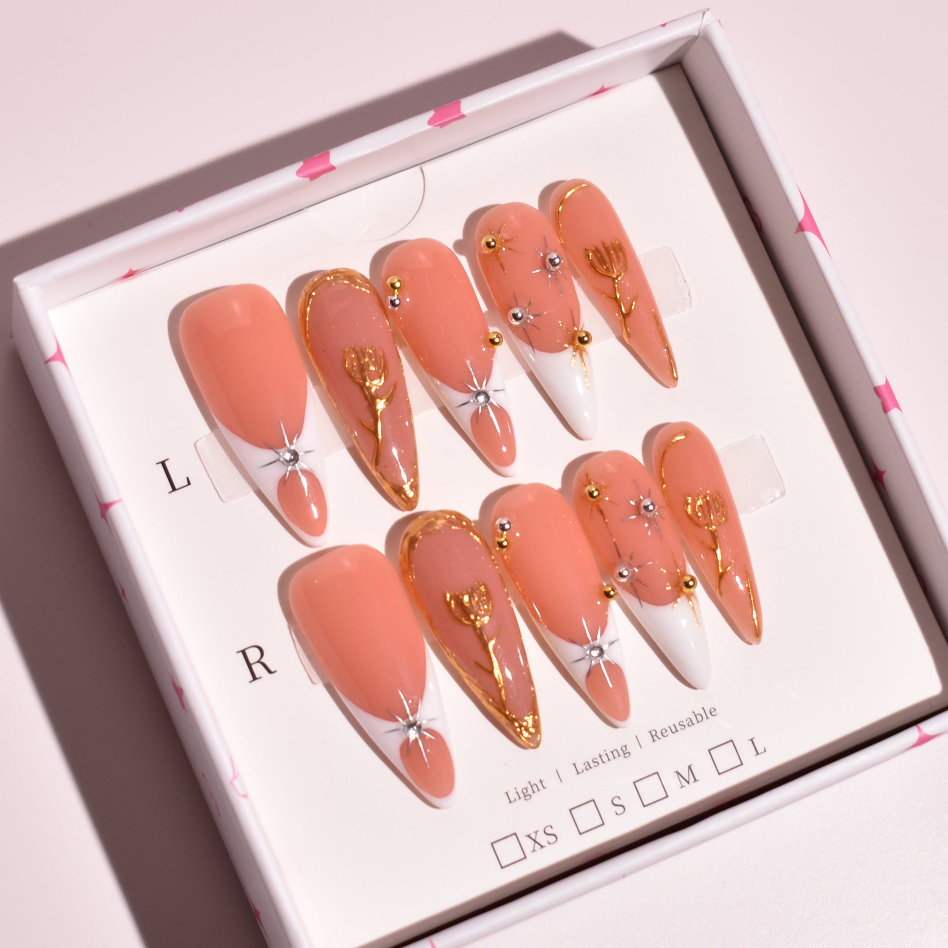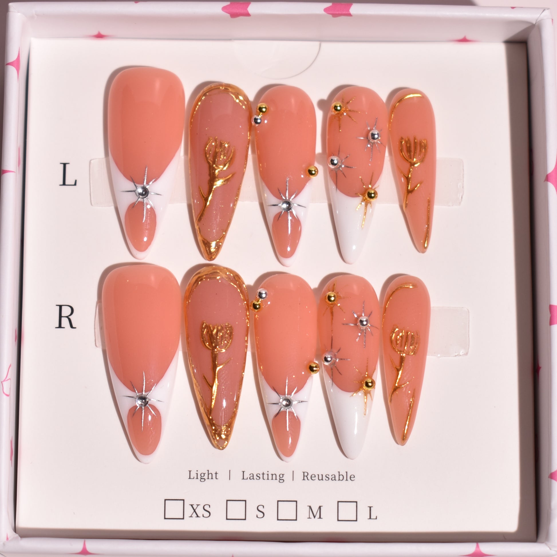 Soft warmth meets celestial detail in Apricot Halo Bloom, a long stiletto press-on nail set designed for elevated elegance. This handcrafted set features a creamy apricot-peach base paired with crisp white negative space tips, metallic gold chrome edging, and sculpted floral accents. Delicate raised gold tulip motifs and fine metallic starburst details create a radiant, dimensional finish that feels both romantic and modern.