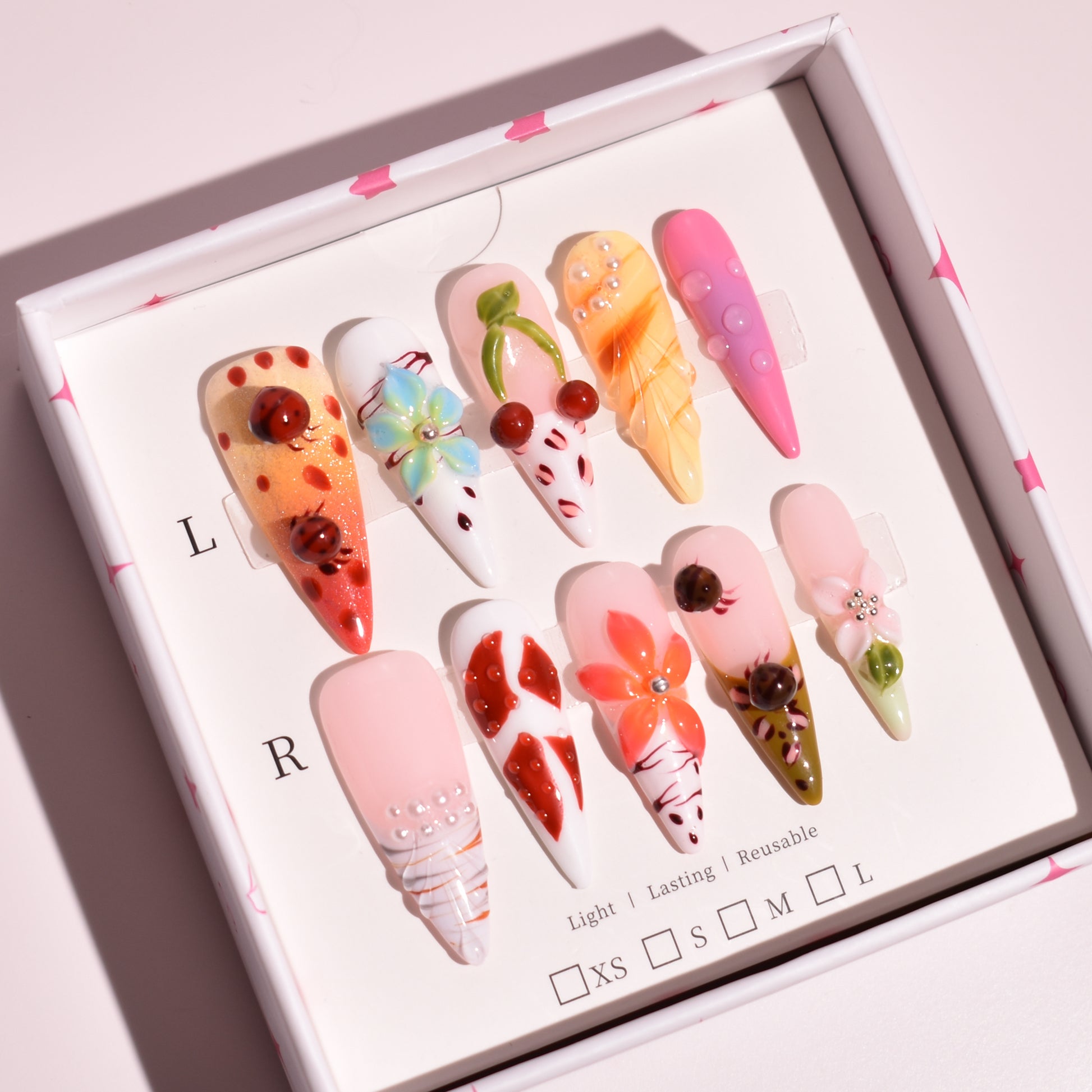 - 10 uniquely designed, hand-painted press-on nails made with high-quality UV gel.