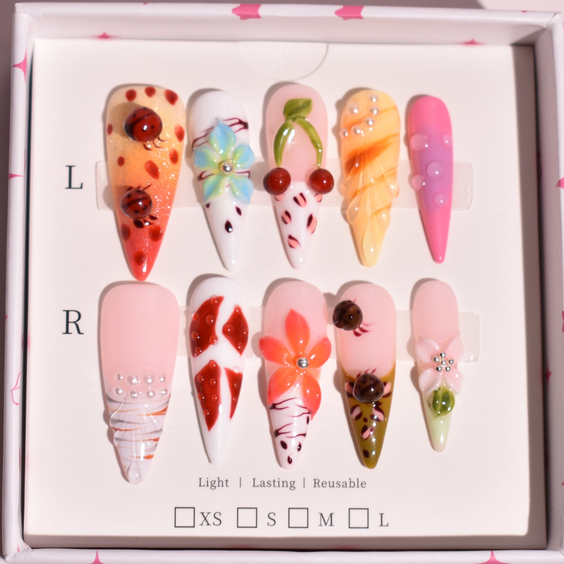 Playful meets couture in Scarlet Orchard Whimsy, a bold long stiletto press-on nail set designed for statement lovers. This handcrafted set features sculpted 3D ladybugs, glossy cherry charms, vibrant petal florals, and hand-painted fruit-inspired accents layered over soft blush, creamy white, citrus orange, and candy pink bases. Each nail is individually detailed with raised gel textures, translucent gradients, micro pearl embellishments, and high-gloss sealing for a dimensional, luxury finish.