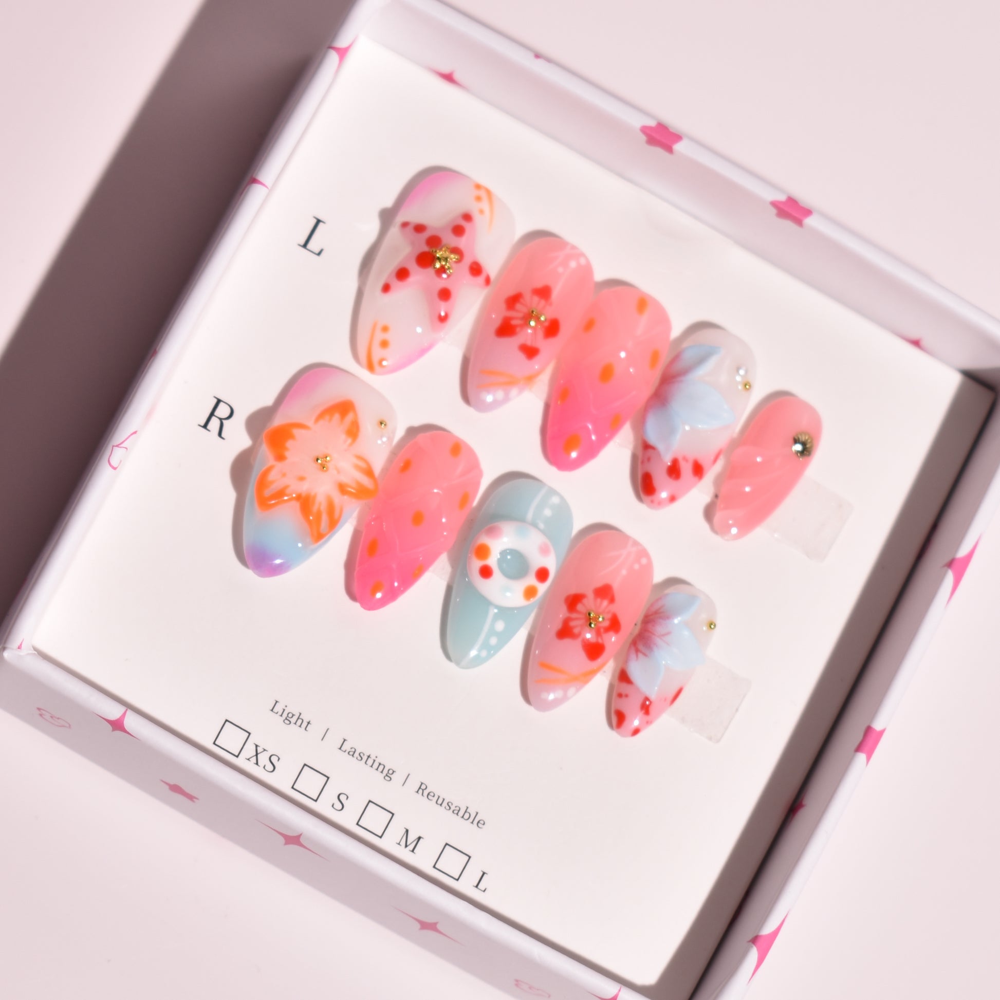 Coral Drift Society is a vibrant, tropical-inspired handmade press-on nail set designed in a flattering medium almond shape for a soft yet statement silhouette. This design blends coral pink gradients, milky white bases, and refreshing aqua tones with playful polka dot accents and dimensional floral art.