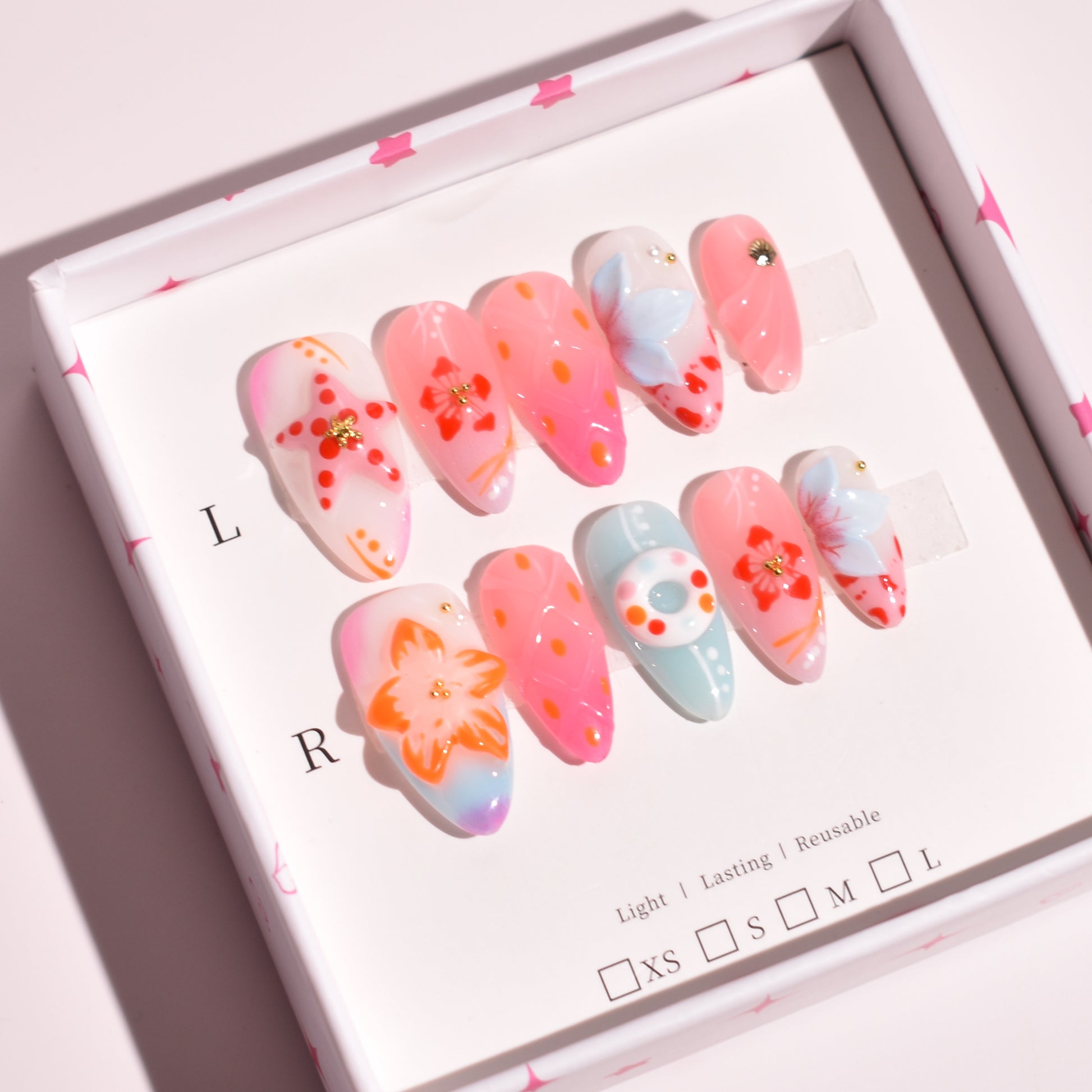 Each nail is individually hand-painted with sculpted gel flowers, starfish-inspired motifs, abstract petal overlays, and glossy raised detailing. Bright coral and hot pink tones melt into sheer white ombré transitions, while pops of baby blue add contrast and modern edge. Gold micro-bead accents and subtle crystal embellishments elevate the design, giving it a luxe, vacation-ready finish without overpowering the softness.