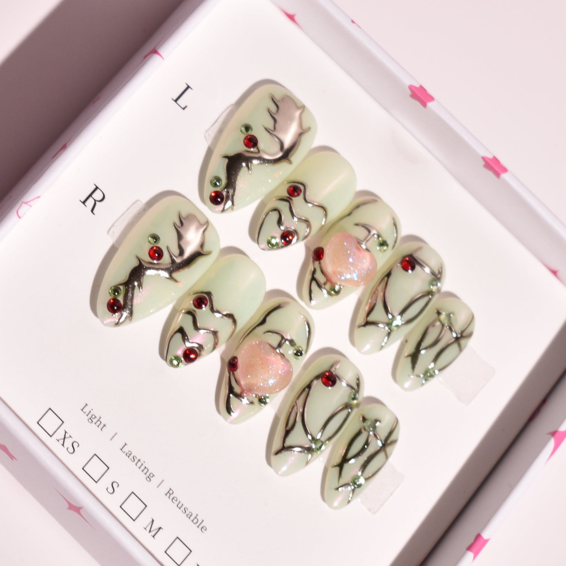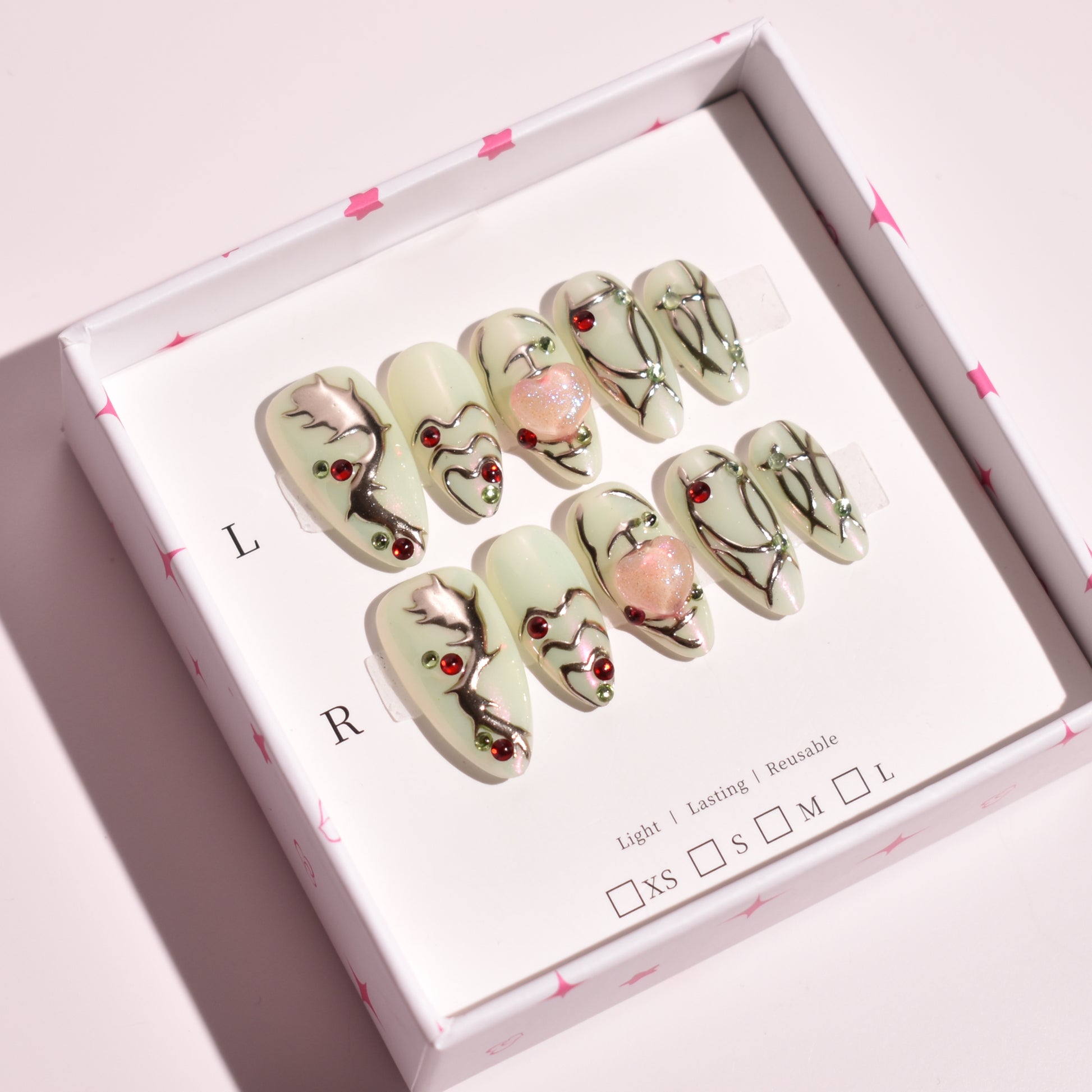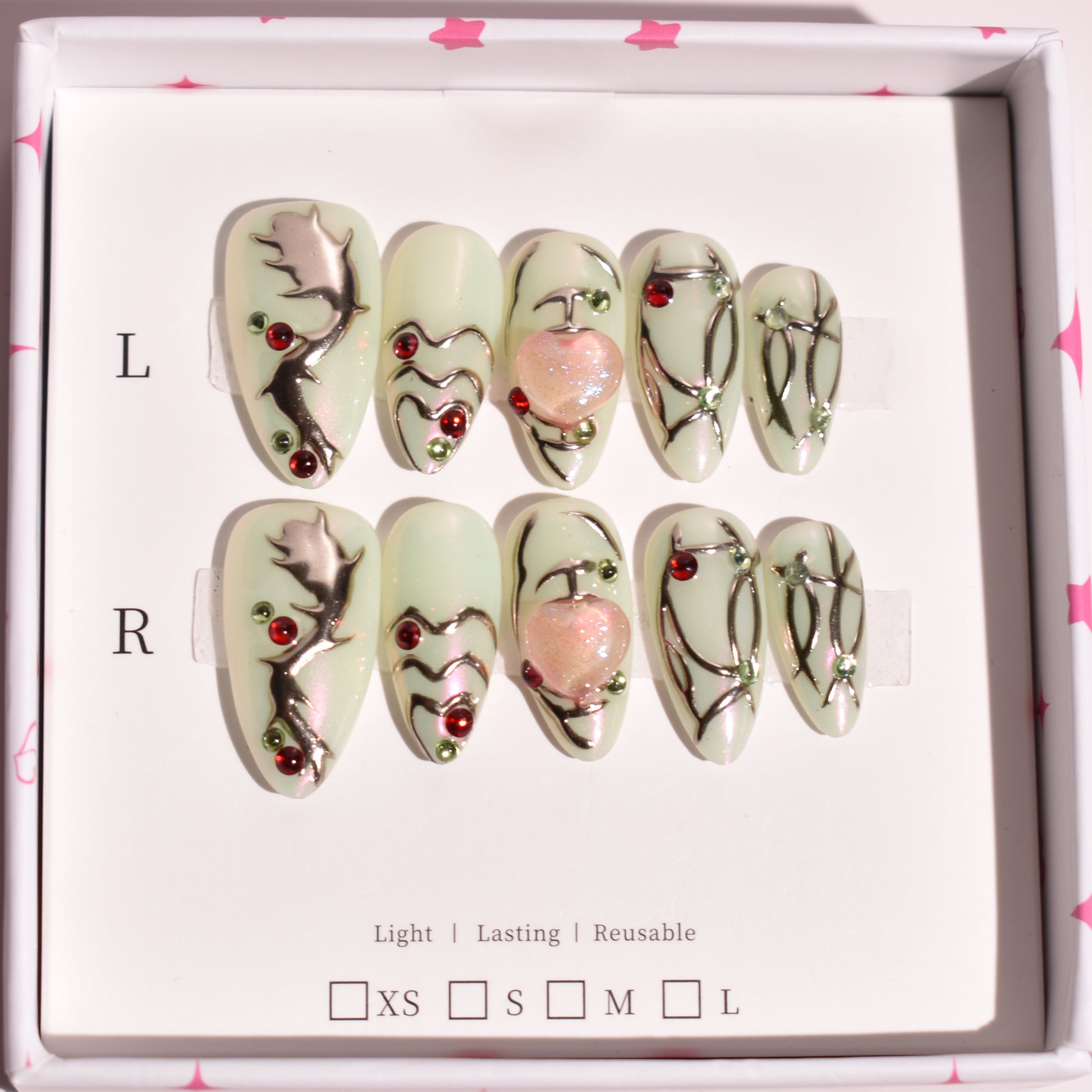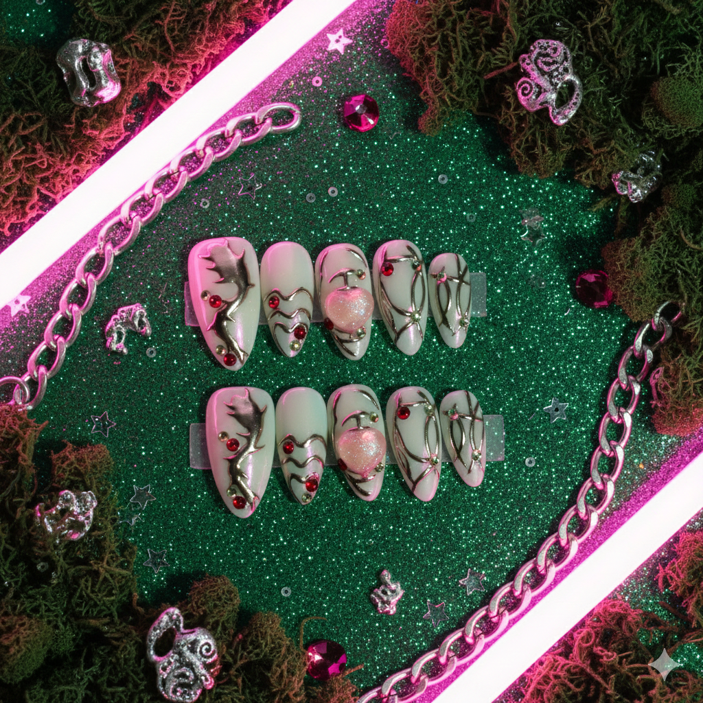 Lightweight, reusable, and salon-quality, this medium almond press-on nail set is perfect for statement nails, holiday glam, winter aesthetics, edgy romantic looks, and elevated seasonal styling. Verdant Obsession delivers sculptural texture, luxury shine, and bold femininity in one unforgettable set.