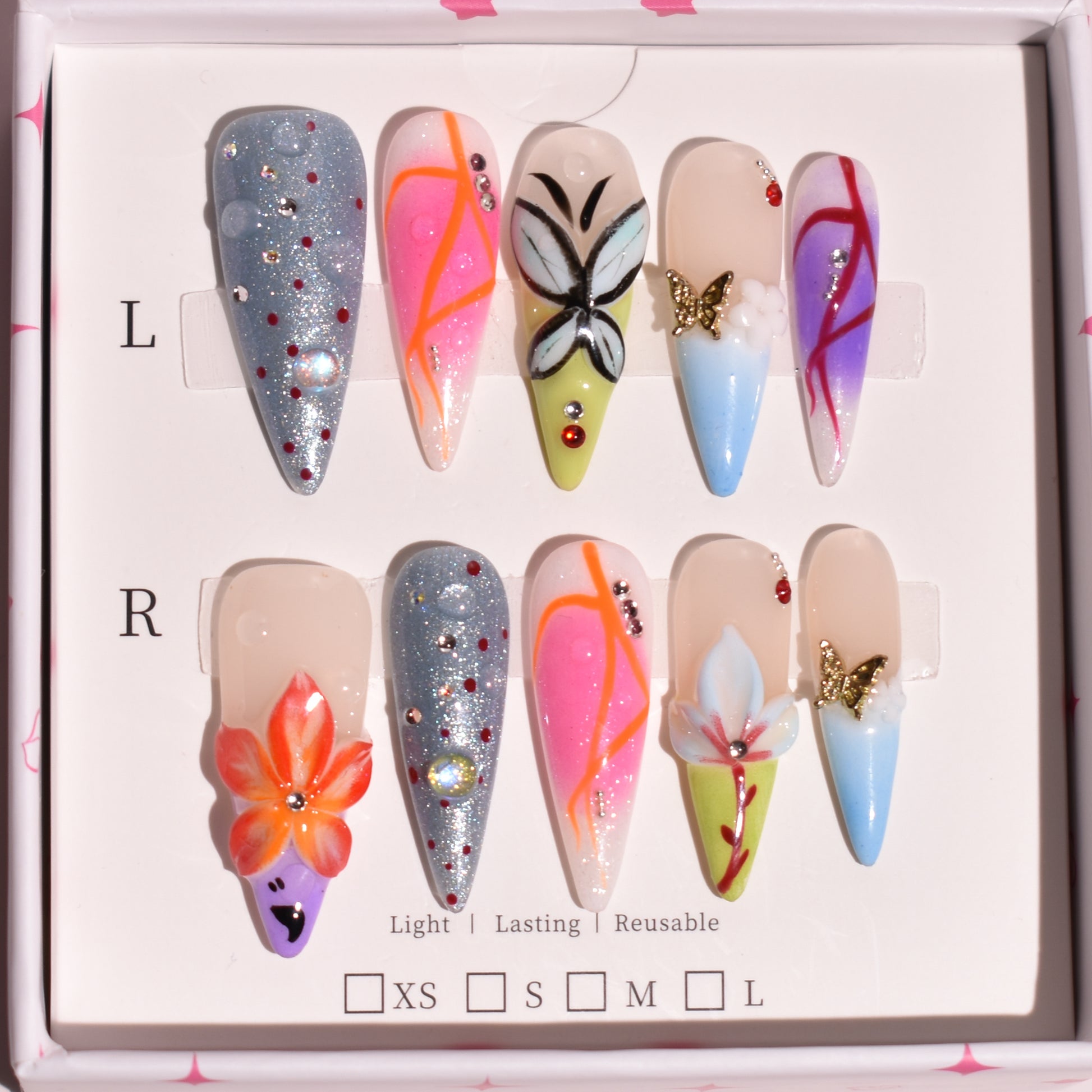 - Blings are available in XS, S, and M & L perfectly fitting different nail sizes and shapes.