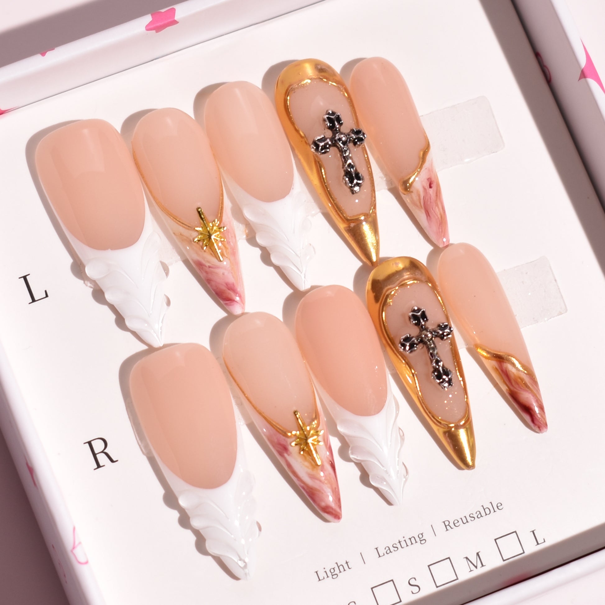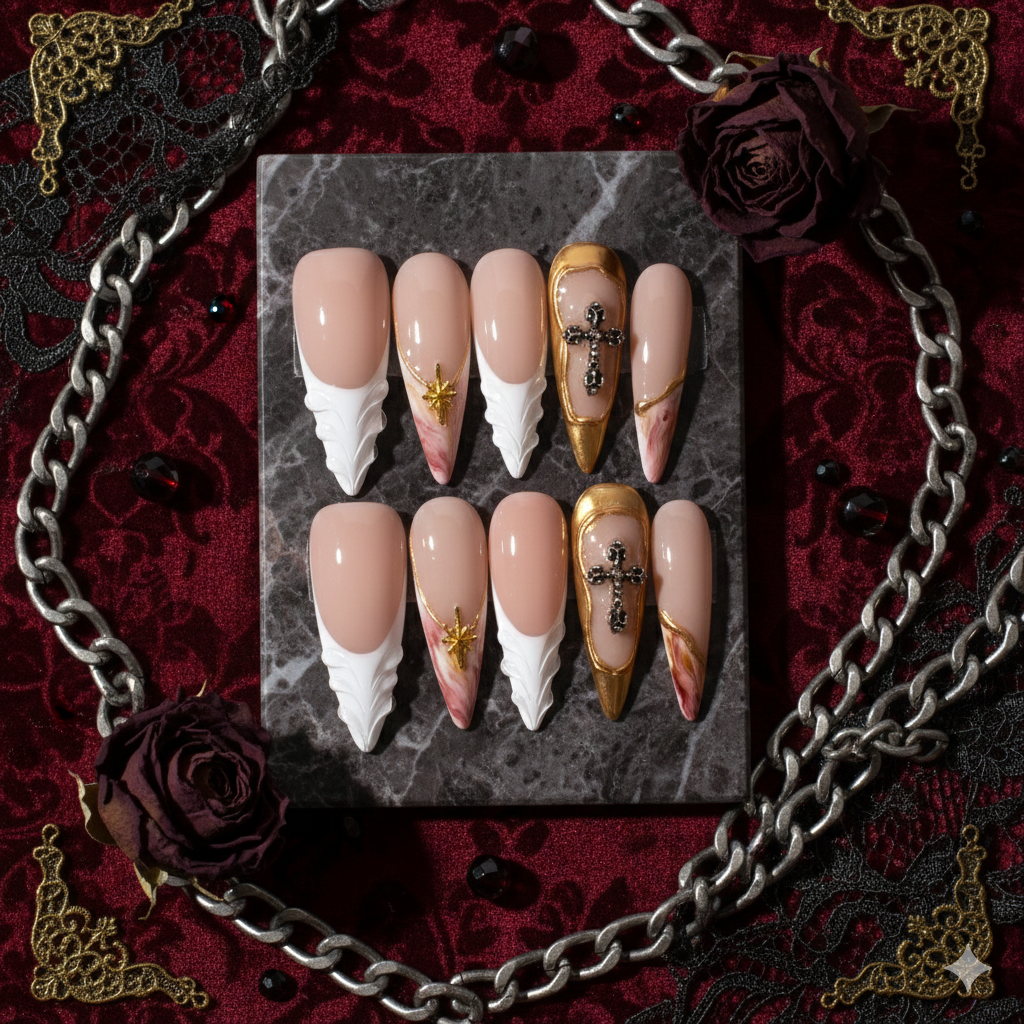 Gilded Oath is a dramatic long stiletto press-on nail set designed for impact. Featuring a soft nude base, sculpted white 3D detailing, molten gold chrome framing, and dimensional cross embellishments, this handcrafted set blends divine symbolism with high-fashion edge.