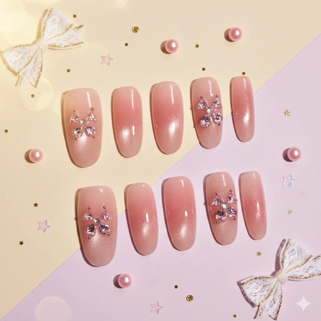 Designed in a medium coffin shape, each nail features a sheer blush nude base infused with fine shimmer that gives a smooth, glowing finish. Select accent nails are adorned with crystal butterfly motifs, set with pastel pink stones that feel dainty, balanced, and intentionally placed. The overall look stays clean and minimal, letting the soft shine and gentle embellishments do the talking.