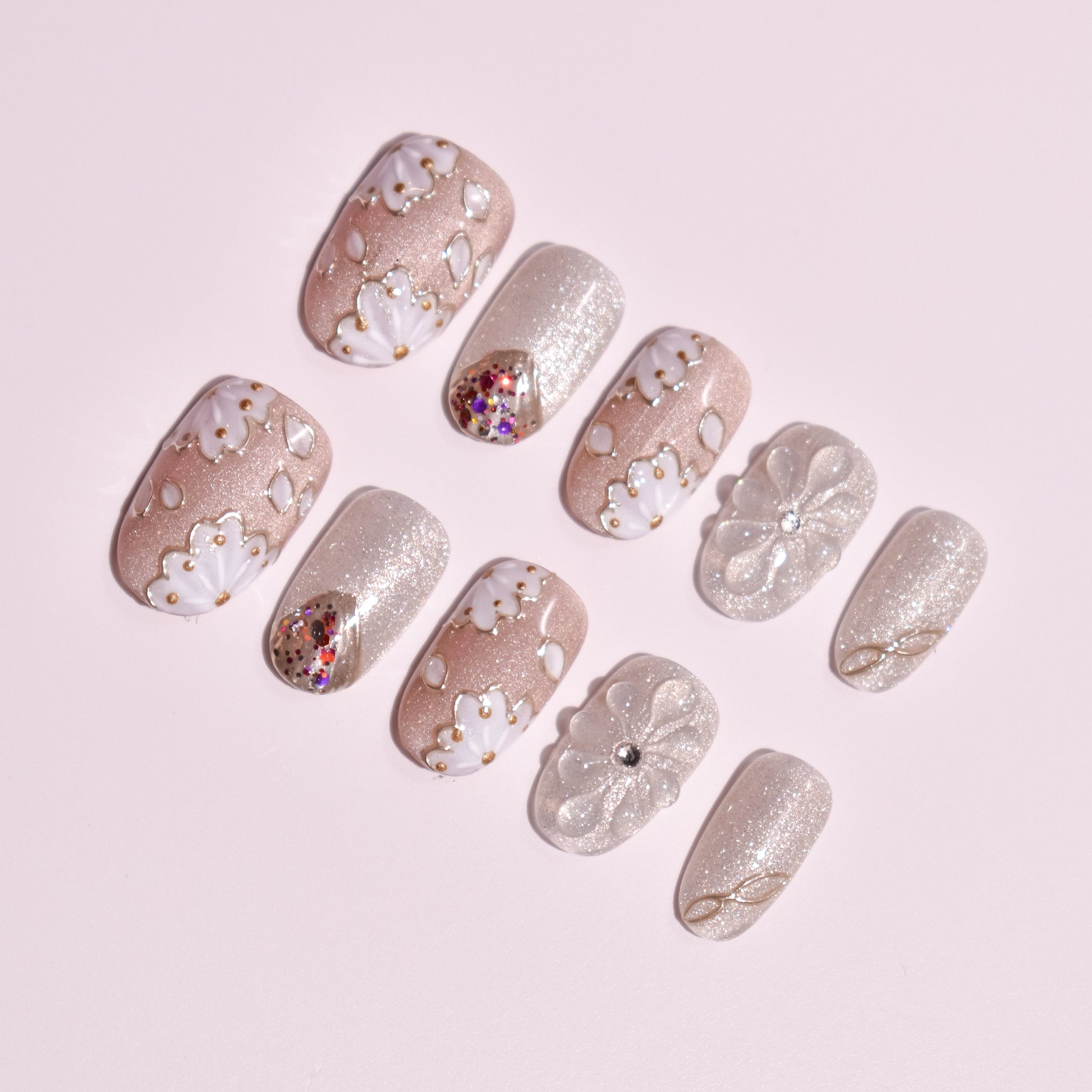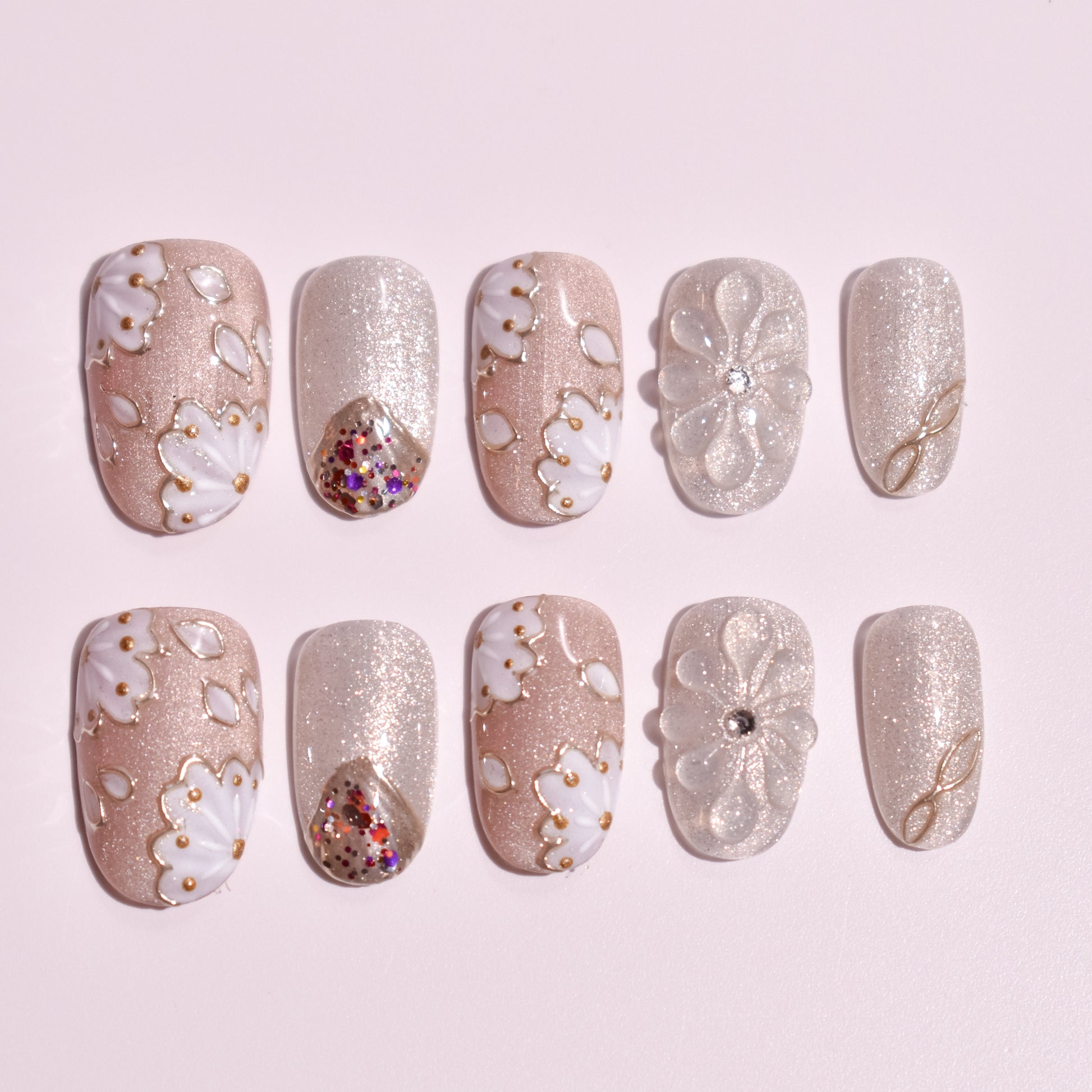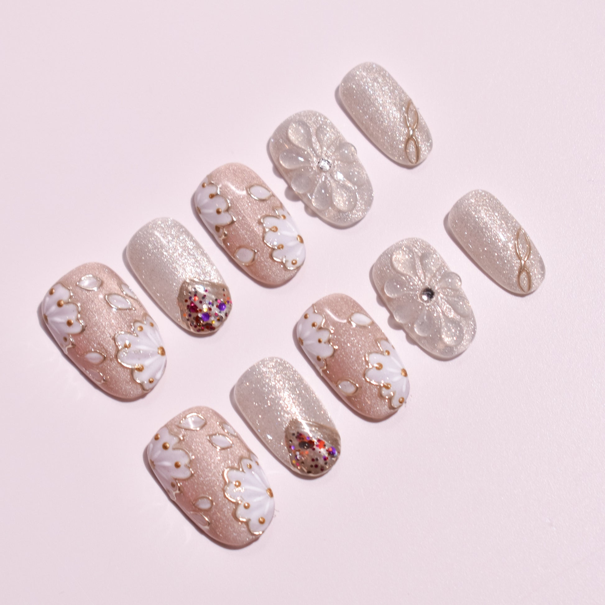 The essence of this Custom Japanese Nail Art set is found in its luminous textures and delicate, raised relief. Each nail is a hand-crafted masterpiece of Handmade Press-on Nails craftsmanship: