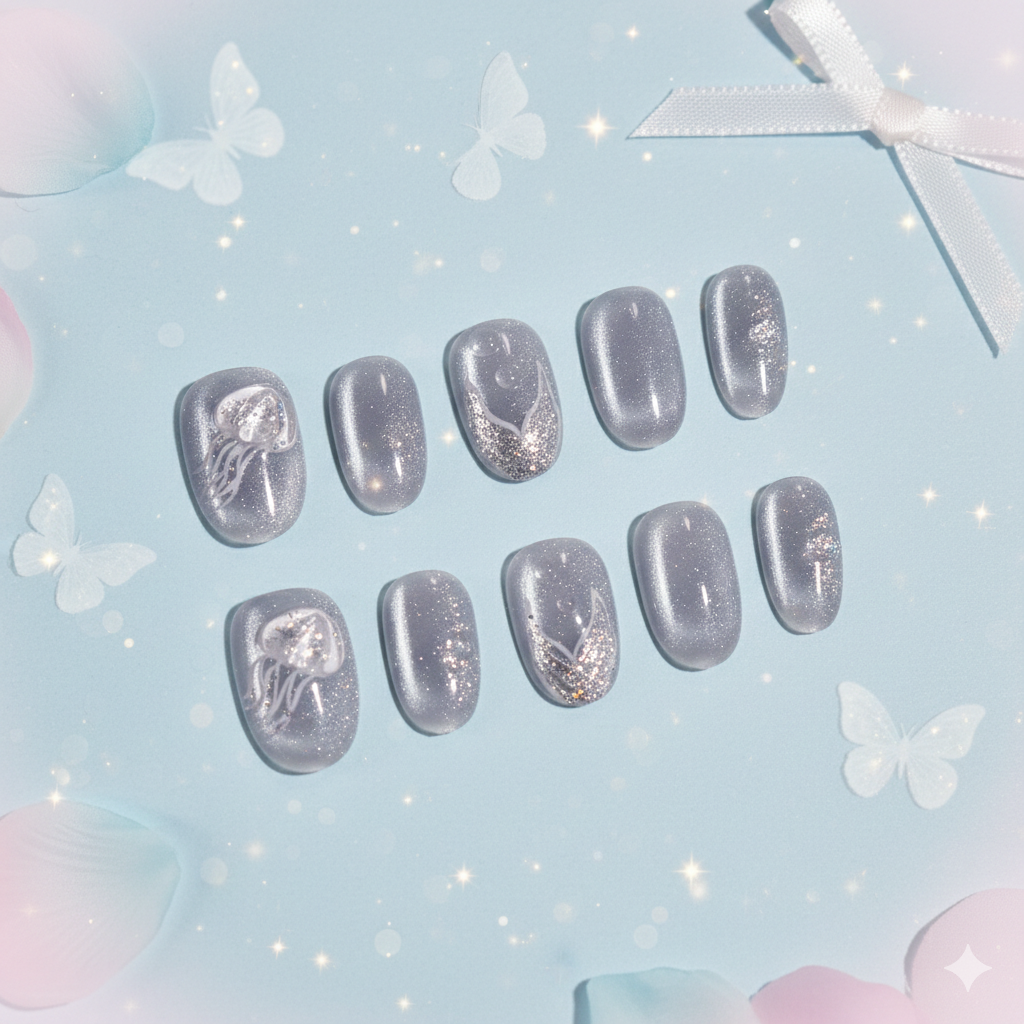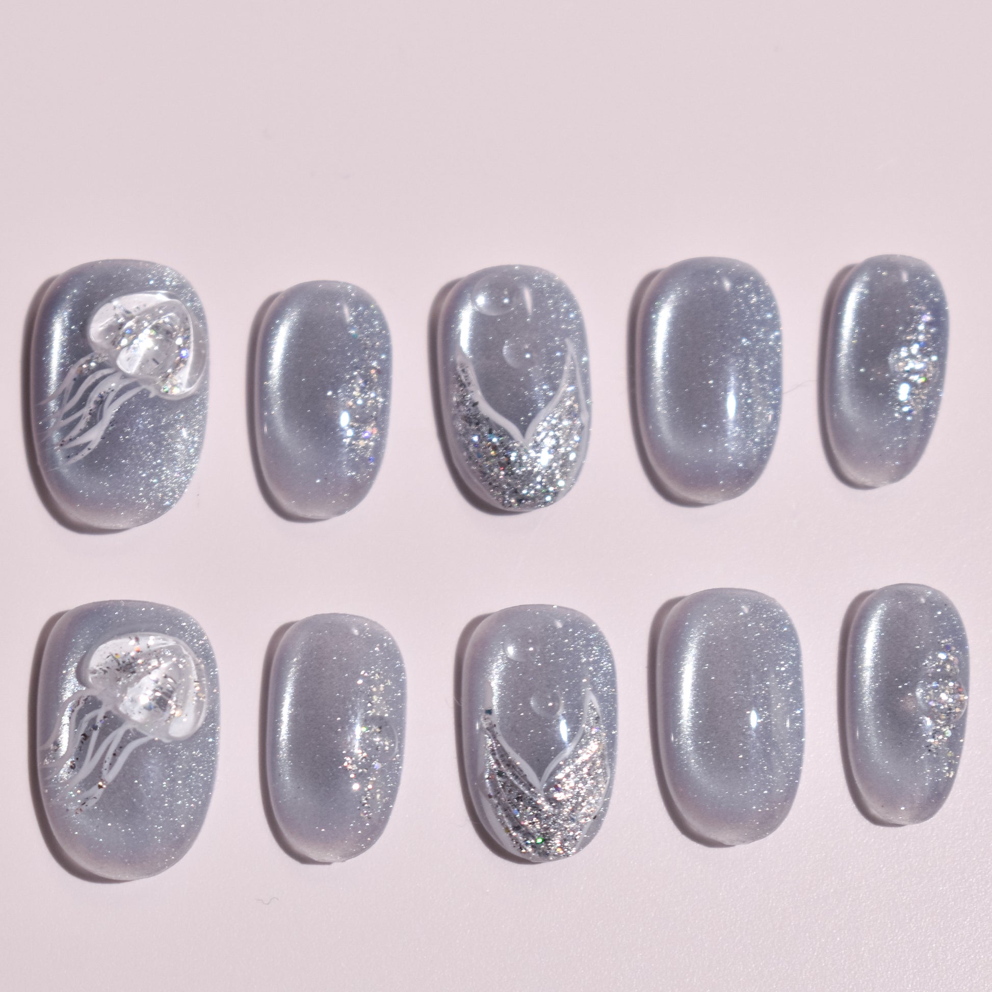 - 10 uniquely designed, hand-painted press-on nails made with high-quality UV gel.