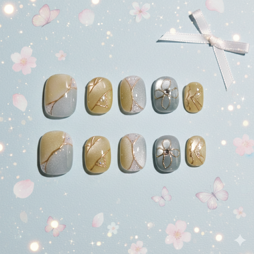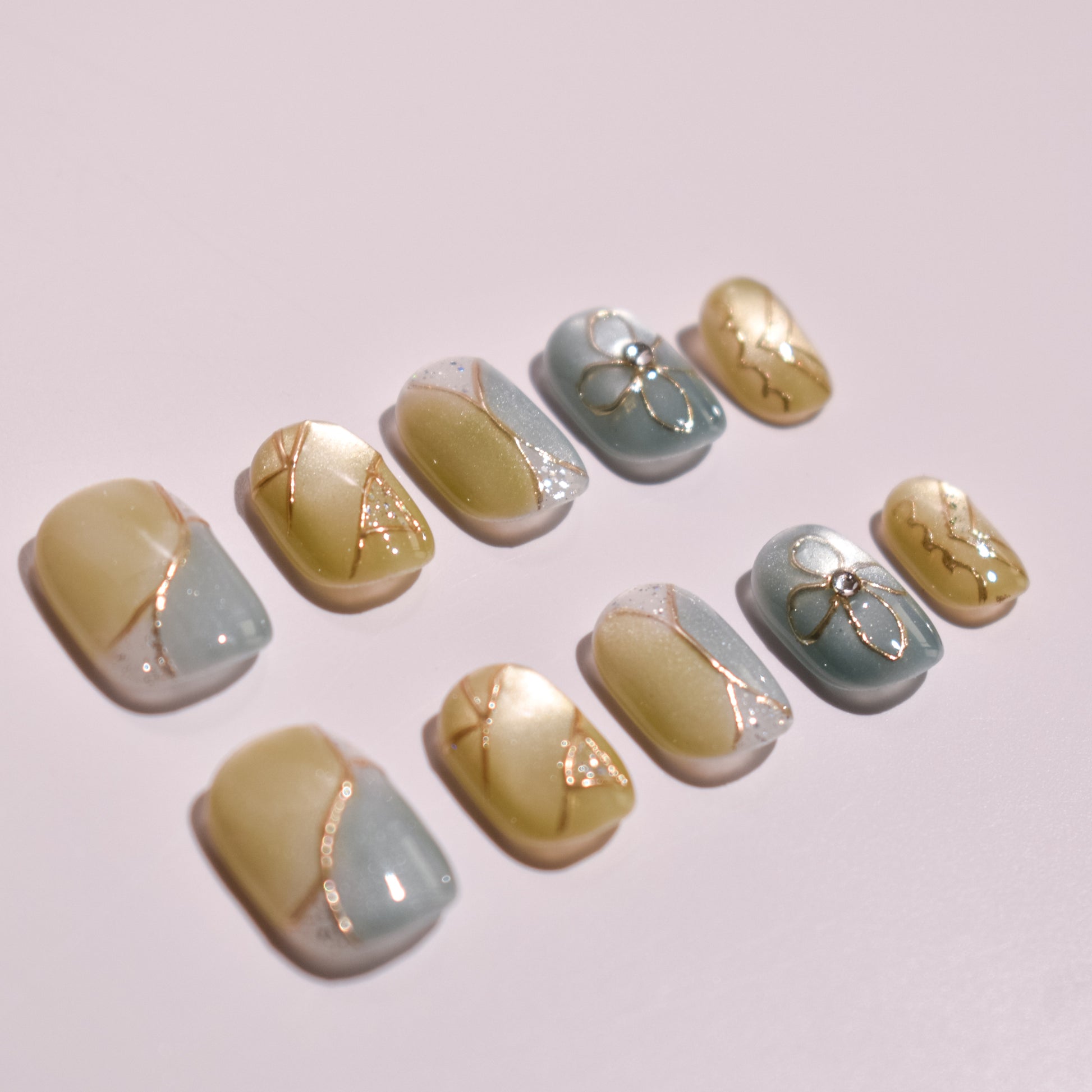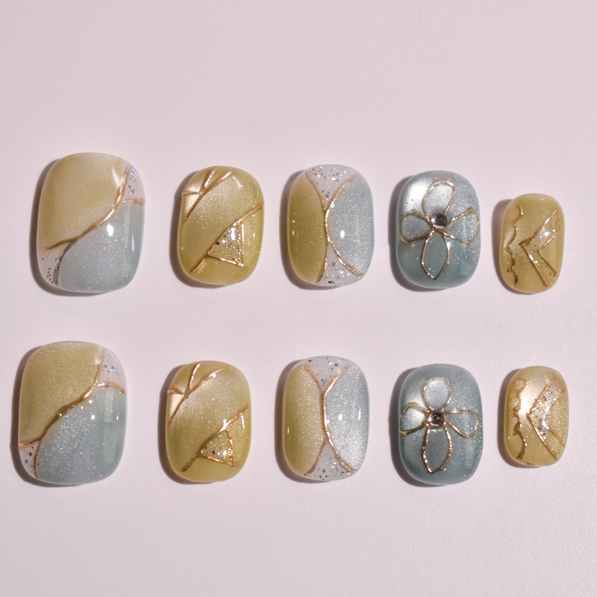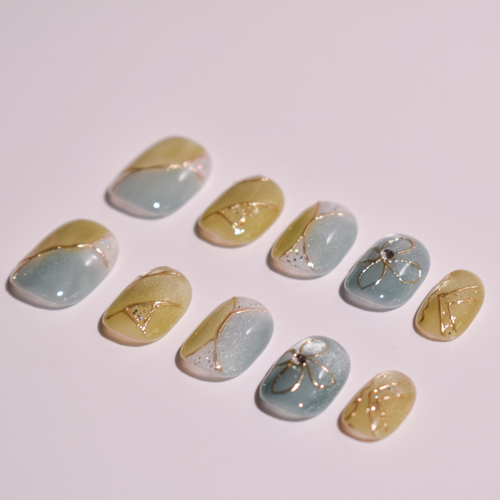 - 10 uniquely designed, hand-painted press-on nails made with high-quality UV gel.