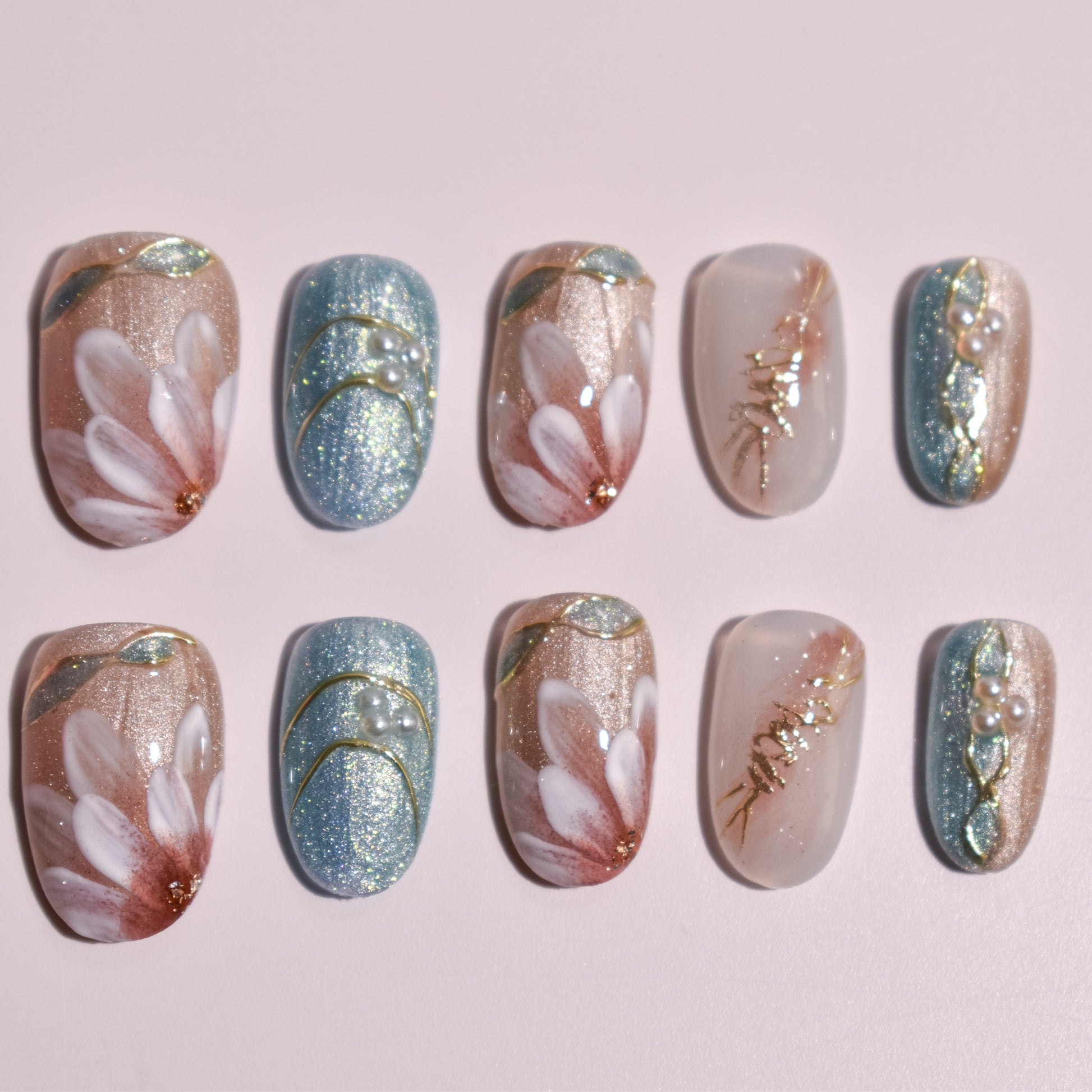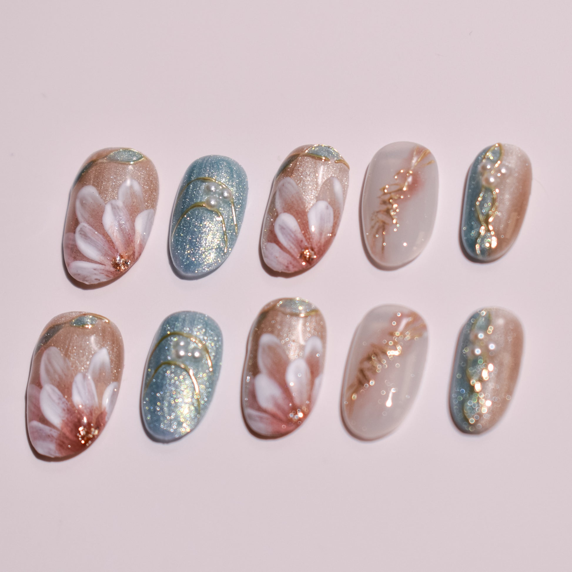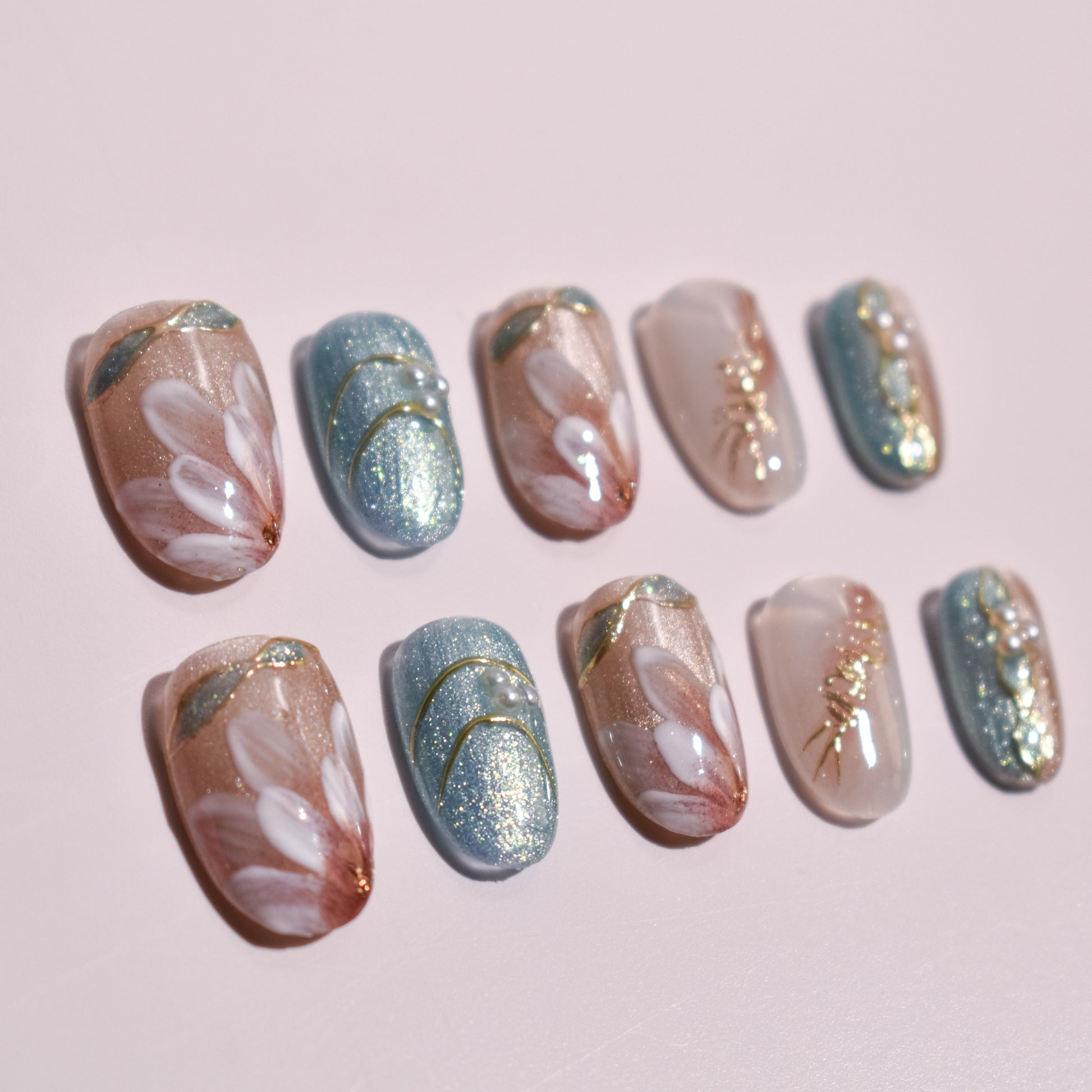 - 10 uniquely designed, hand-painted press-on nails made with high-quality UV gel.
