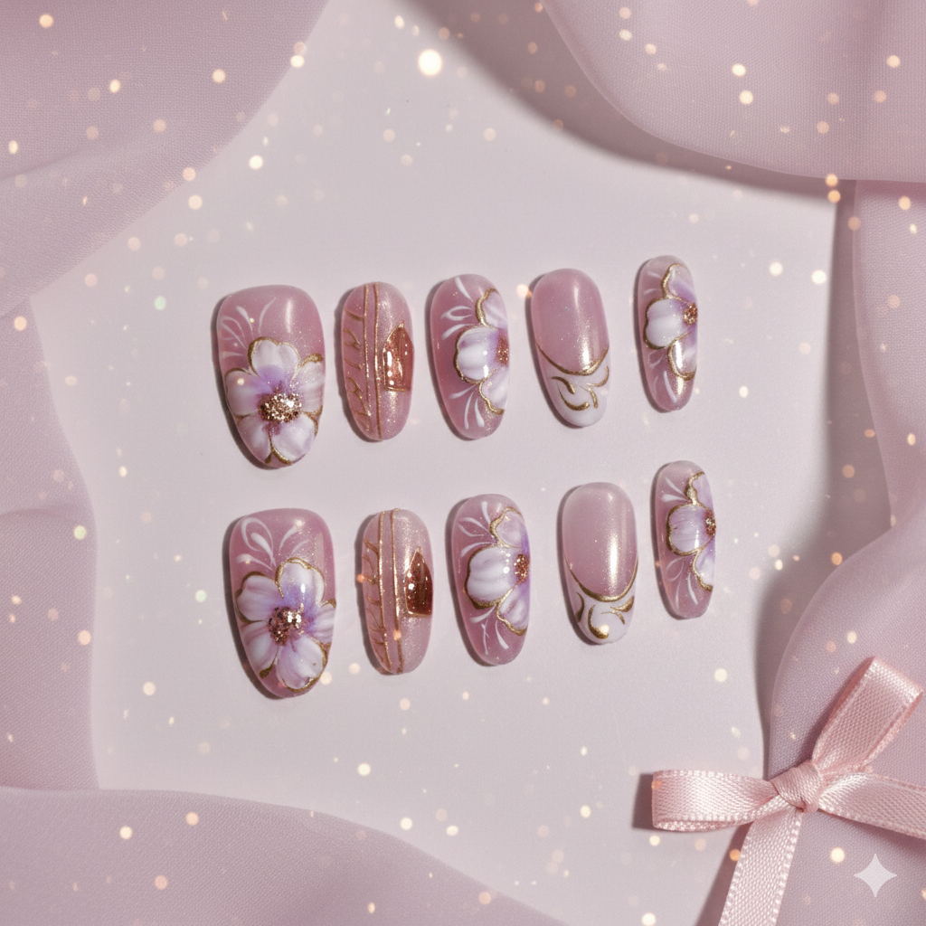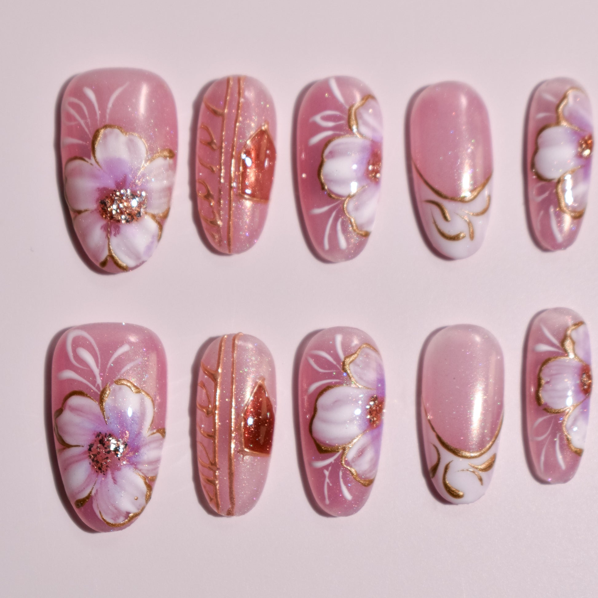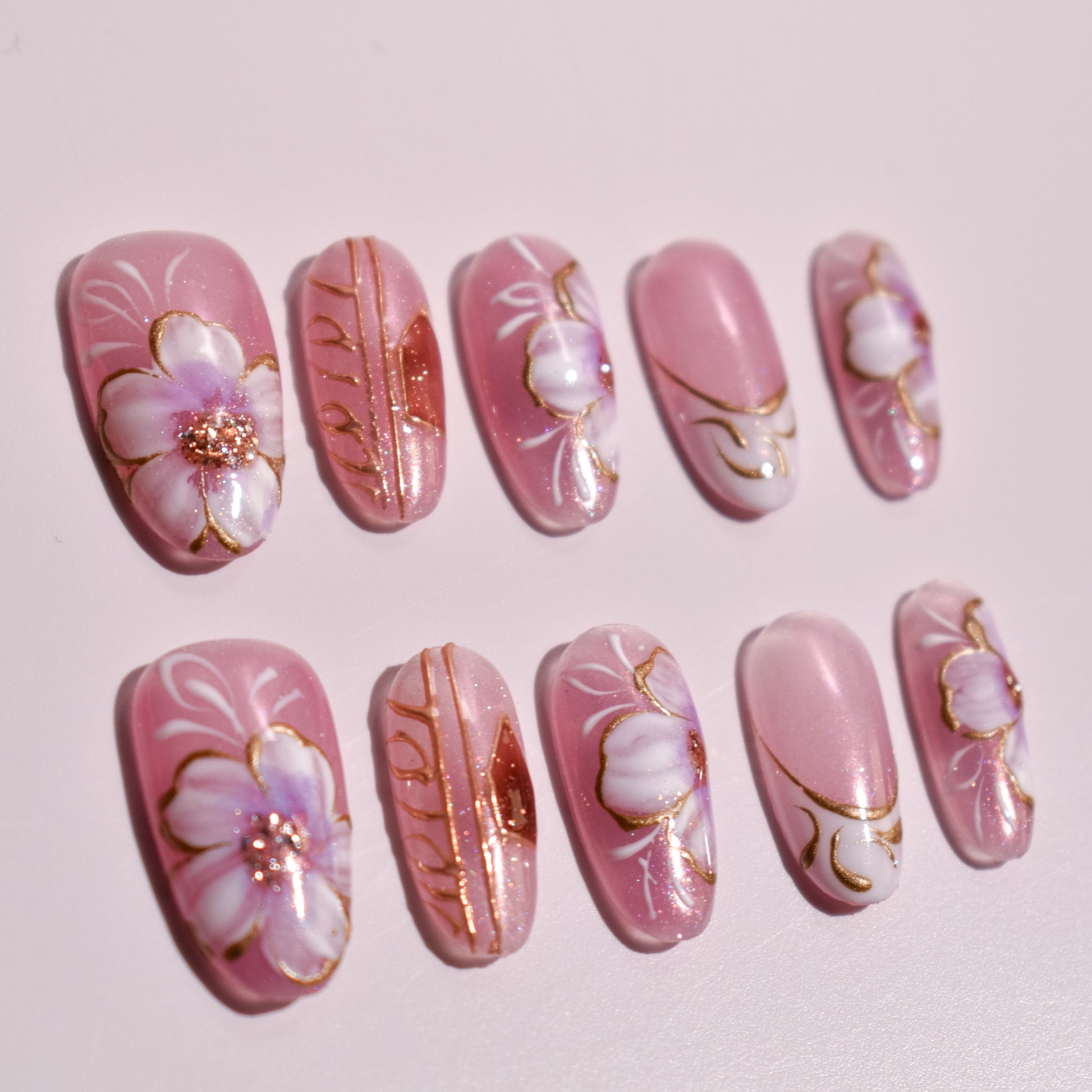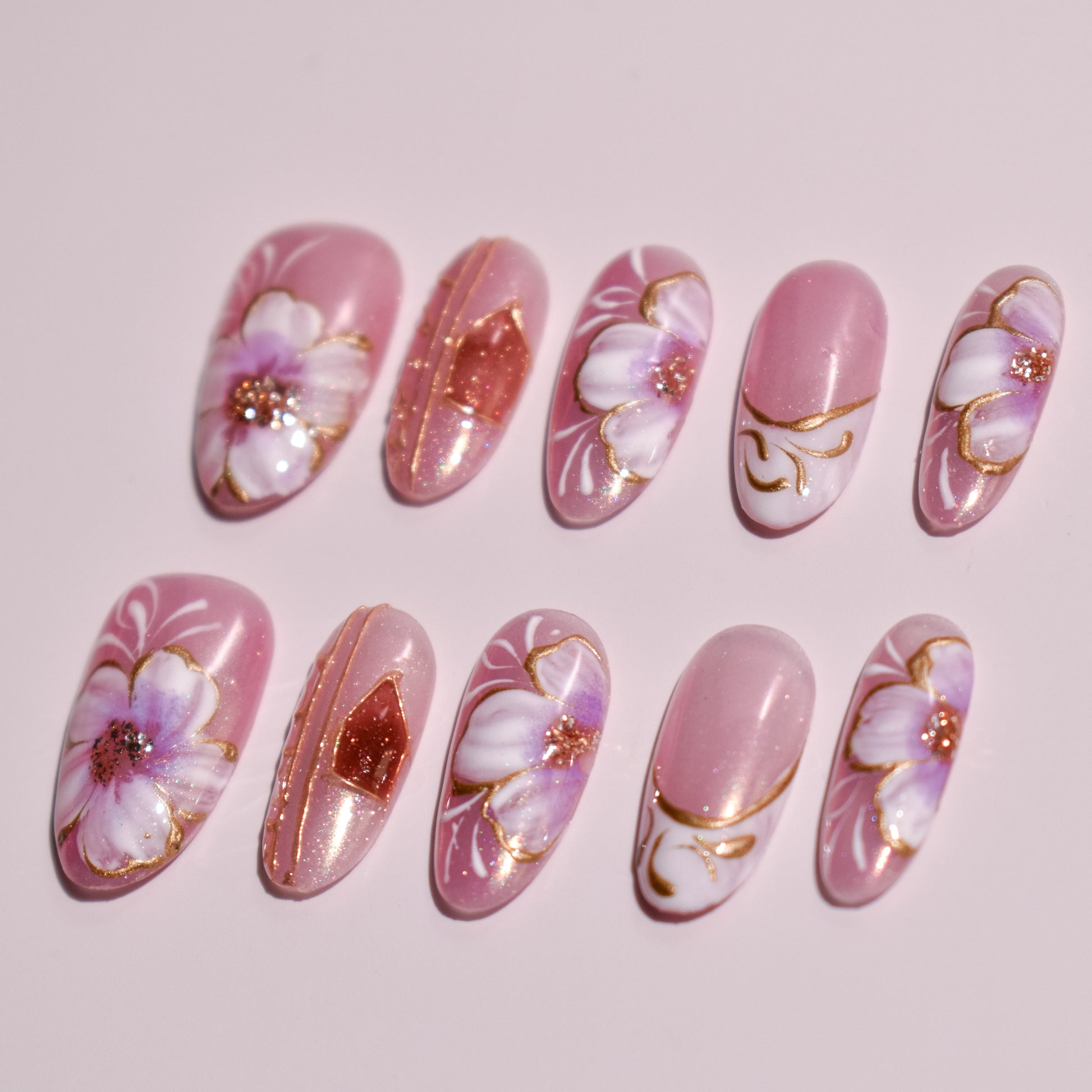 - 10 uniquely designed, hand-painted press-on nails made with high-quality UV gel.