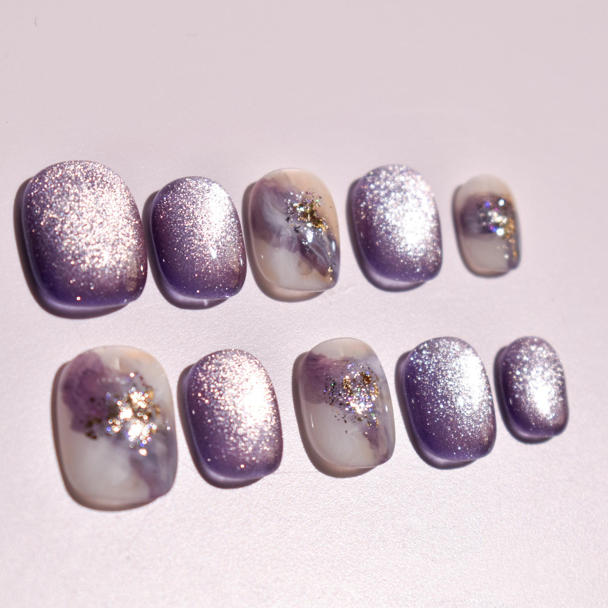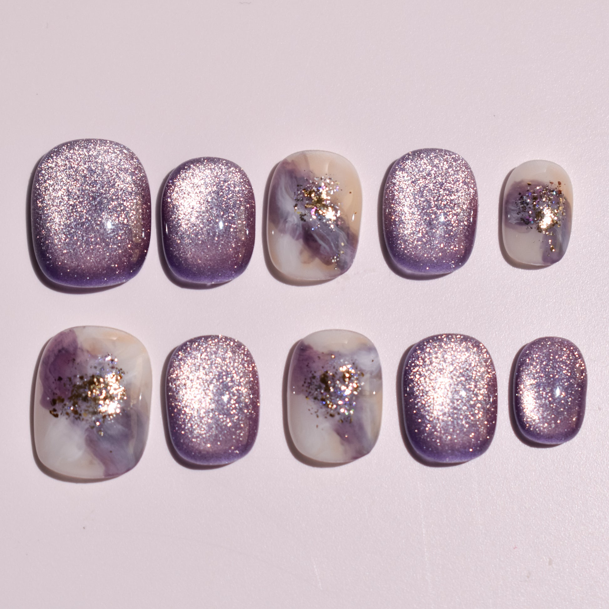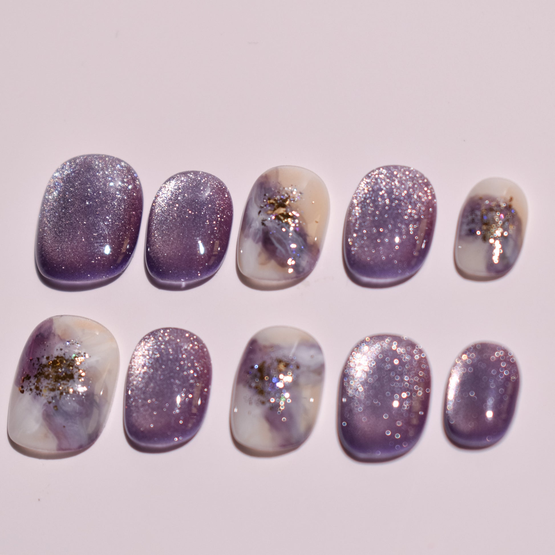 - 10 uniquely designed, hand-painted press-on nails made with high-quality UV gel.