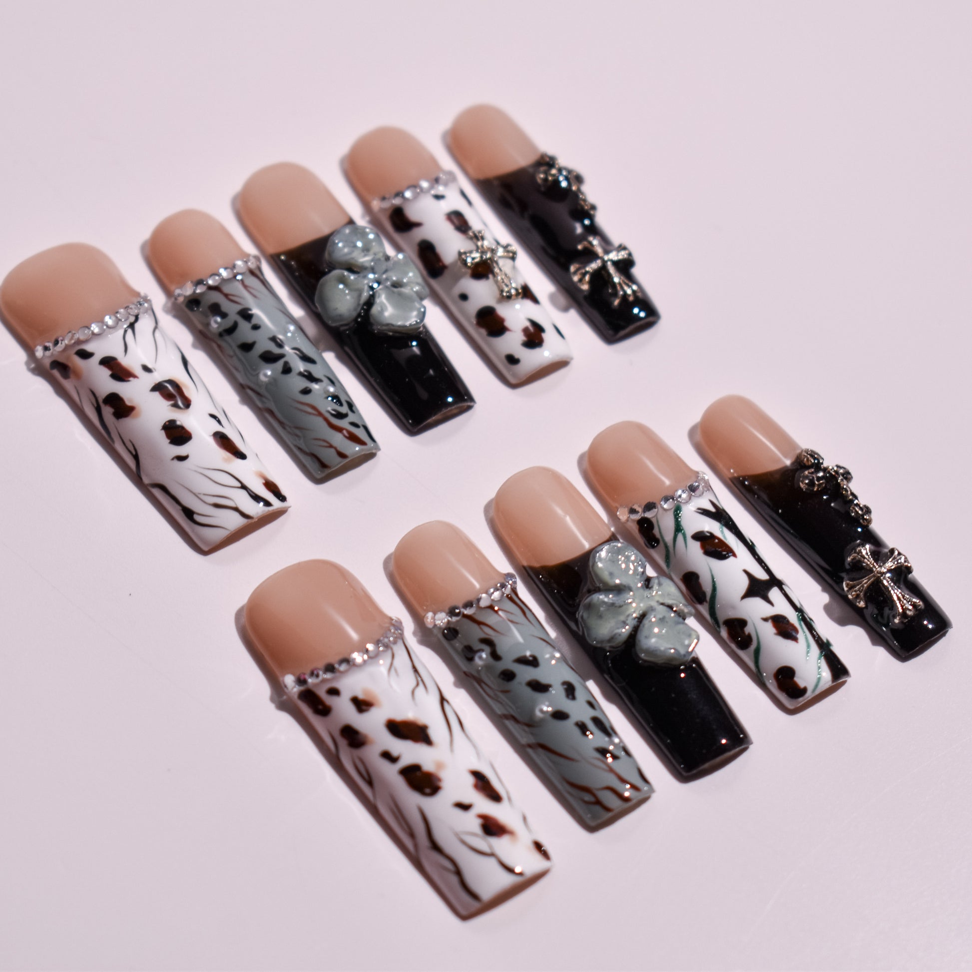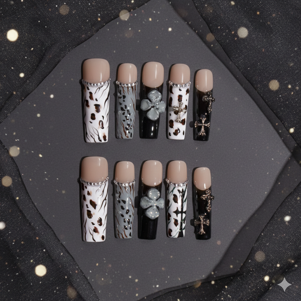The artistry is defined by a meticulous blend of hand-painted textures, including realistic leopard spots and jagged zebra-inspired linework. This modern take on Wafu style aesthetics is elevated by a series of opulent, three-dimensional embellishments. Each set is adorned with a line of shimmering crystals along the smile line, leading to dramatic focal points like oversized sculpted gel flowers in a slate-blue hue and vintage-inspired metallic silver crosses that add a touch of architectural weight to the dark aesthetic.