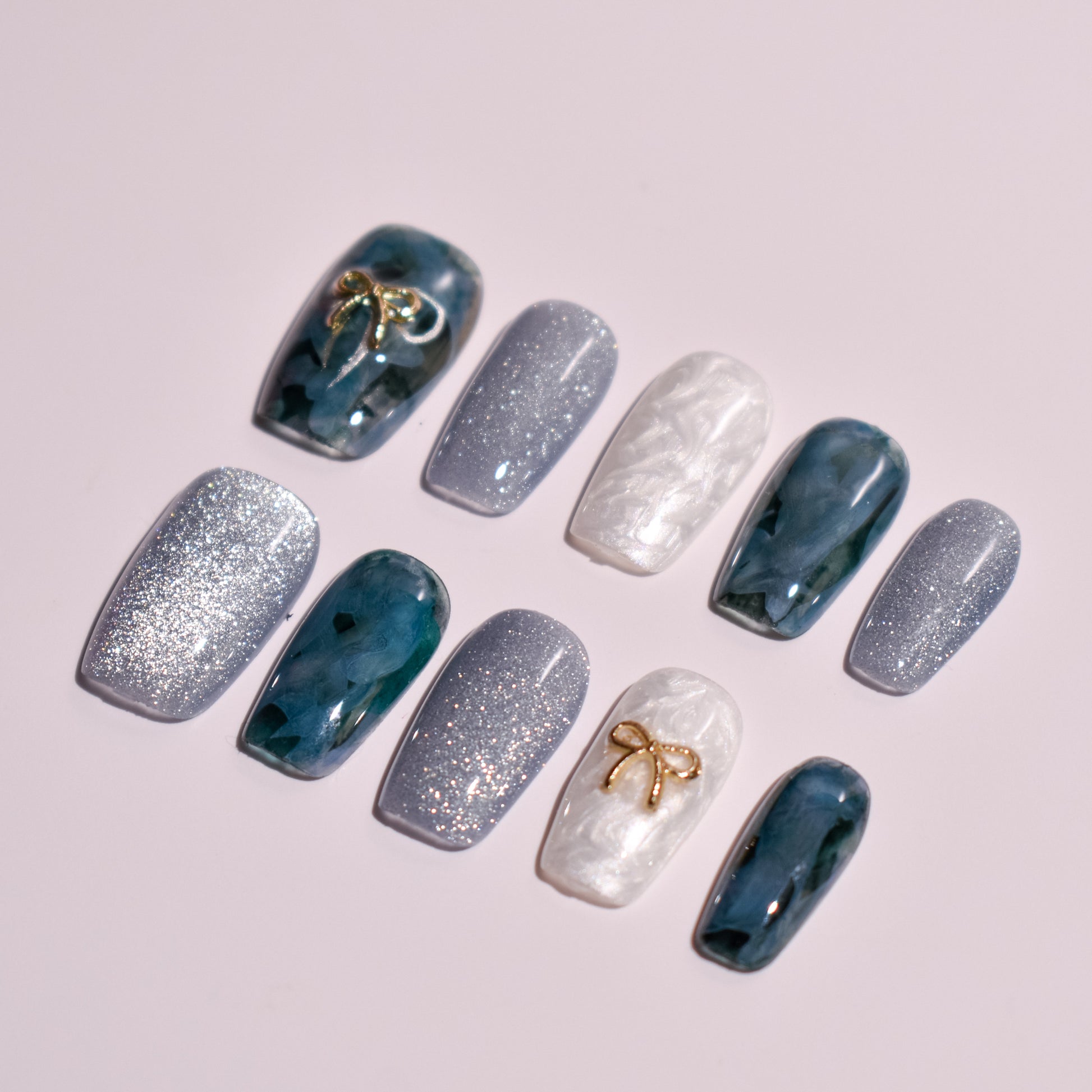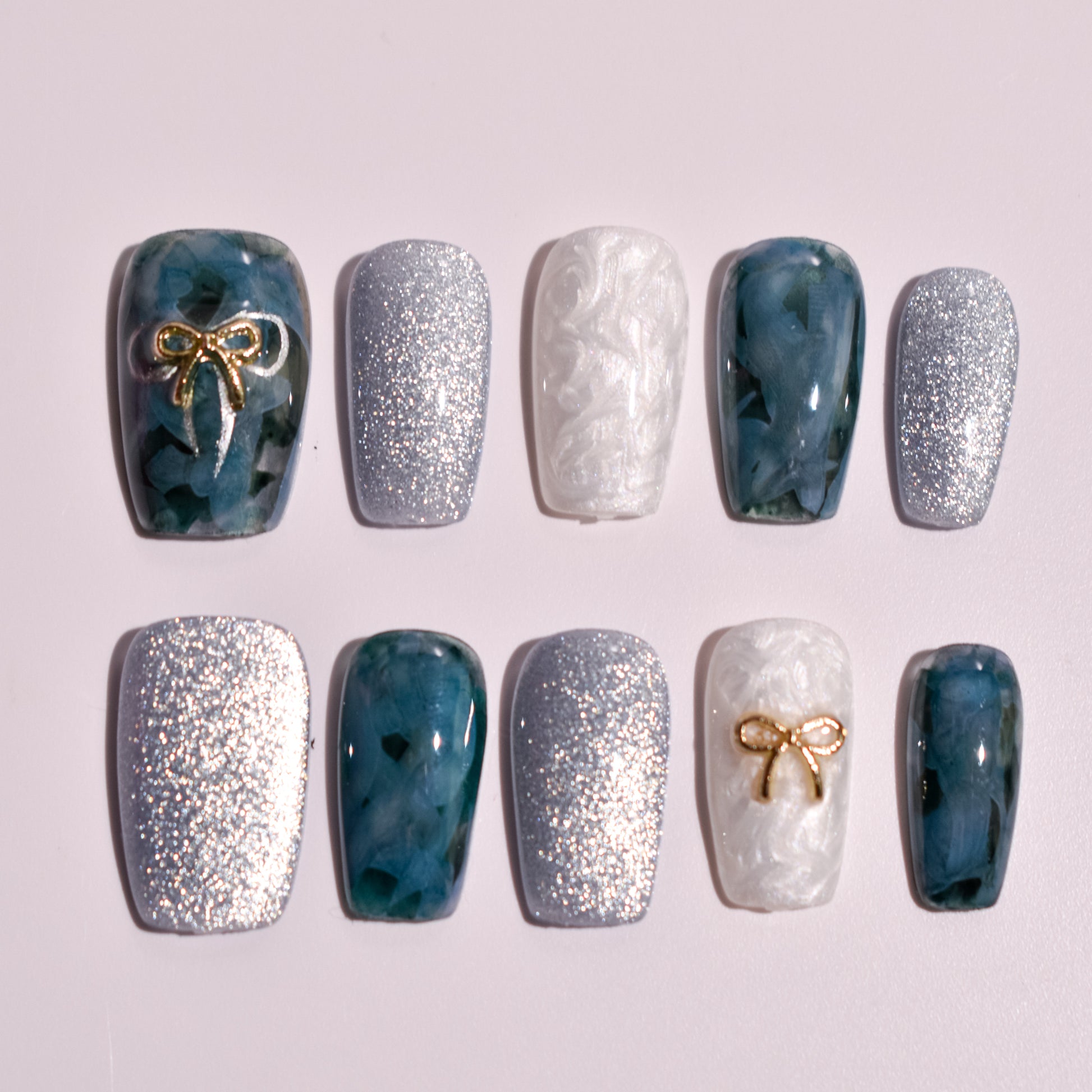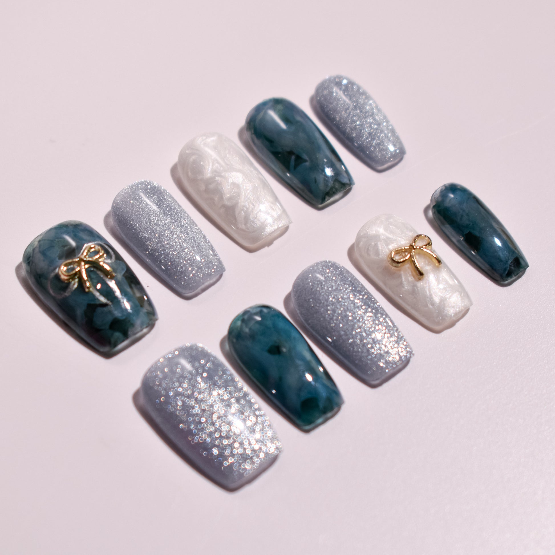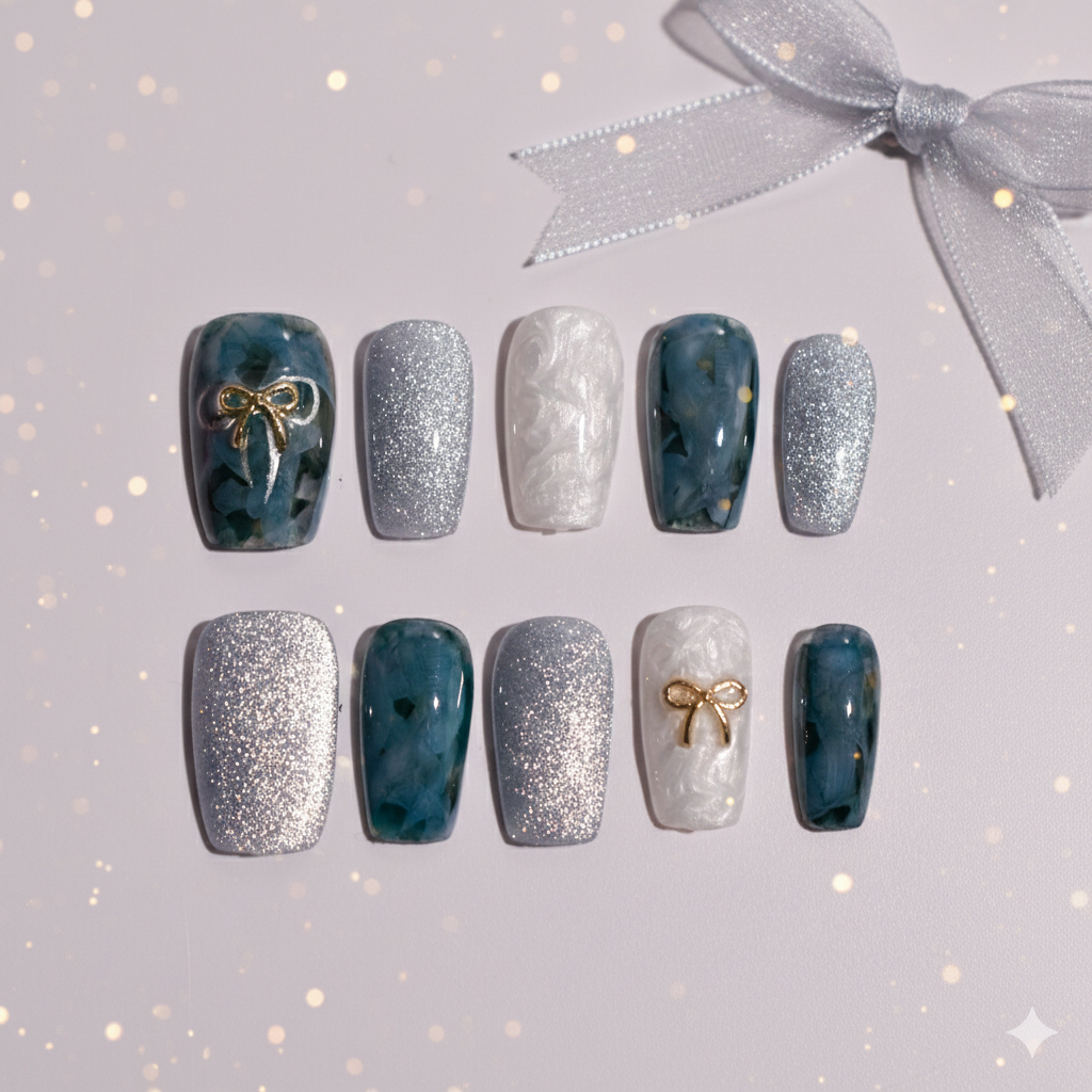 Each nail features a mix of high-impact textures and finishes, including hand-marbled teal patterns with organic depth, ultra-fine silver glitter nails for maximum sparkle, and pearlescent white accents with subtle swirl detailing. Select nails are adorned with sculpted gold bow embellishments, applied using precision gel techniques for a raised, dimensional effect. The marbling and shimmer are achieved through controlled gel layering, ensuring smooth transitions, rich saturation, and a seamless, couture-level finish.