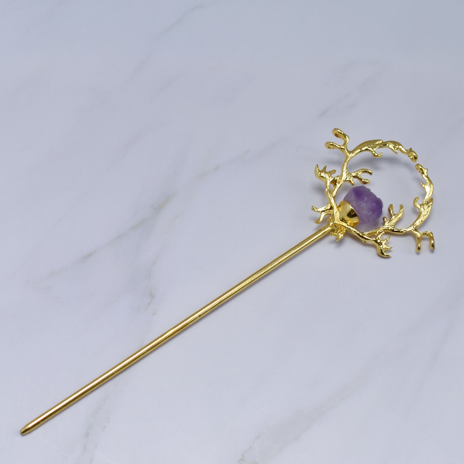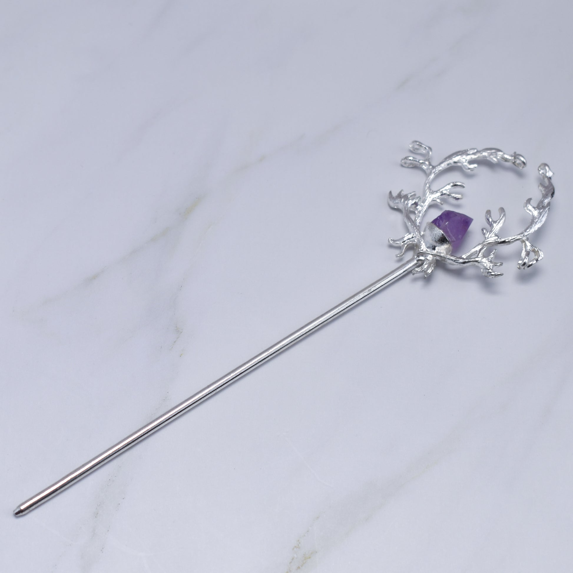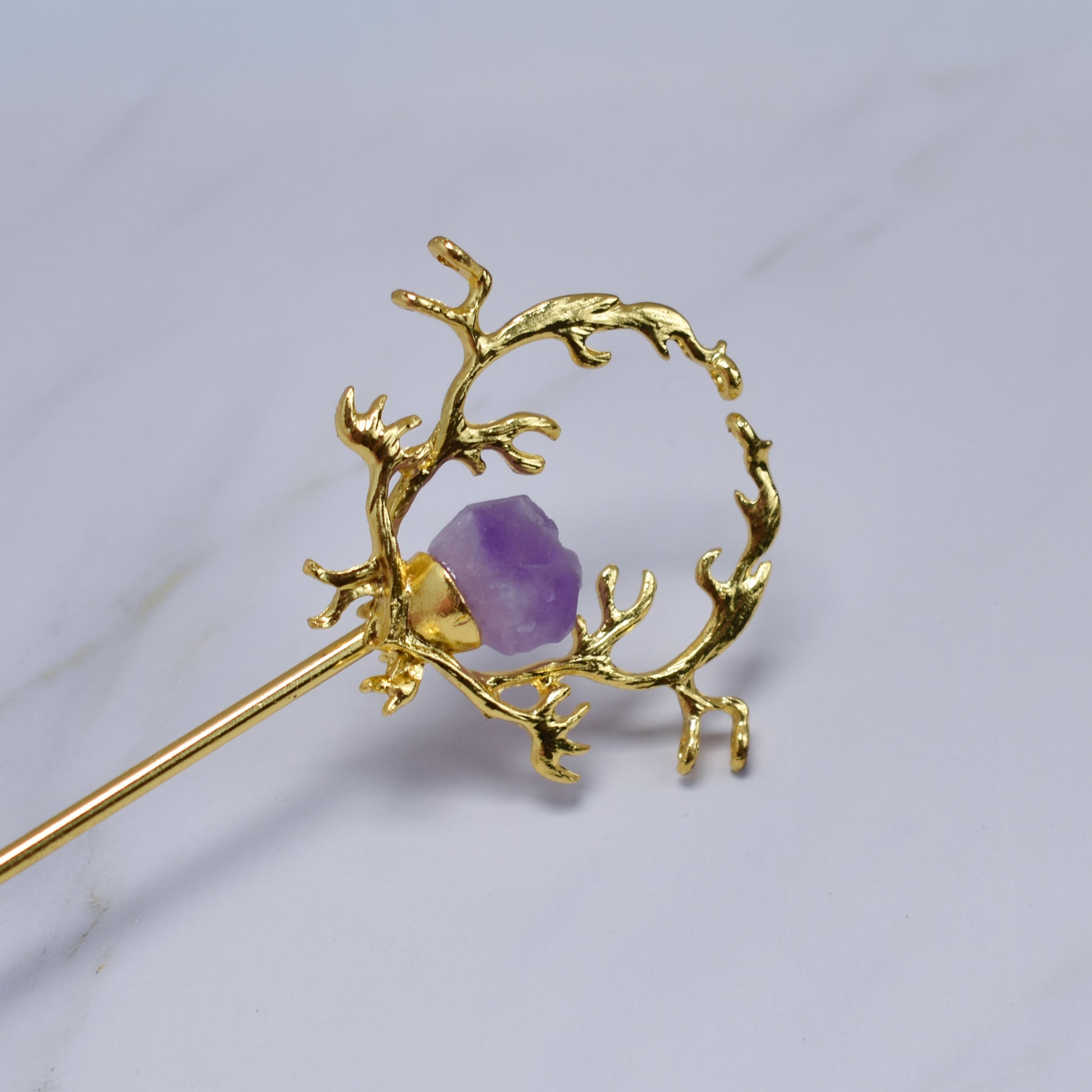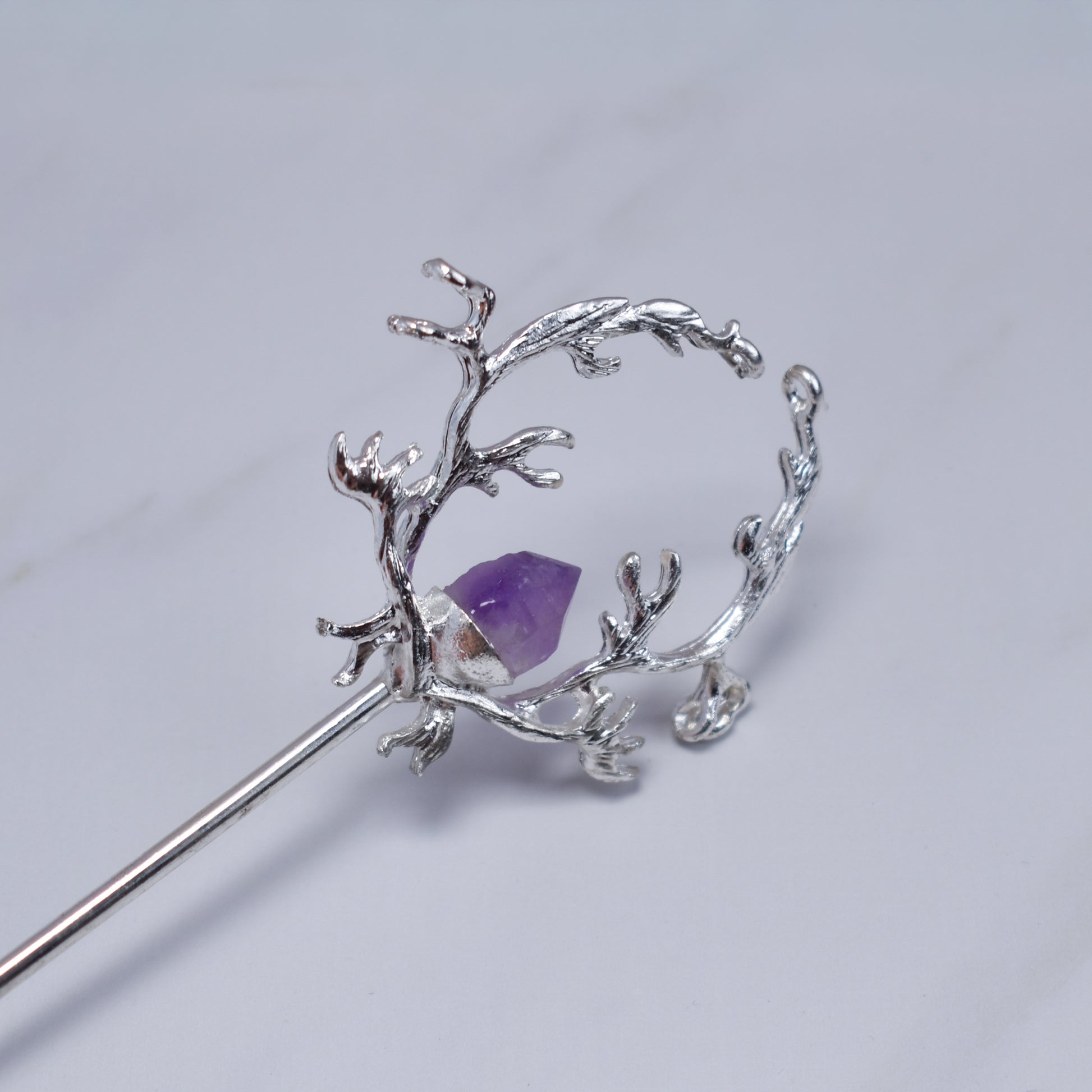 Step into a world of fantasy elegance with the Enchanted Grove Amethyst Hairpin. Designed with a striking branch-shaped halo, this piece frames a raw amethyst crystal at its center—creating a magical blend of nature, artistry, and gemstone beauty. The open circular branch design resembles an enchanted forest wreath, making it the perfect statement accessory for lovers of fairytale, vintage, or mystical aesthetics.