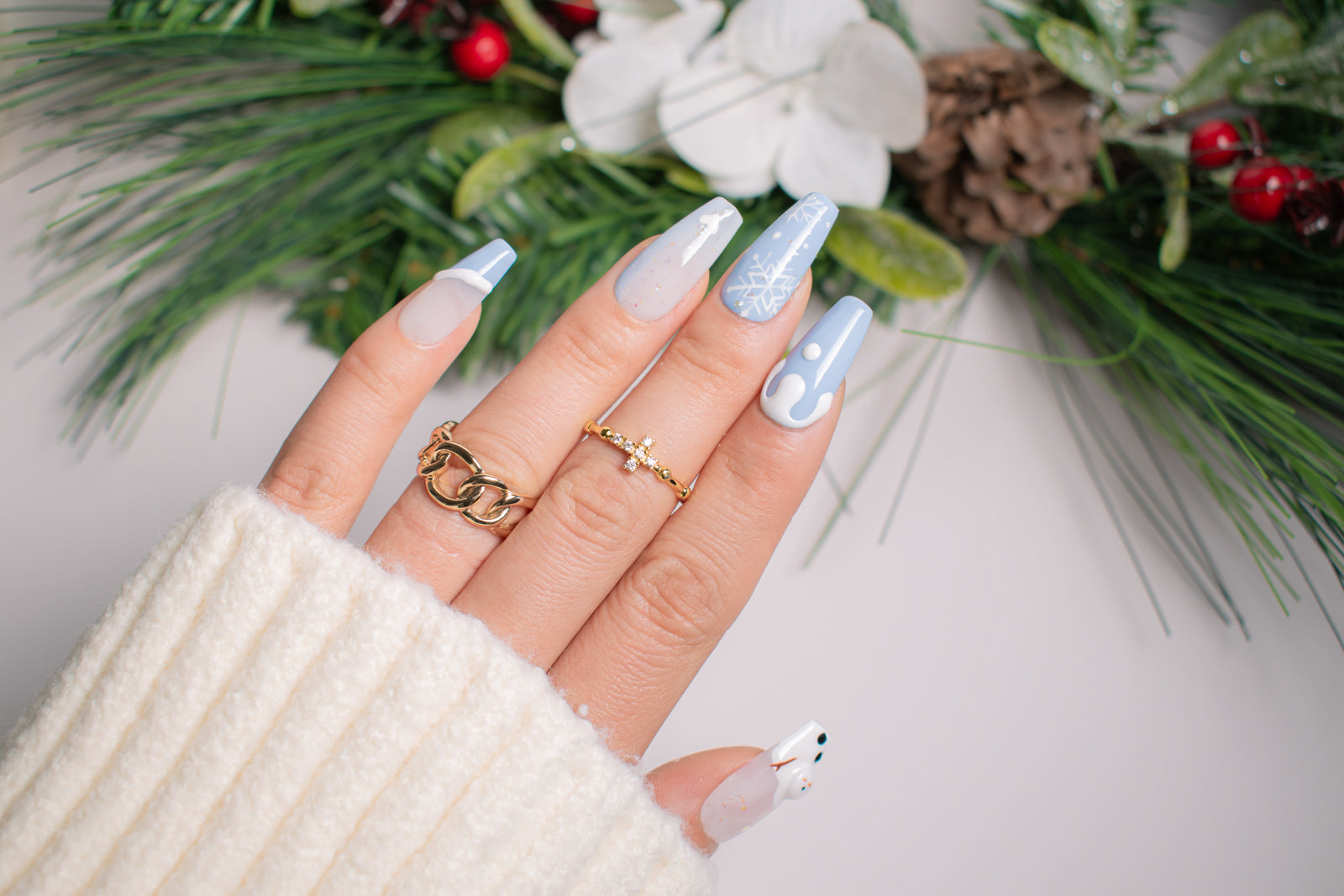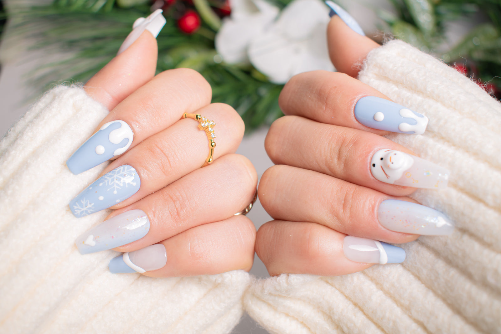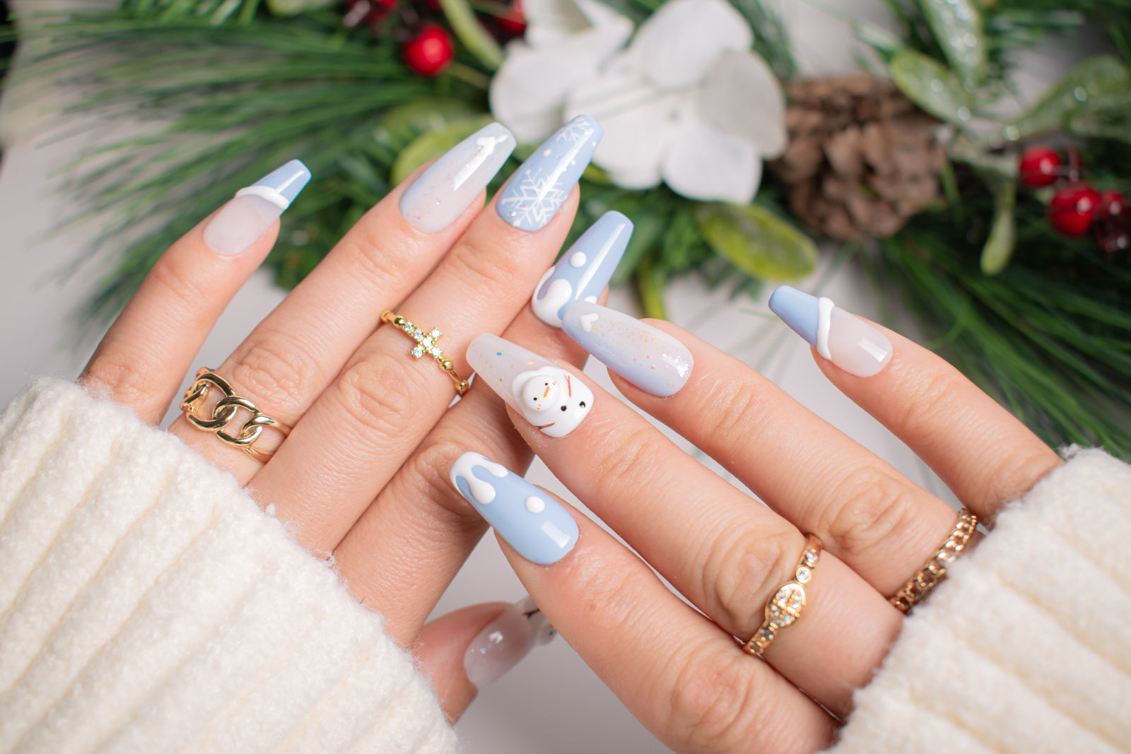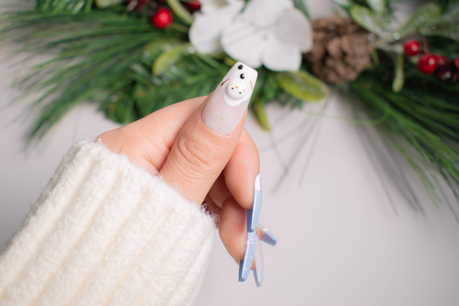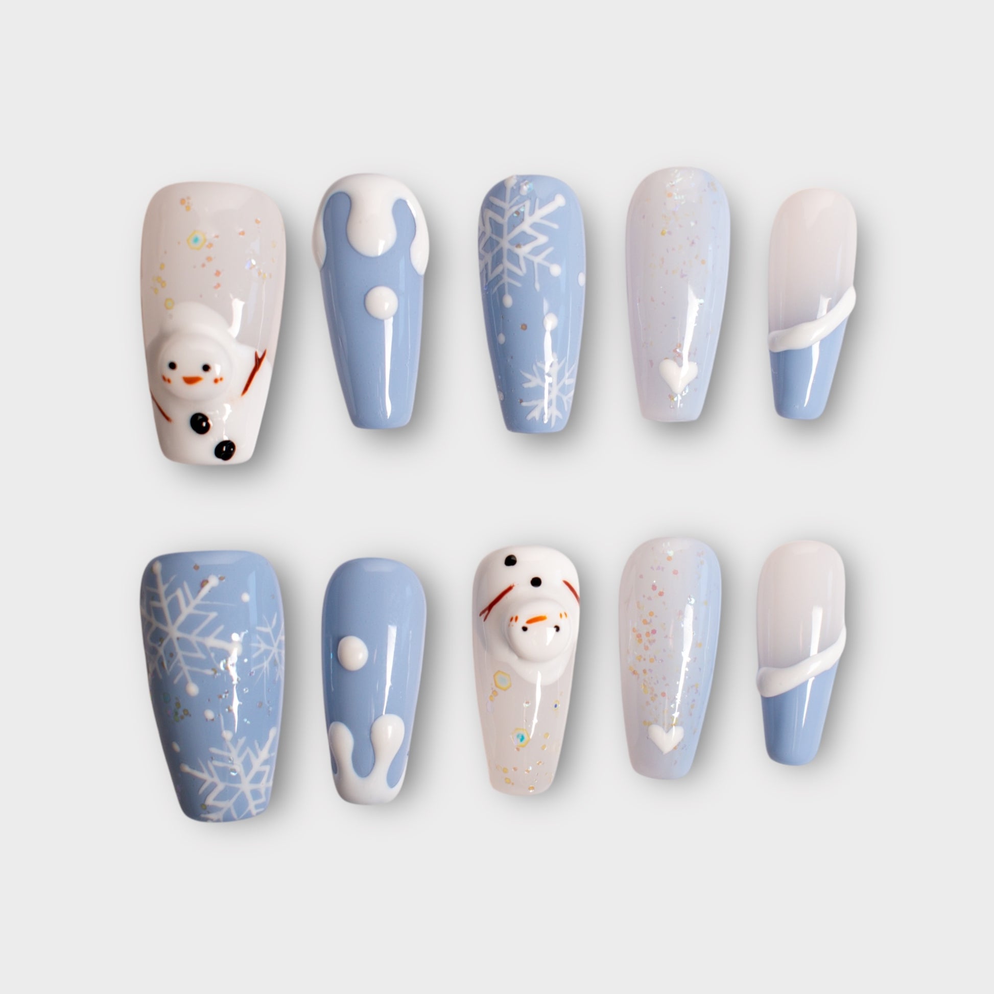 Step into a winter fairytale with Frosty Wonderland. These nails capture the magic of the season with charming hand-painted snowmen, delicate white snowflakes, and glittering accents on a serene blue and white base. Perfect for showcasing your holiday spirit in style!