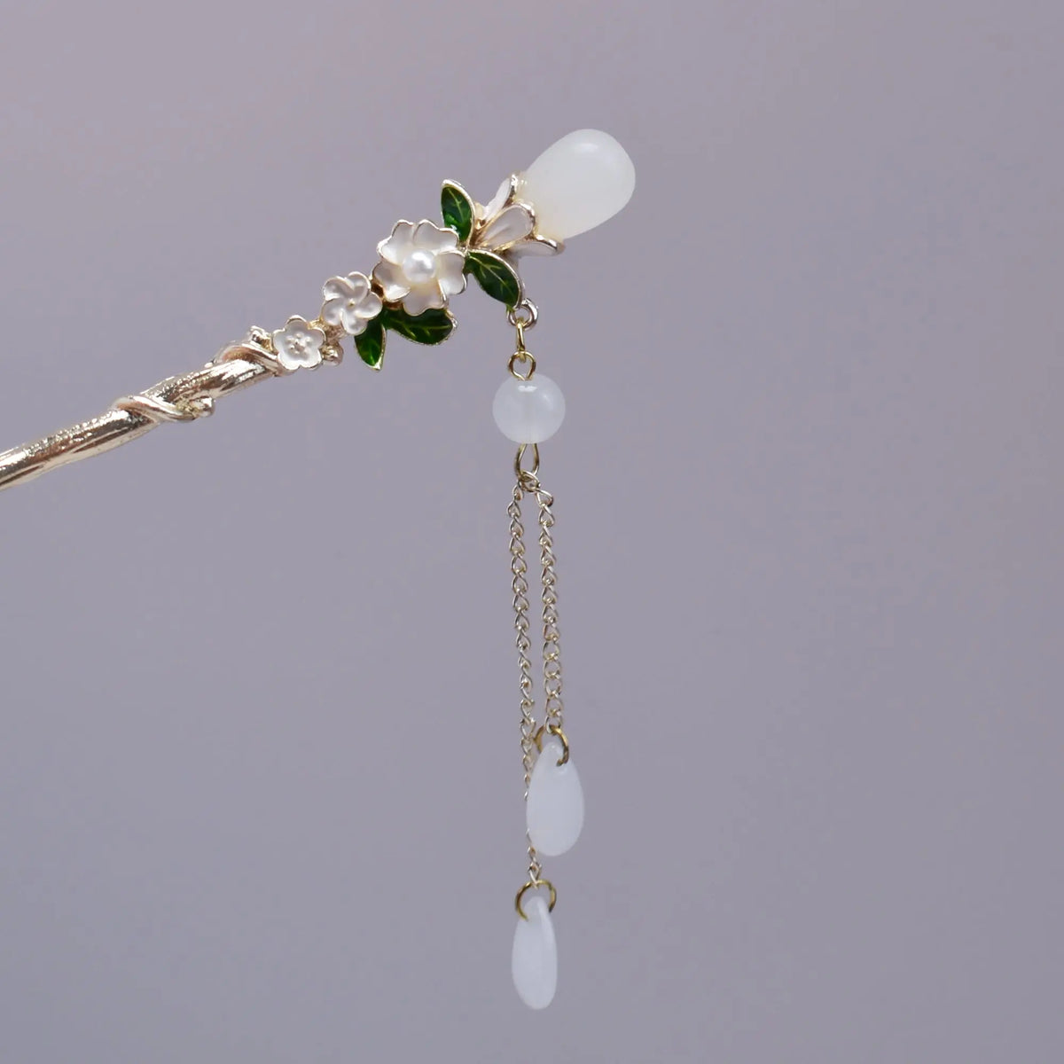 Elegant, romantic, and inspired by nature—our Garden Blossom Droplet Tassel Hairpin brings a soft floral charm to any hairstyle. Designed with detailed enamel flowers, glossy green leaves, and a smooth gemstone-style top bead, this piece captures the delicate beauty of a spring garden.