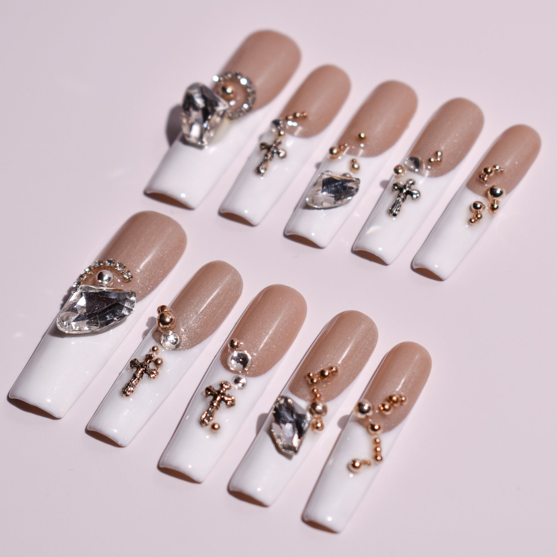 Step into a realm of high-fashion divinity with this meticulously crafted set of handmade press-on nails. Designed for the modern trendsetter who values architectural detail, these nails feature a sophisticated long square silhouette that provides a bold canvas for intricate artistry. The design showcases a contemporary take on the classic French manicure, utilizing a shimmering champagne-gold glitter base at the cuticle that transitions into a crisp, solid white tip with a high-gloss, professional finish.