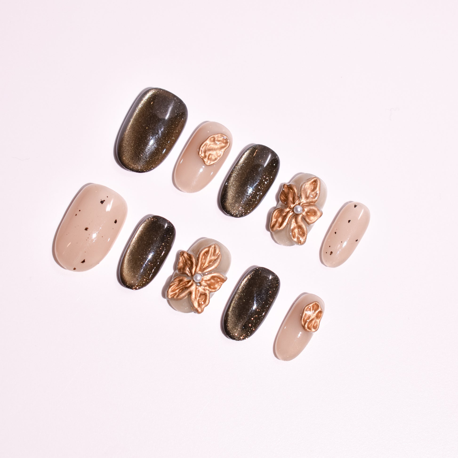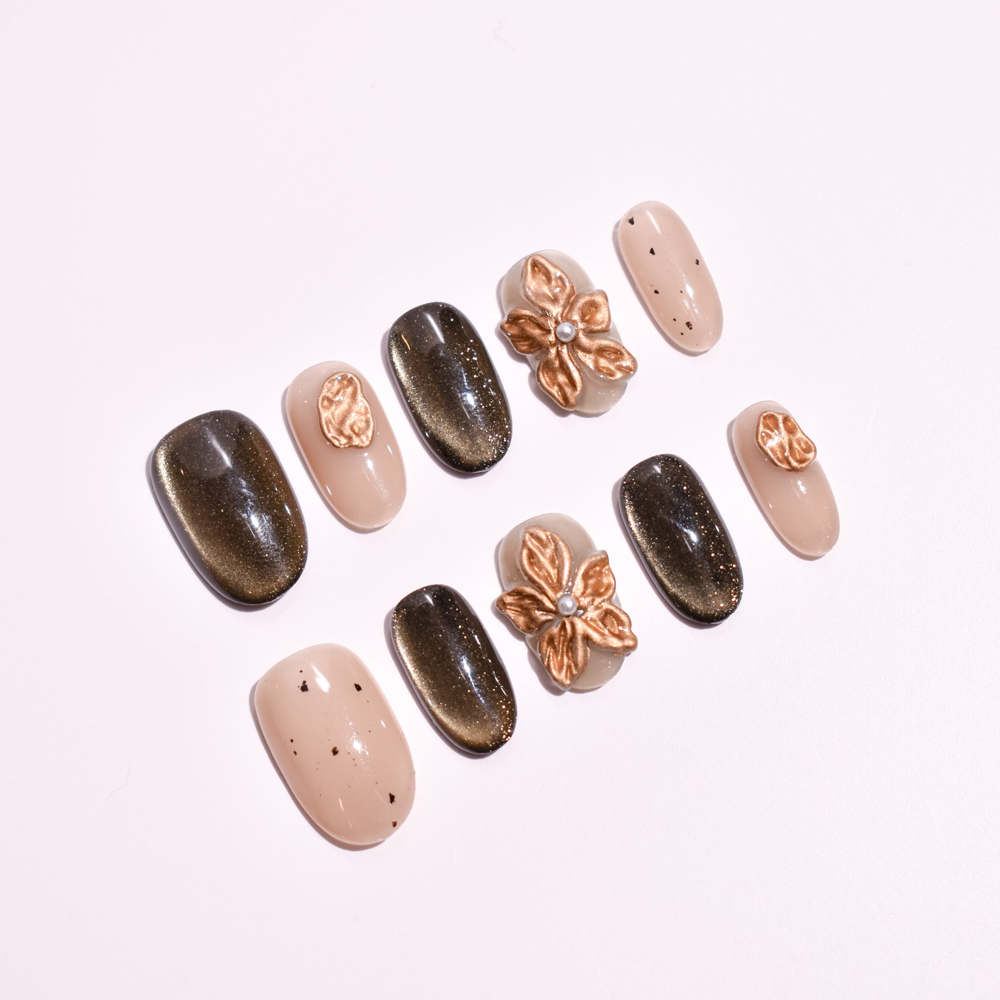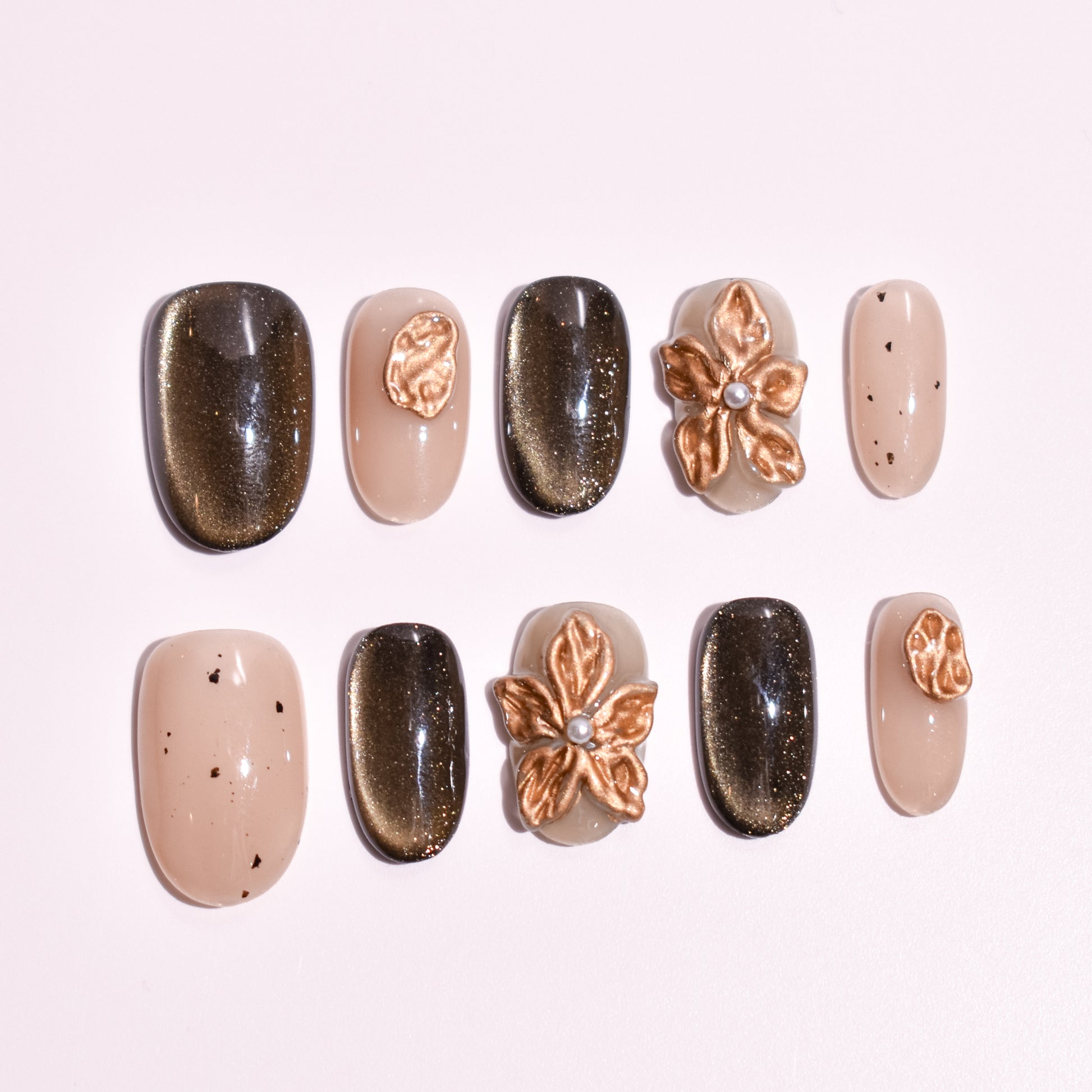 This set blends deep bronze cat-eye shimmer nails with soft nude bases, creating a luxurious contrast between glow and calm. Statement accent nails feature hand-sculpted metallic bronze flowers with pearl centers, adding dimension and a couture feel. Subtle black speckling on select nude nails brings an organic, stone-like texture that grounds the shine.