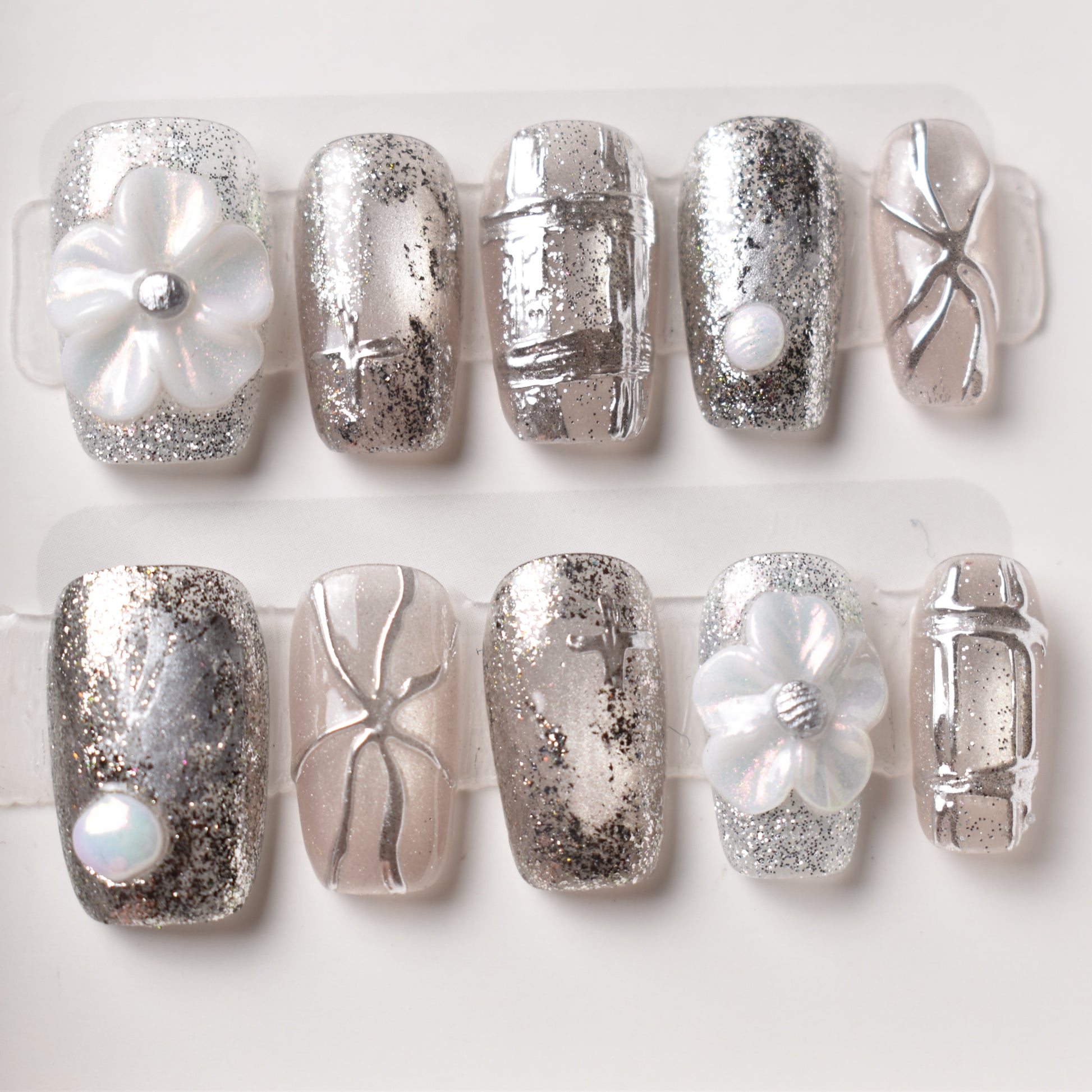 Glamorous yet tender, this set shimmers with silver foil, glitter, and pearlescent flowers. Tiny bows add a romantic touch, while the luminous finish makes each nail feel like a precious keepsake. Ideal for festive occasions, winter soirées, and moments that deserve a little extra sparkle.