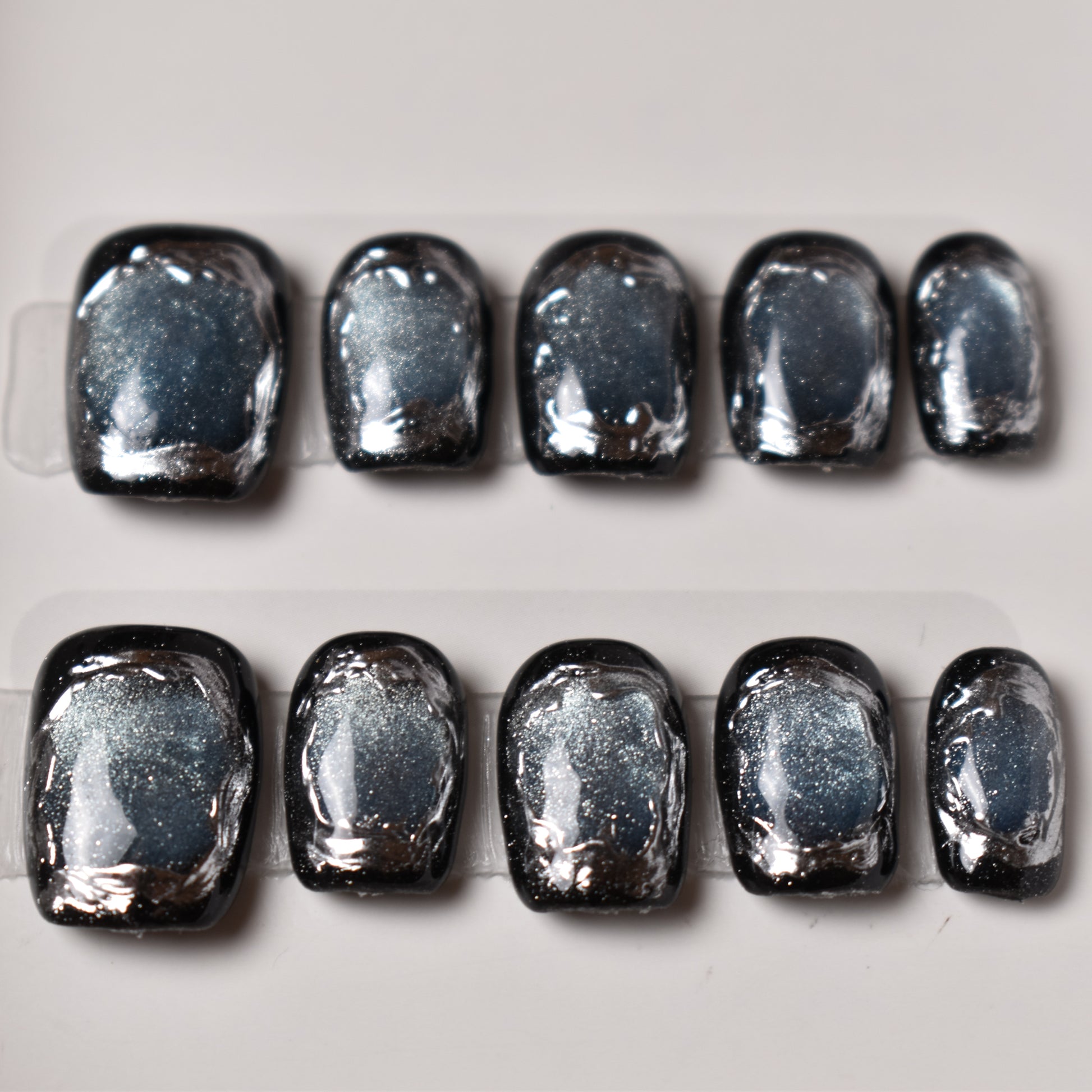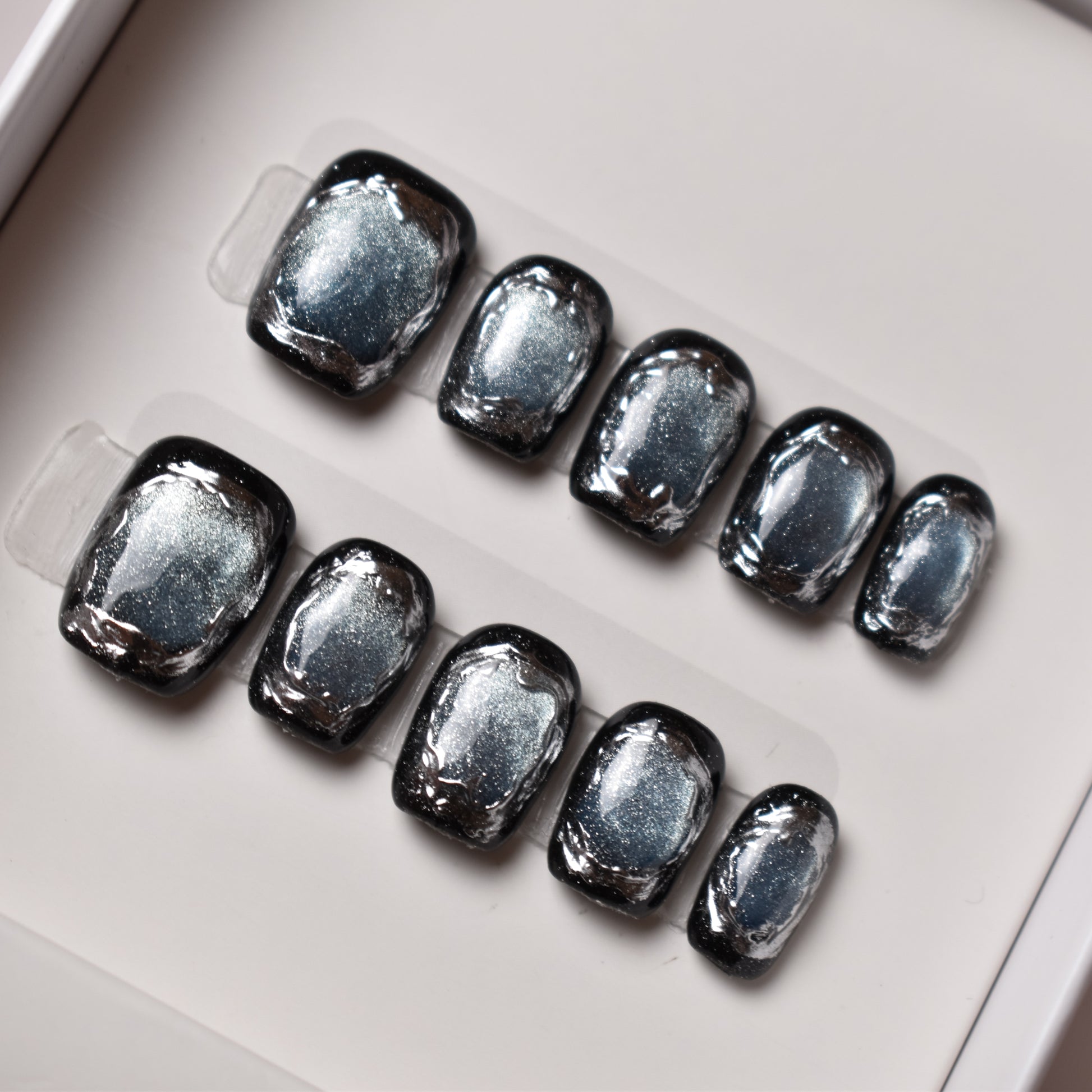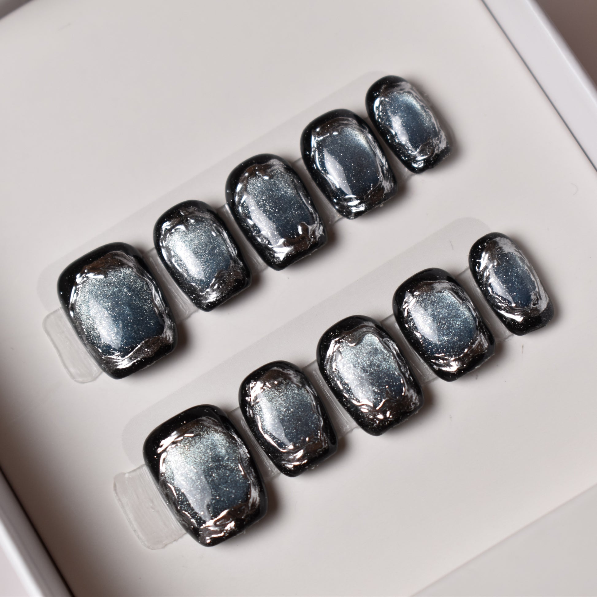 Deep metallic silver shimmers beneath a dark, smoky edge, creating a sleek mirror-like effect. Bold, modern, and powerful, this design is for those who embrace strength and style.