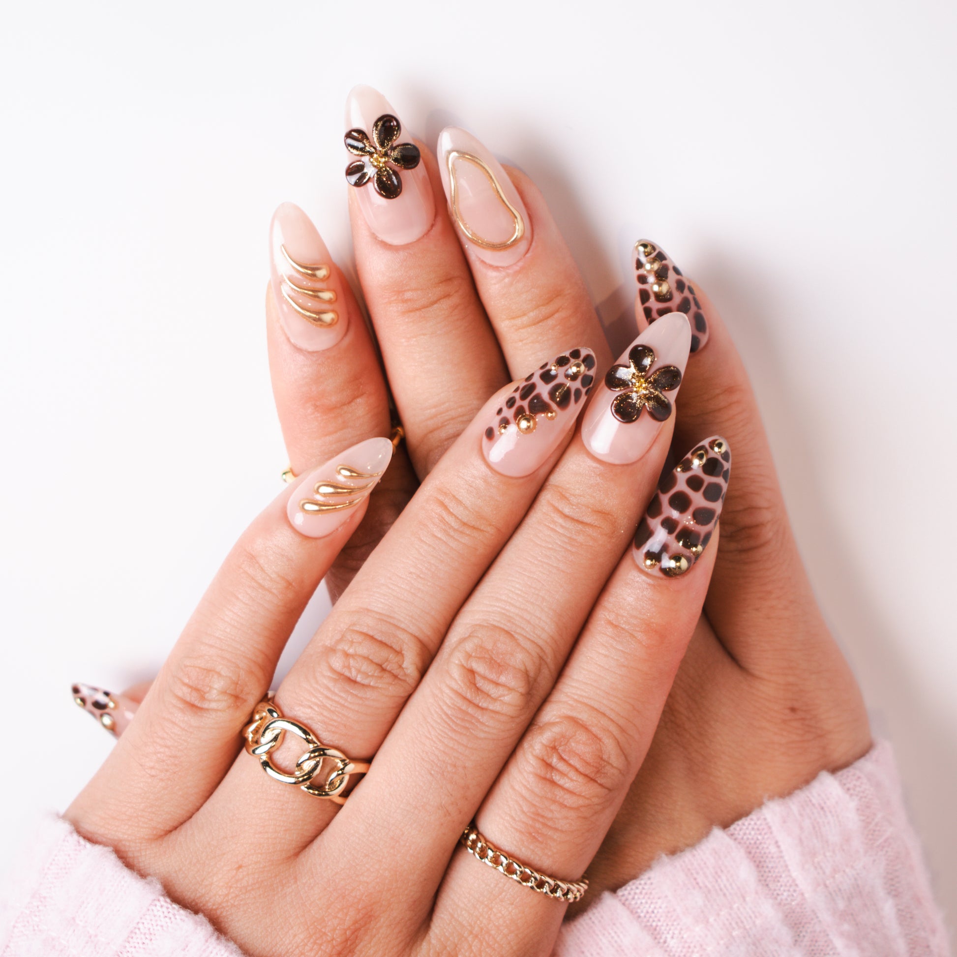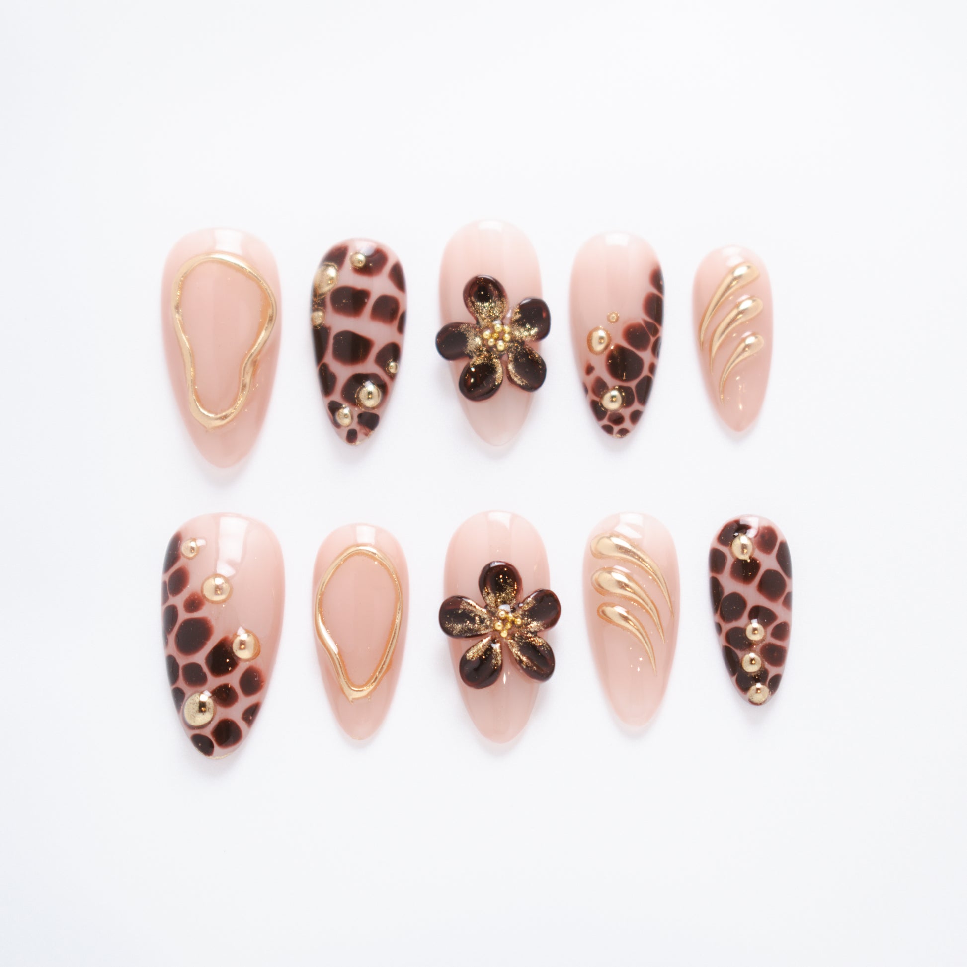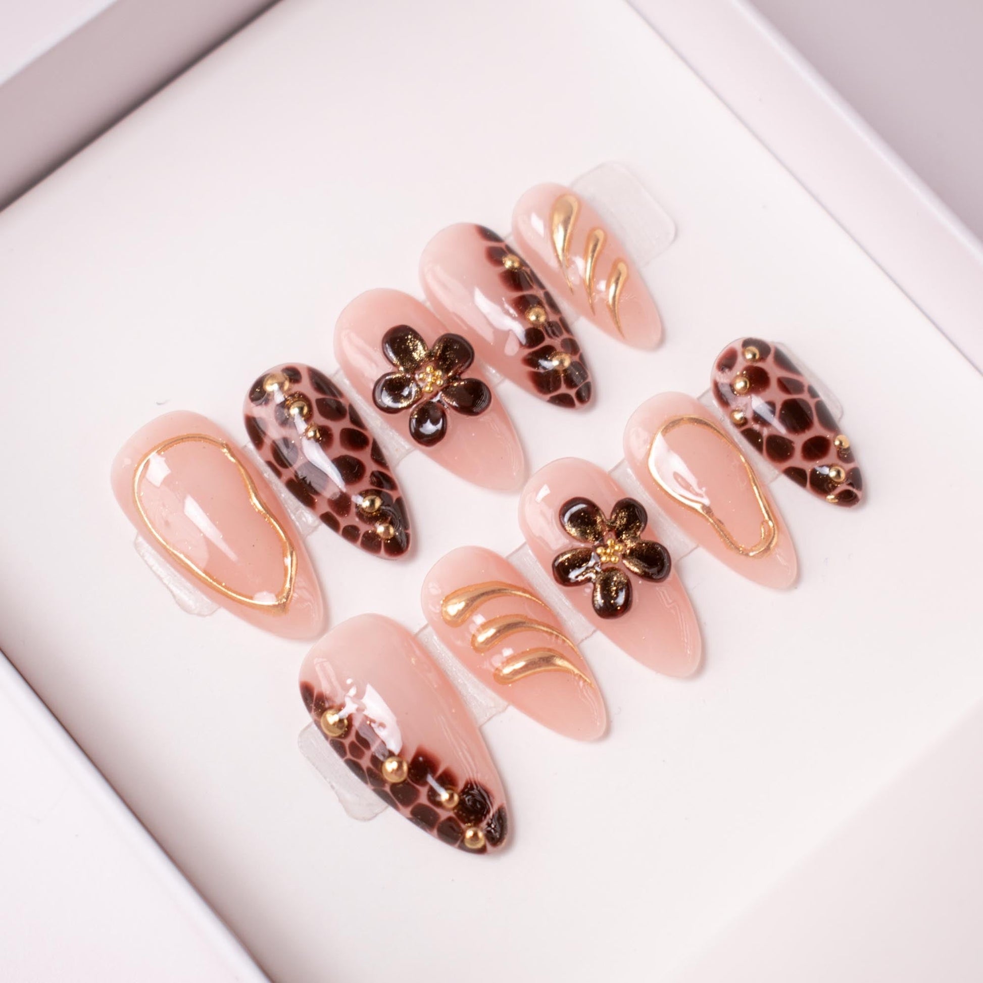 This luxurious set blends the warmth of creamy nude gel with rich, chocolate-brown leopard accents, outlined in delicate gold detailing. Glossy petals in deep espresso shimmer with a dusting of golden glitter, forming bold 3D floral embellishments. Sleek gold wave lines and studded metallic beads add dimension, creating a perfect harmony between wild elegance and refined sophistication. Ideal for autumn evenings, high-fashion gatherings, or anyone wanting a statement nail that’s both fierce and feminine.