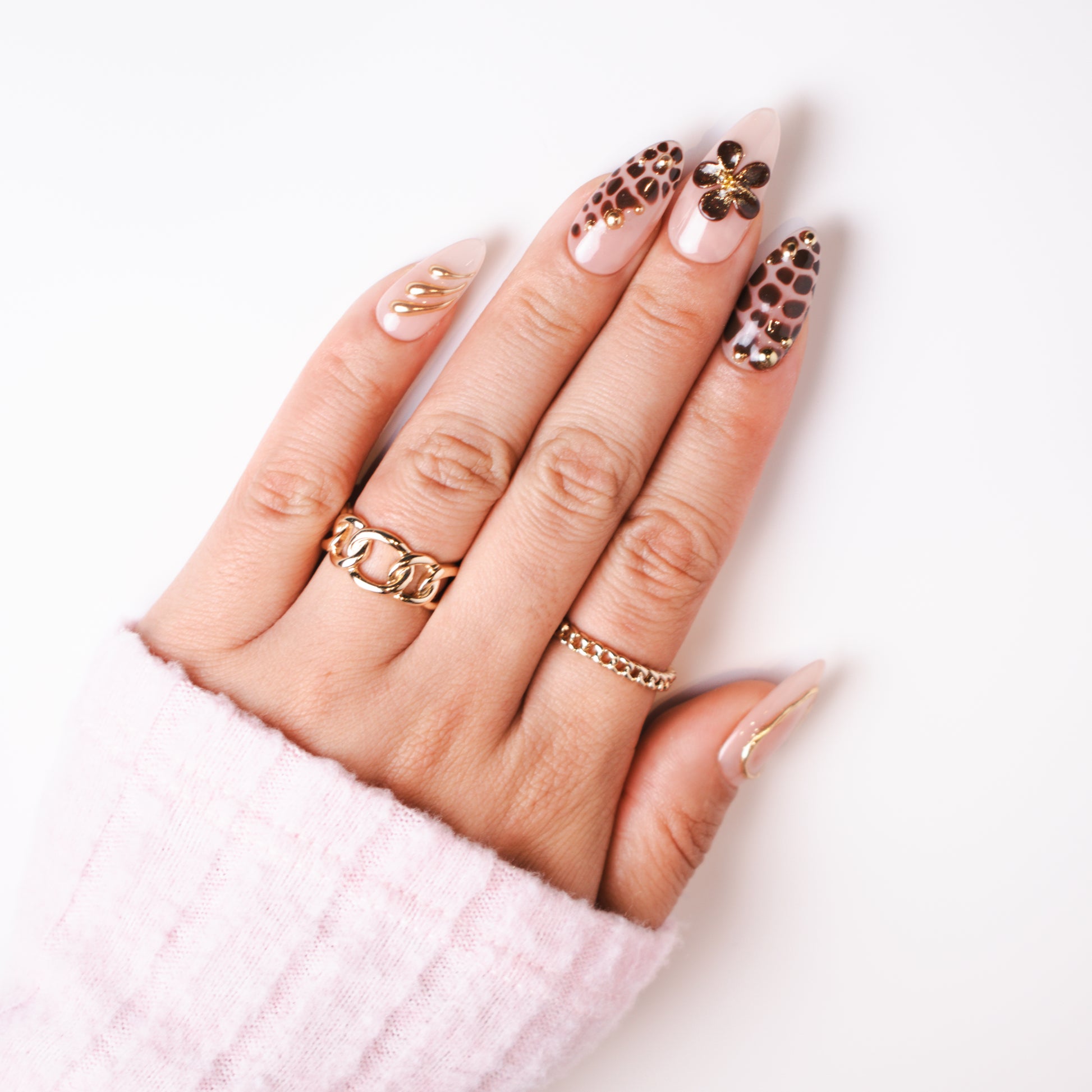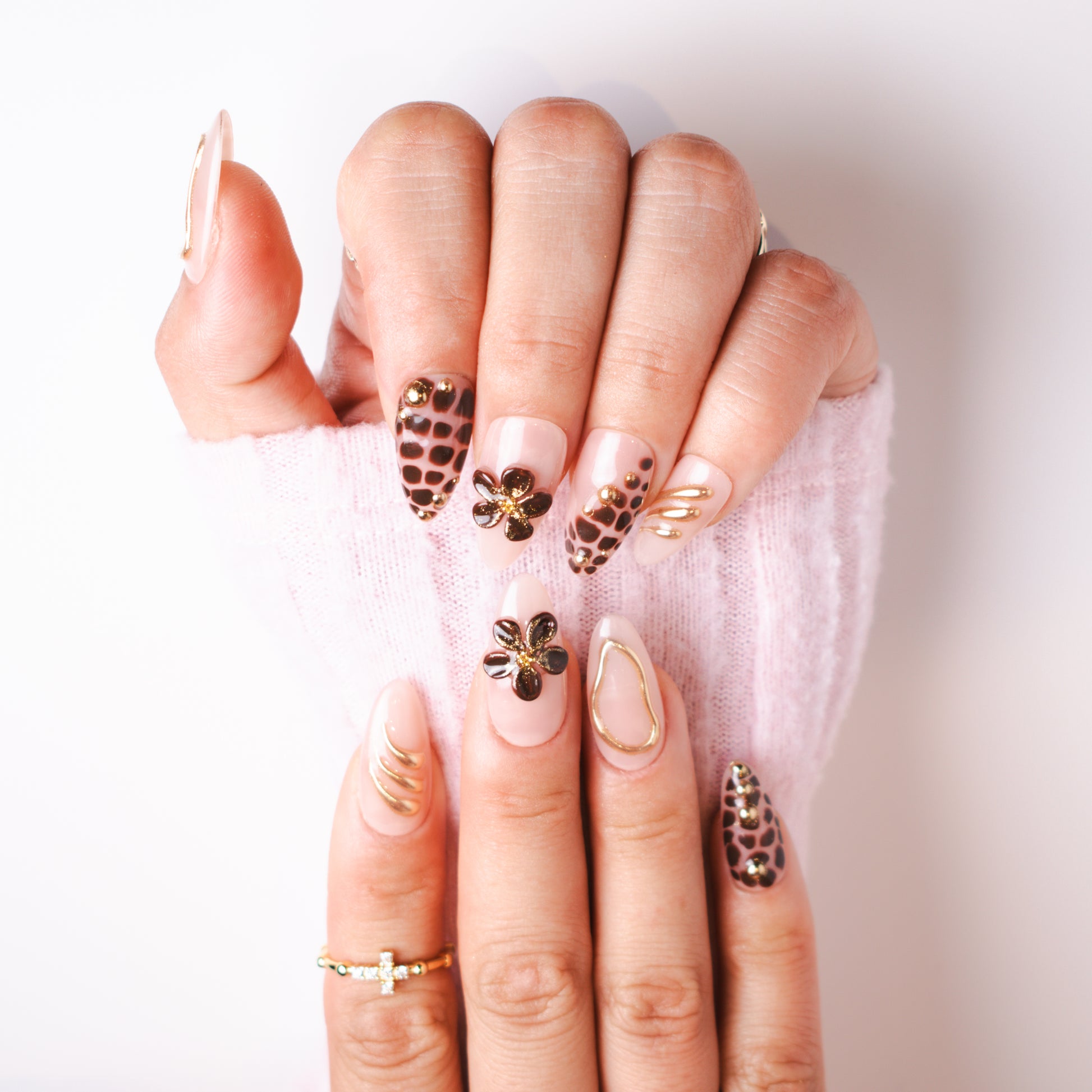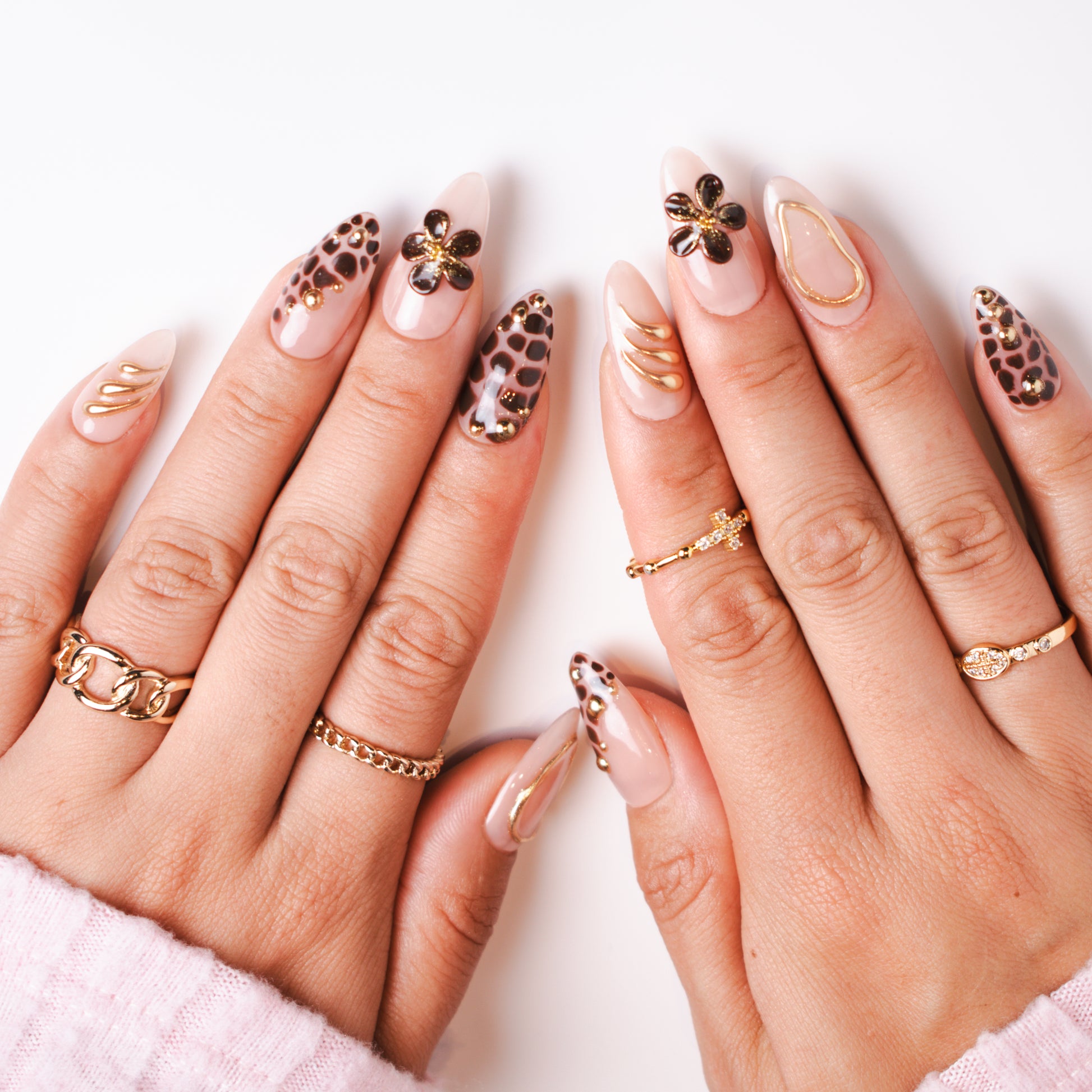 This luxurious set blends the warmth of creamy nude gel with rich, chocolate-brown leopard accents, outlined in delicate gold detailing. Glossy petals in deep espresso shimmer with a dusting of golden glitter, forming bold 3D floral embellishments. Sleek gold wave lines and studded metallic beads add dimension, creating a perfect harmony between wild elegance and refined sophistication. Ideal for autumn evenings, high-fashion gatherings, or anyone wanting a statement nail that’s both fierce and feminine.