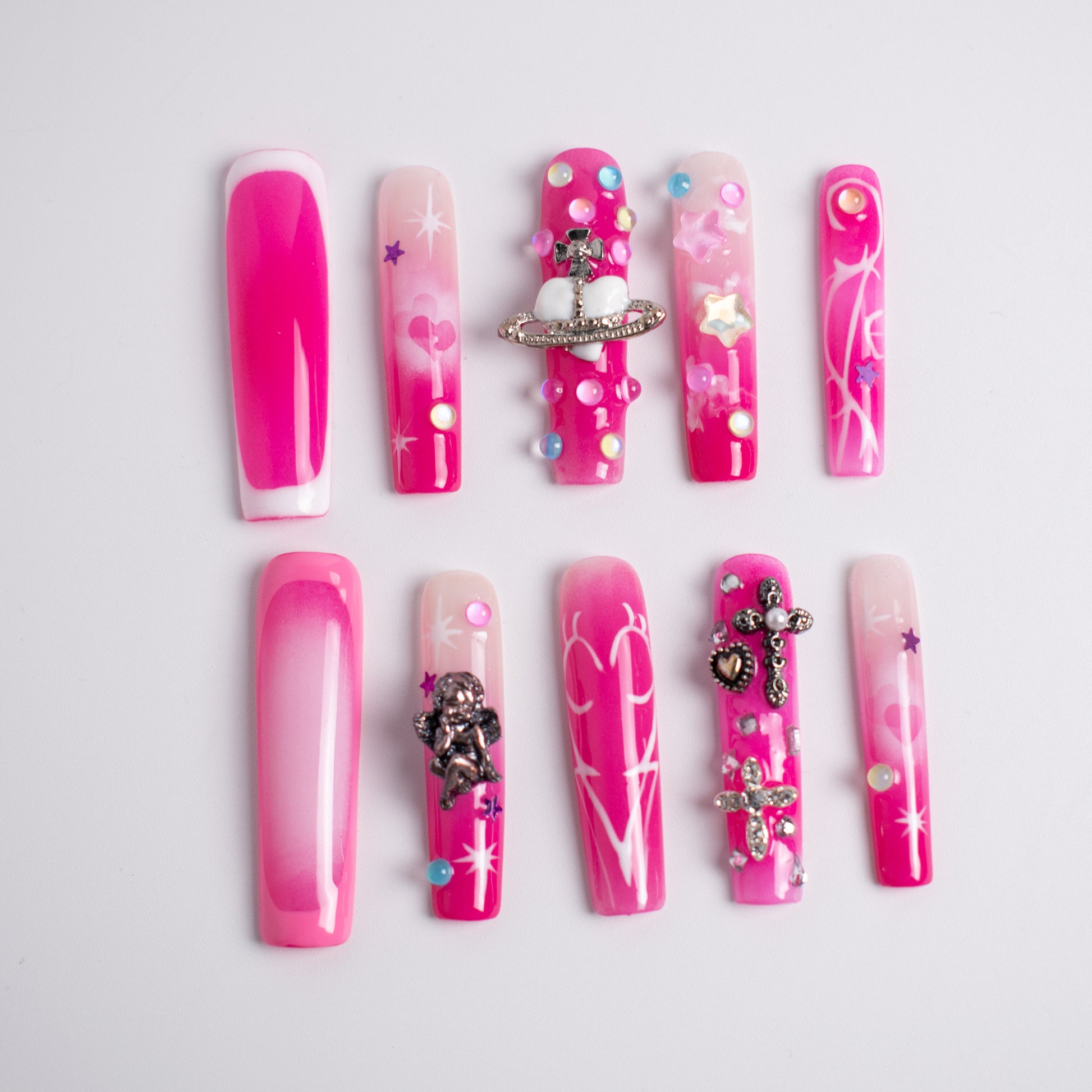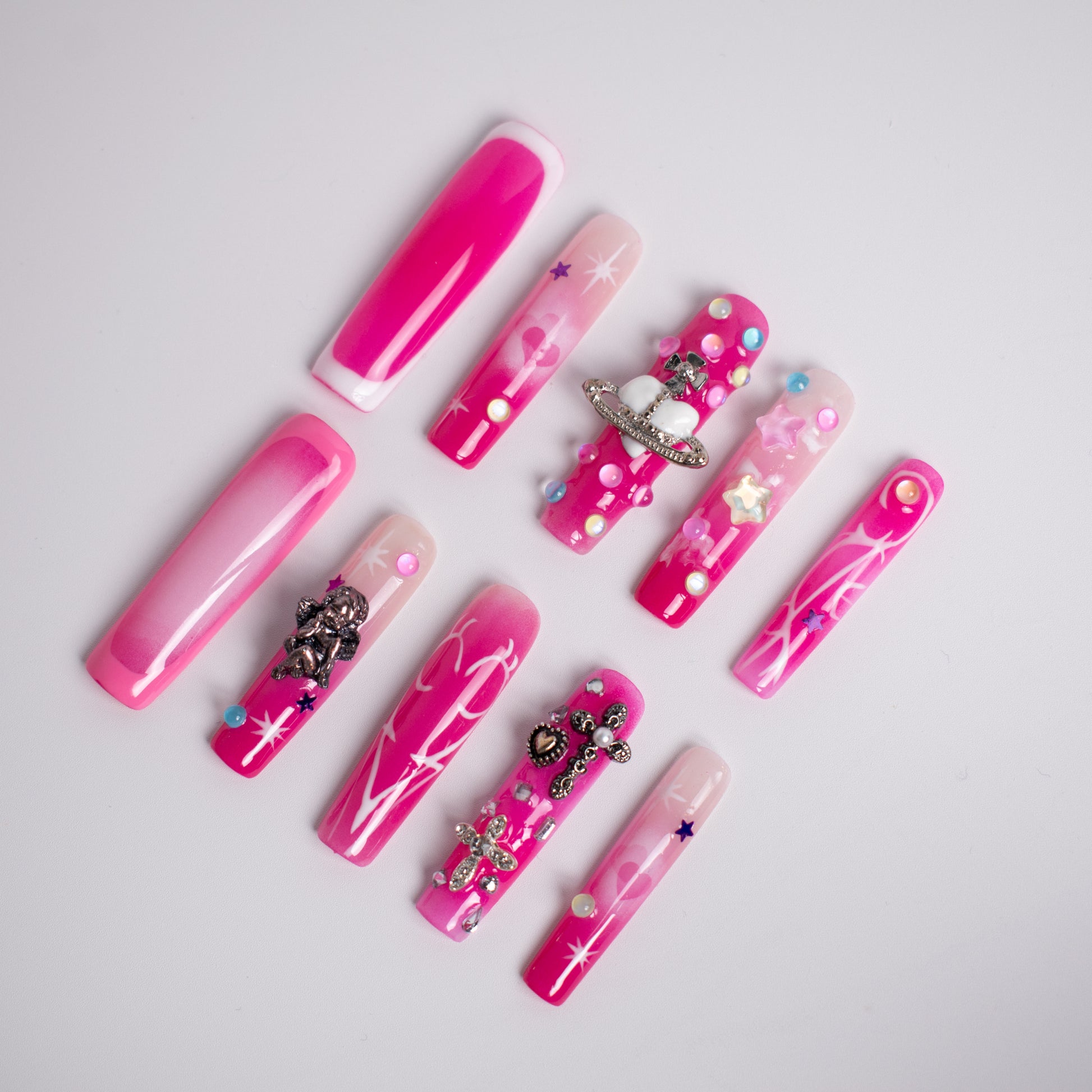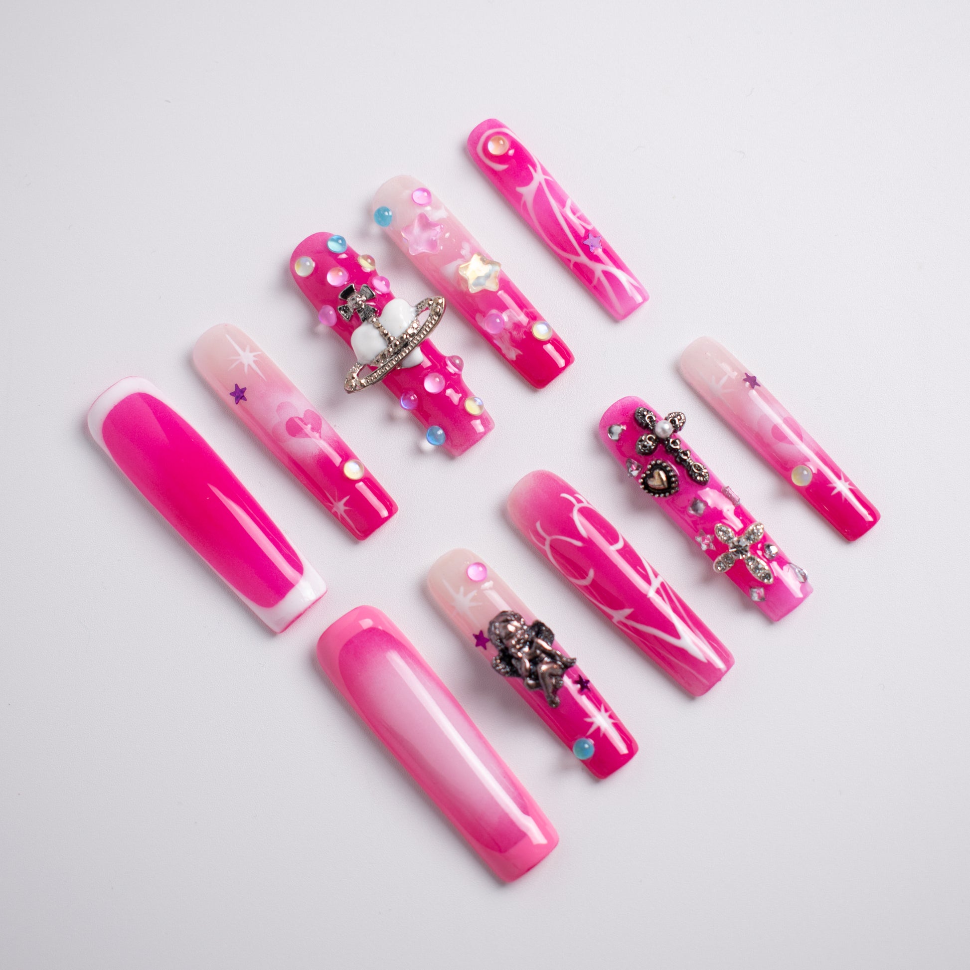- 10 uniquely designed, hand-painted press-on nails made with high-quality UV gel.